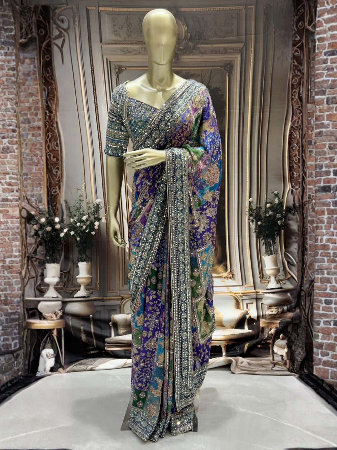 Chhabra 555 This statement saree features a multicolour digital-print base with paisley and floral panels in purple, teal, green and gold, highlighted by dense all-over mirror and stone hand-embellishment that adds high-impact sparkle for weddings or cocktails. The matching stitched blouse is equally ornate with mirror, cut-dana and zari lines across the body and sleeves, while the saree is framed by multiple rows of intricately patterned embroidered borders for a couture finish.