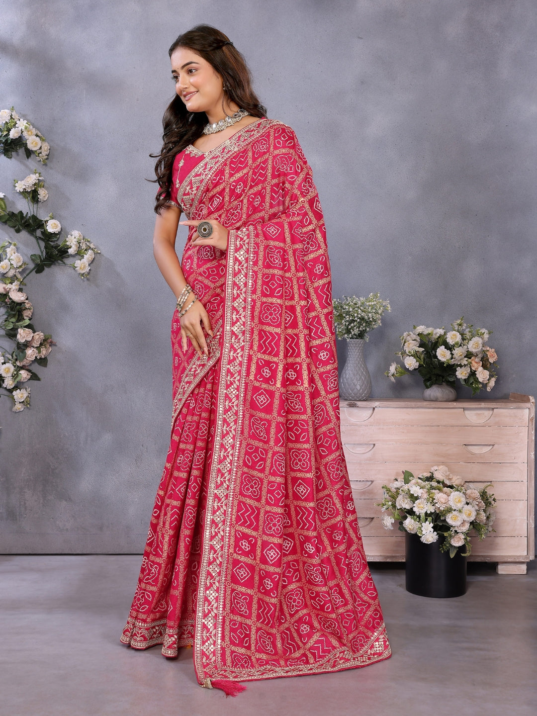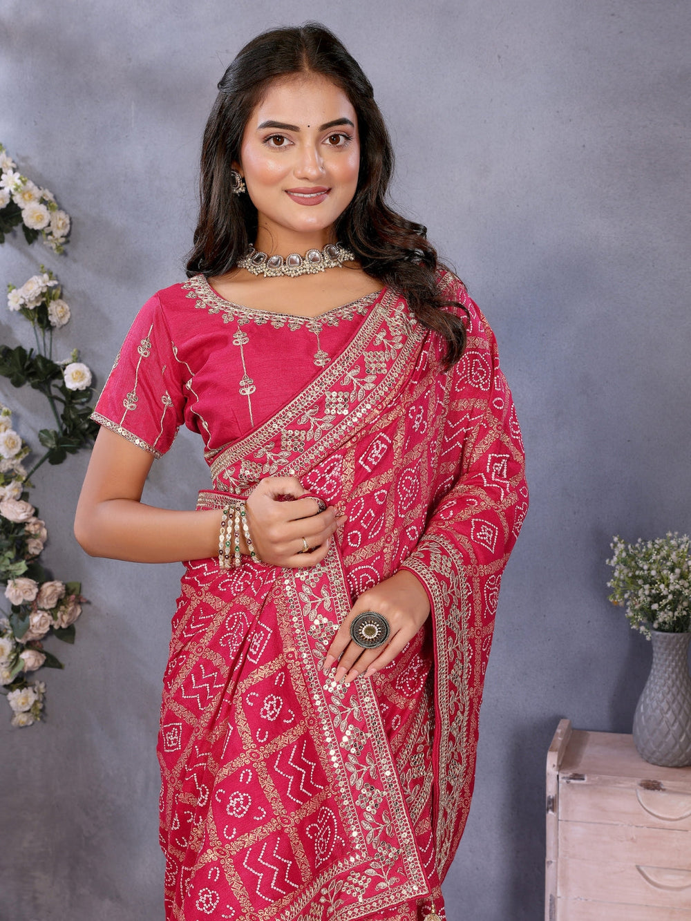 Digital-print saree with heavy mirror, stone & zari embroidered border and blouse.