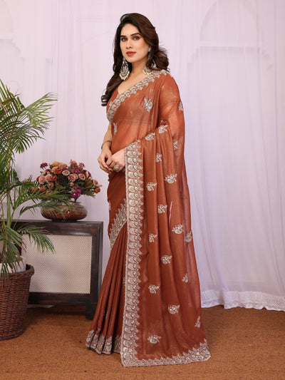 Chhabra 555 intricate gold zari woven floral motifs across the body. The saree features beautifully detailed brocade work, highlighted with gold and red weaving, making it stand out for festive or wedding occasions. Its border and pallu showcase rich floral and paisley patterns woven in gold threads