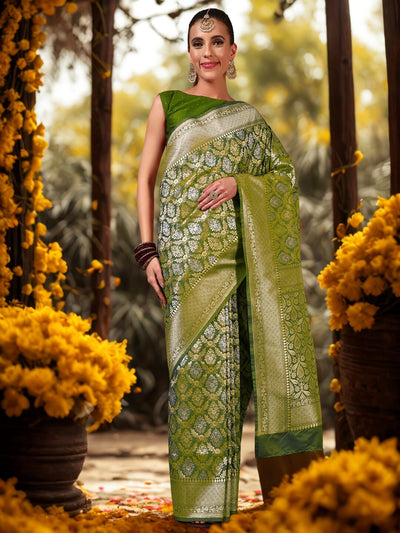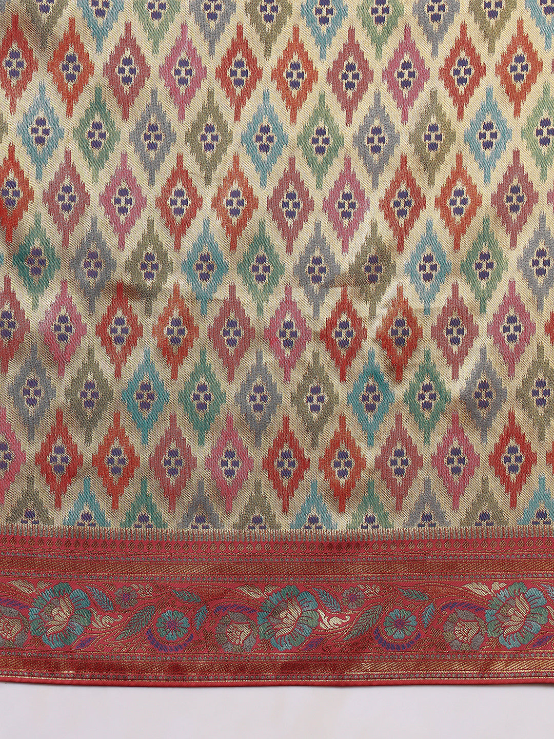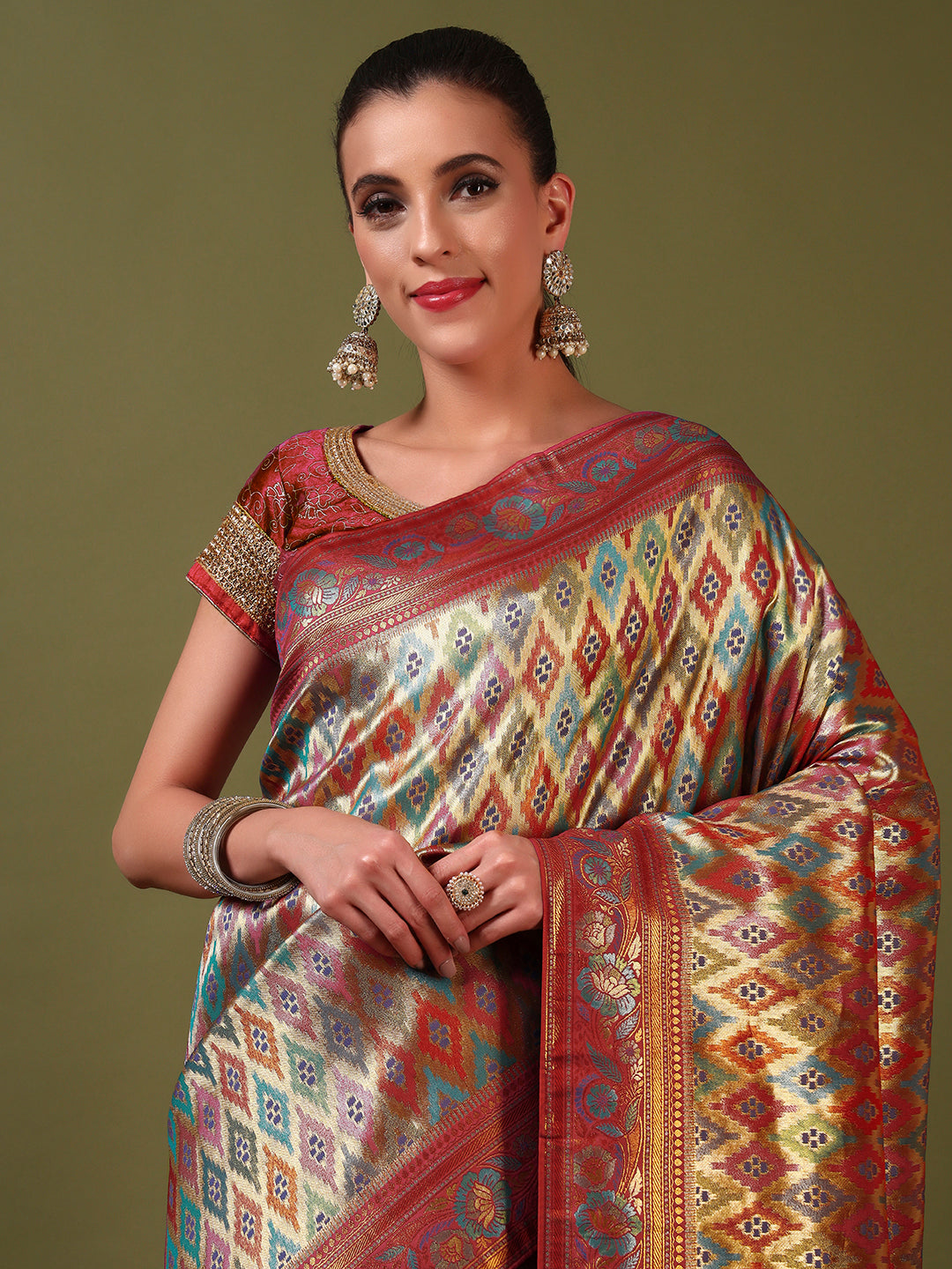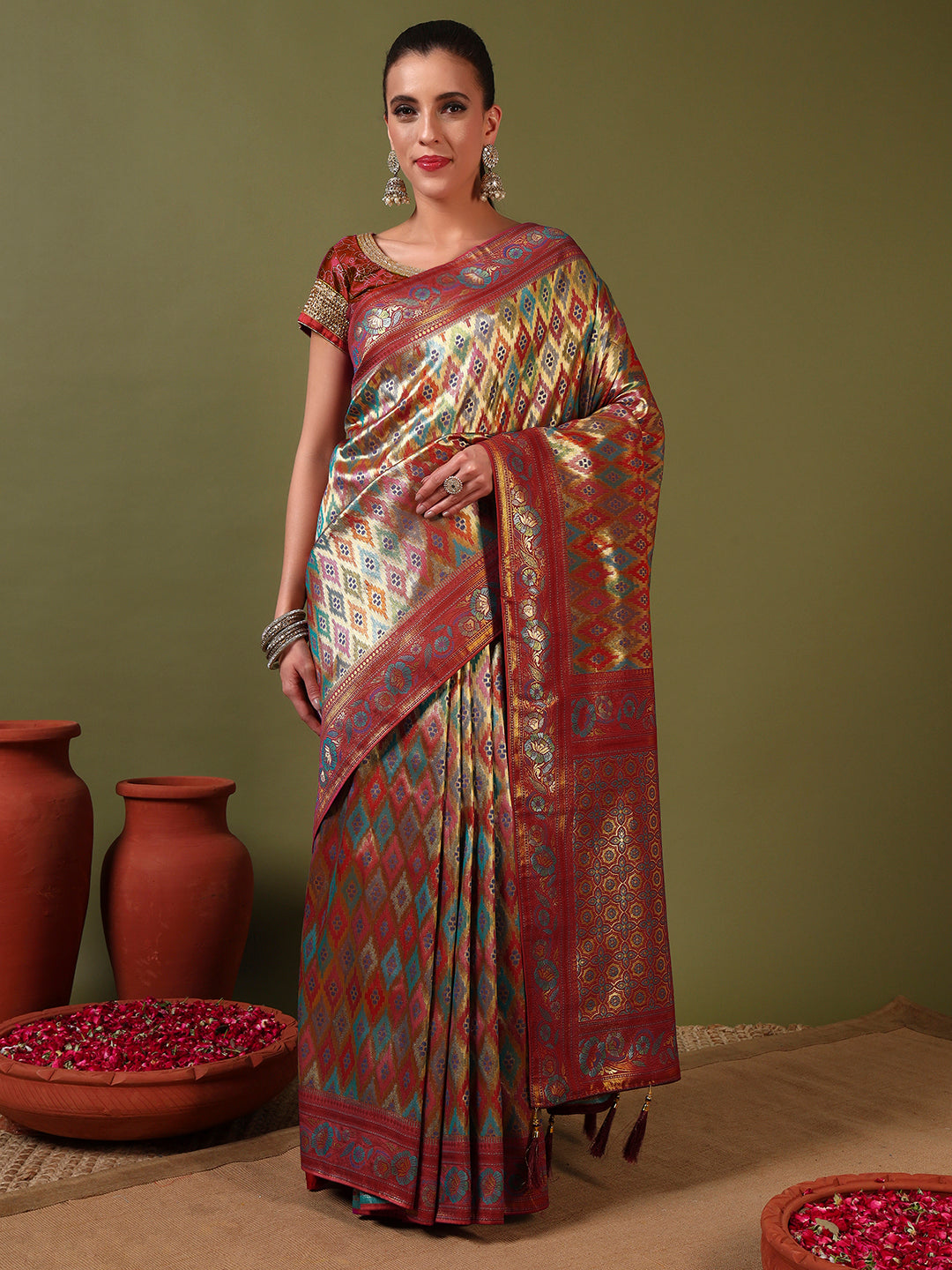 Zari Woven Saree with Gold Floral Motifs and Traditional Brocade Border