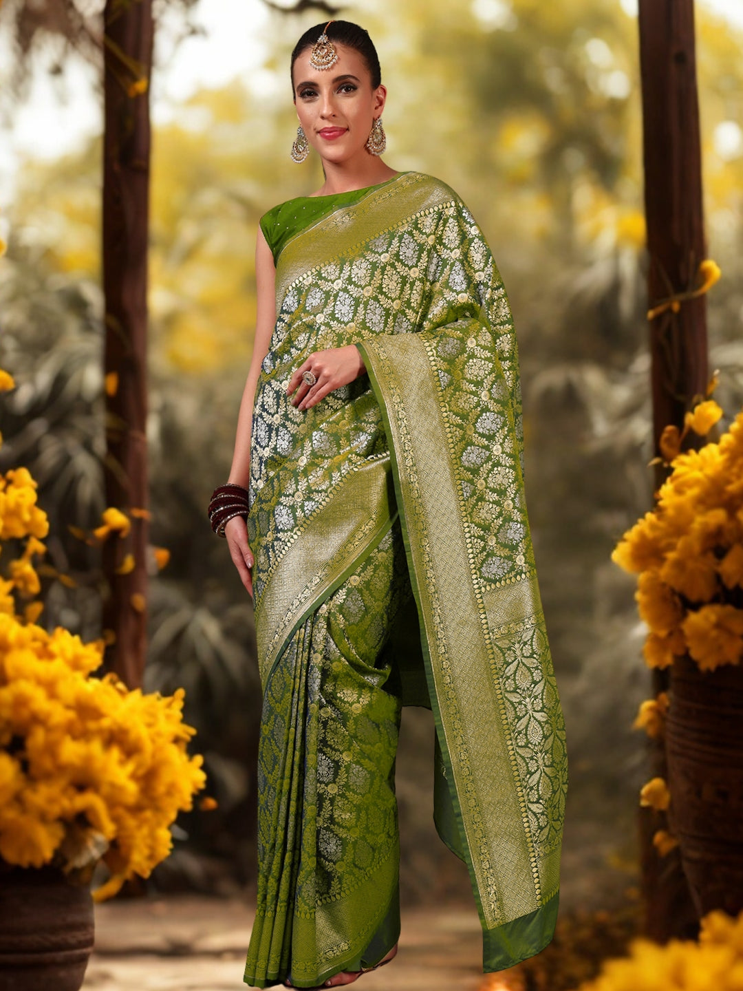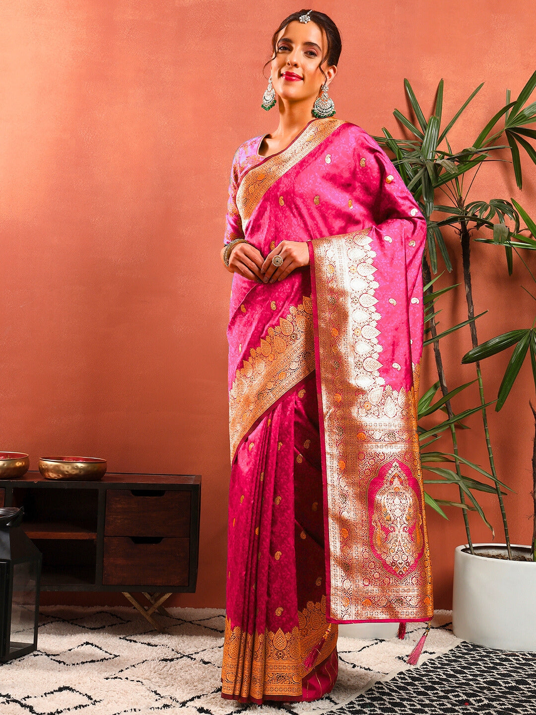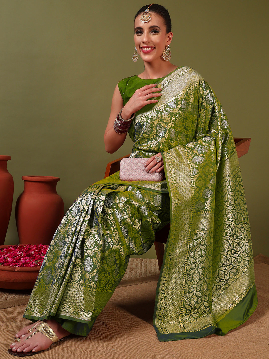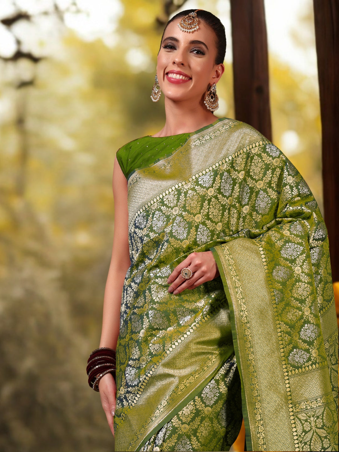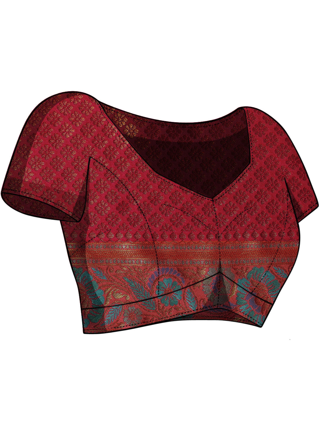 Pattern: All-over woven floral motifs on the body with a broad, intricately designed paisley and floral brocade border and pallu