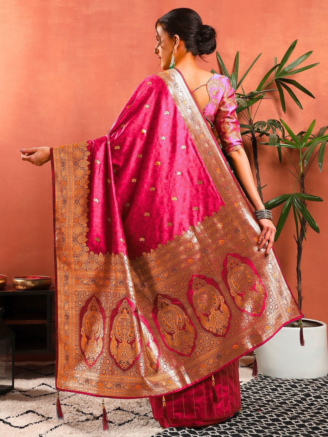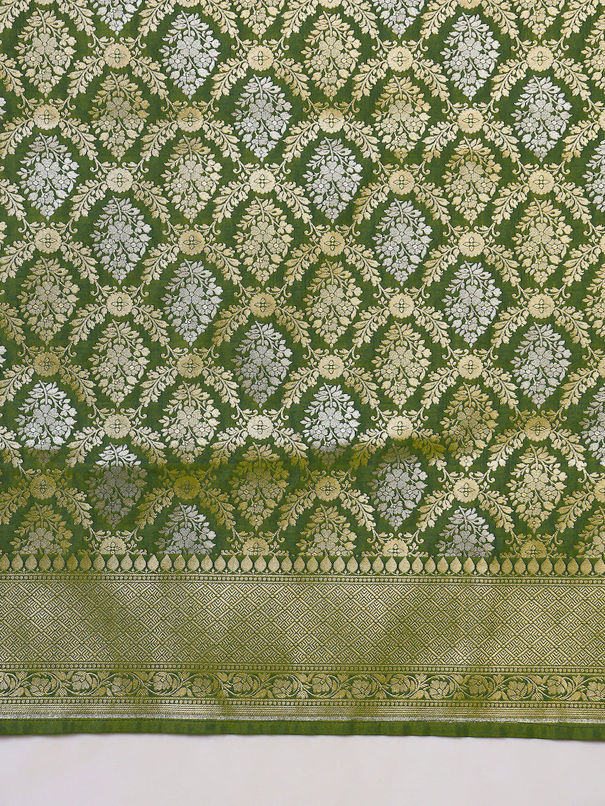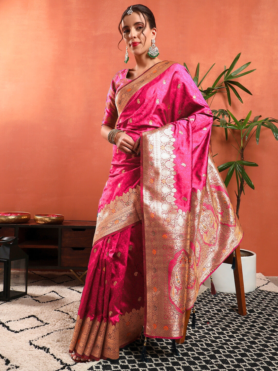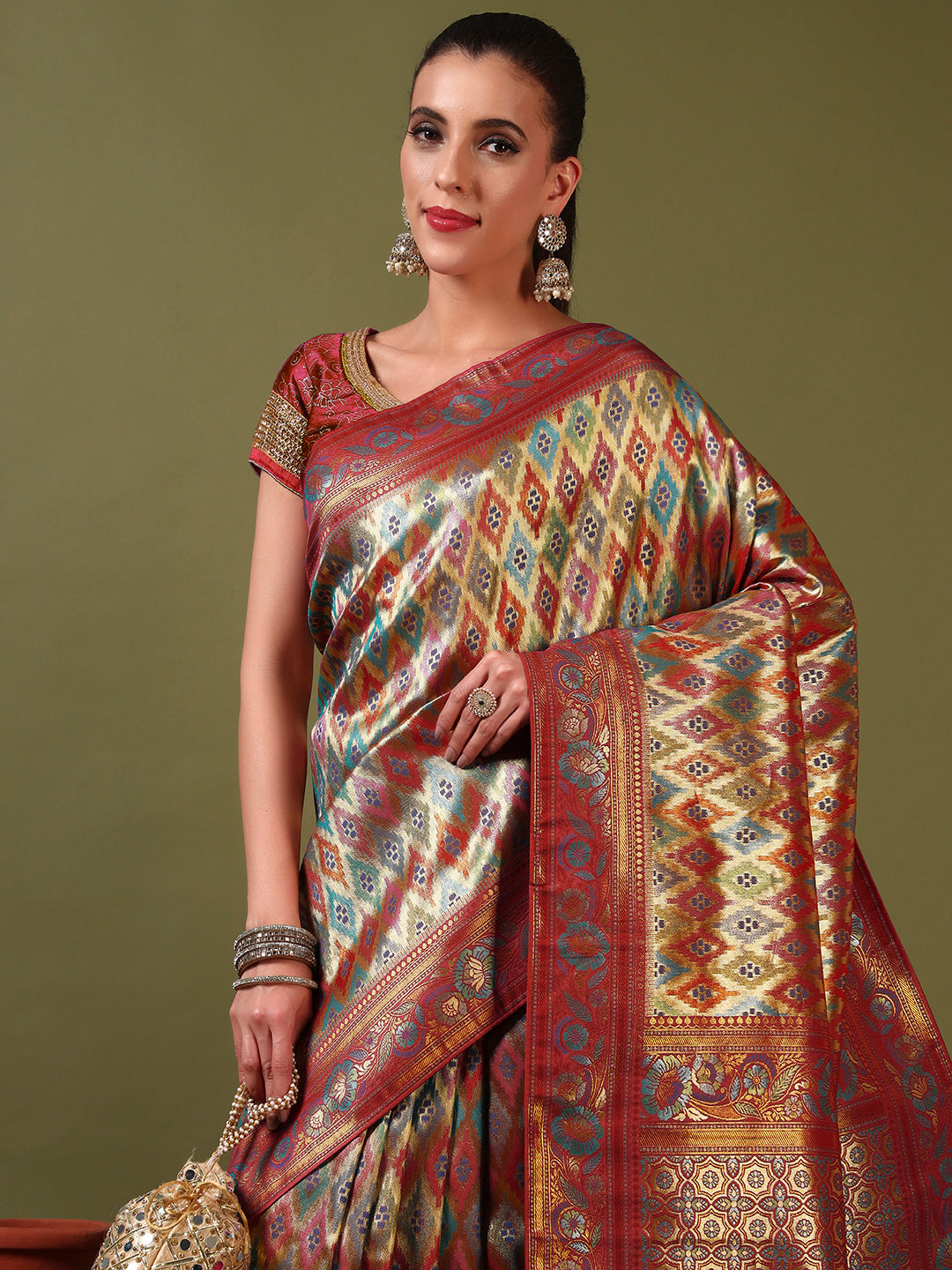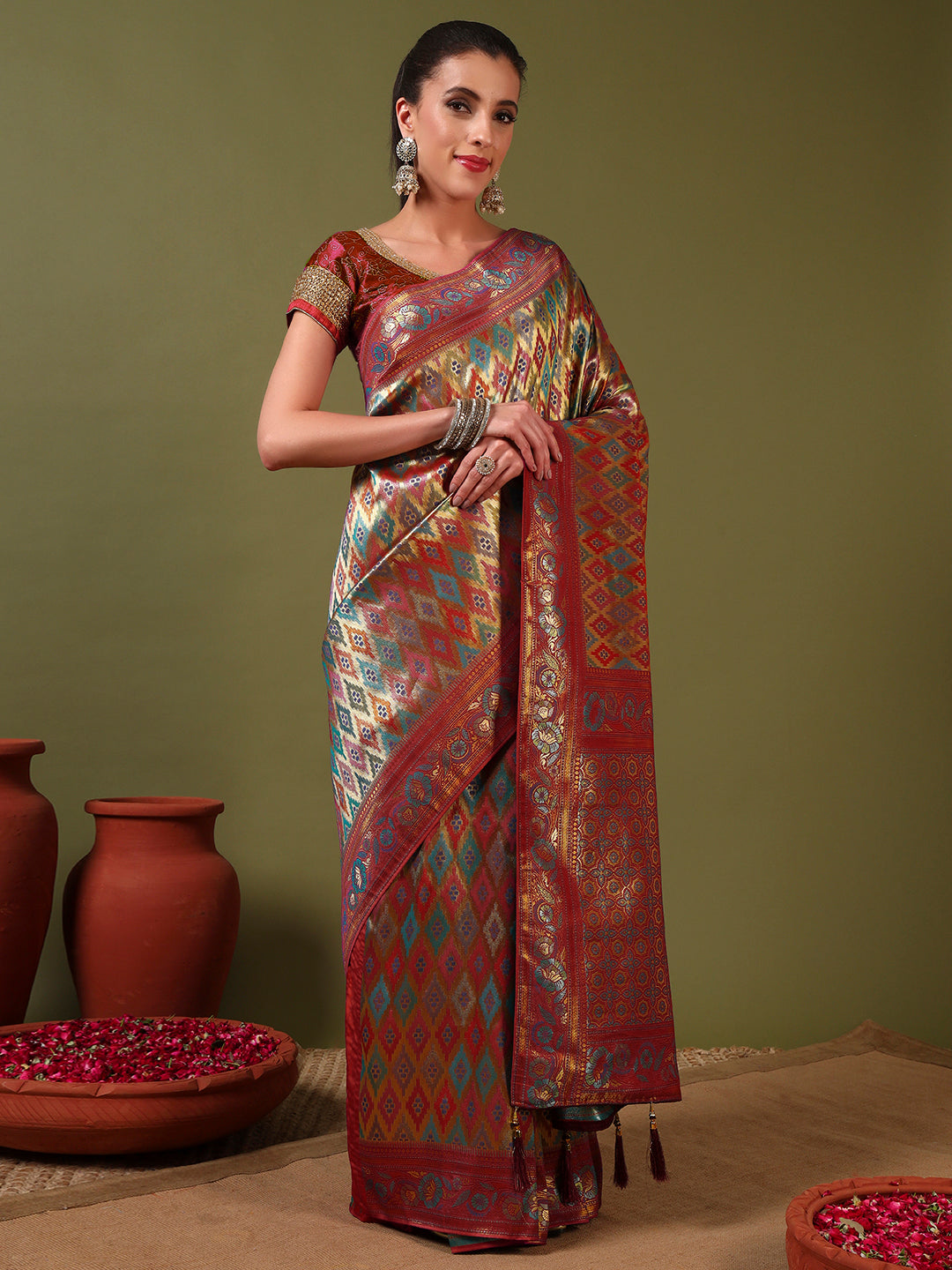 Pattern: All-over woven floral motifs on the body with a broad, intricately designed paisley and floral brocade border and pallu
