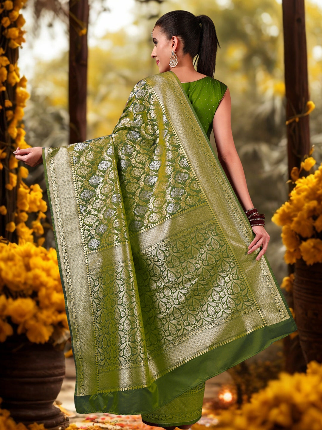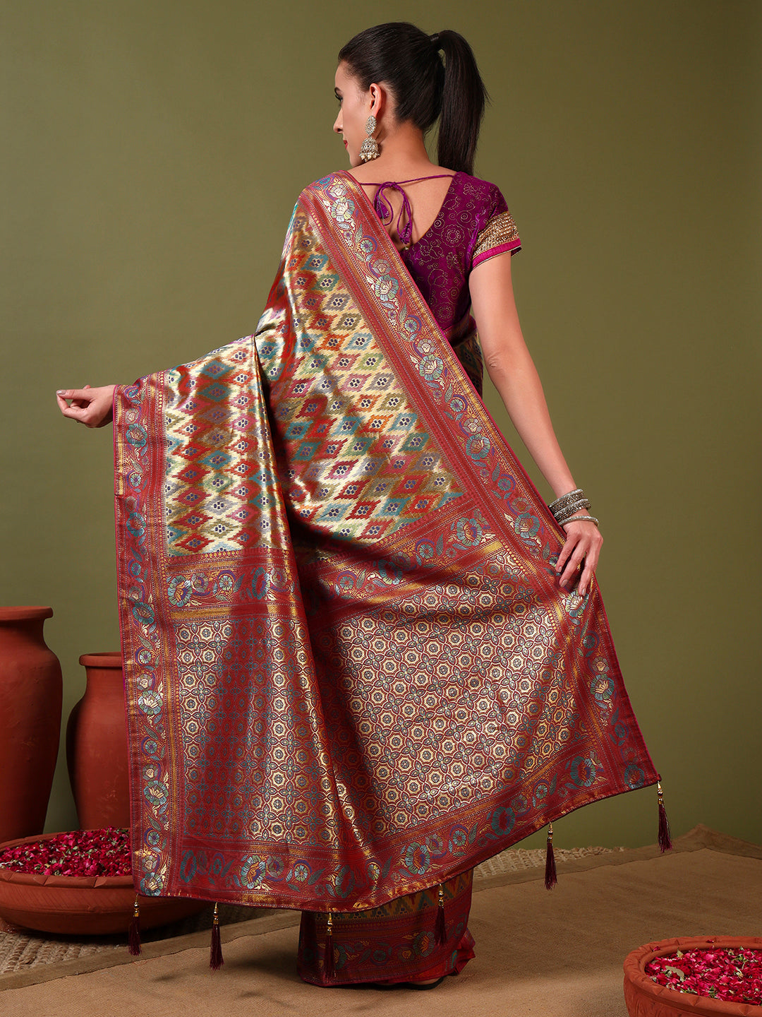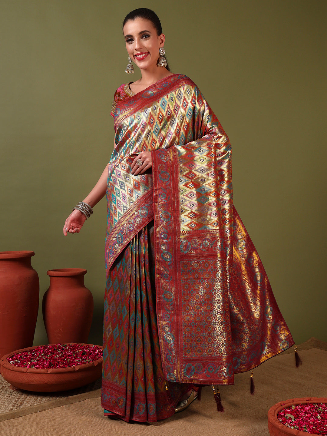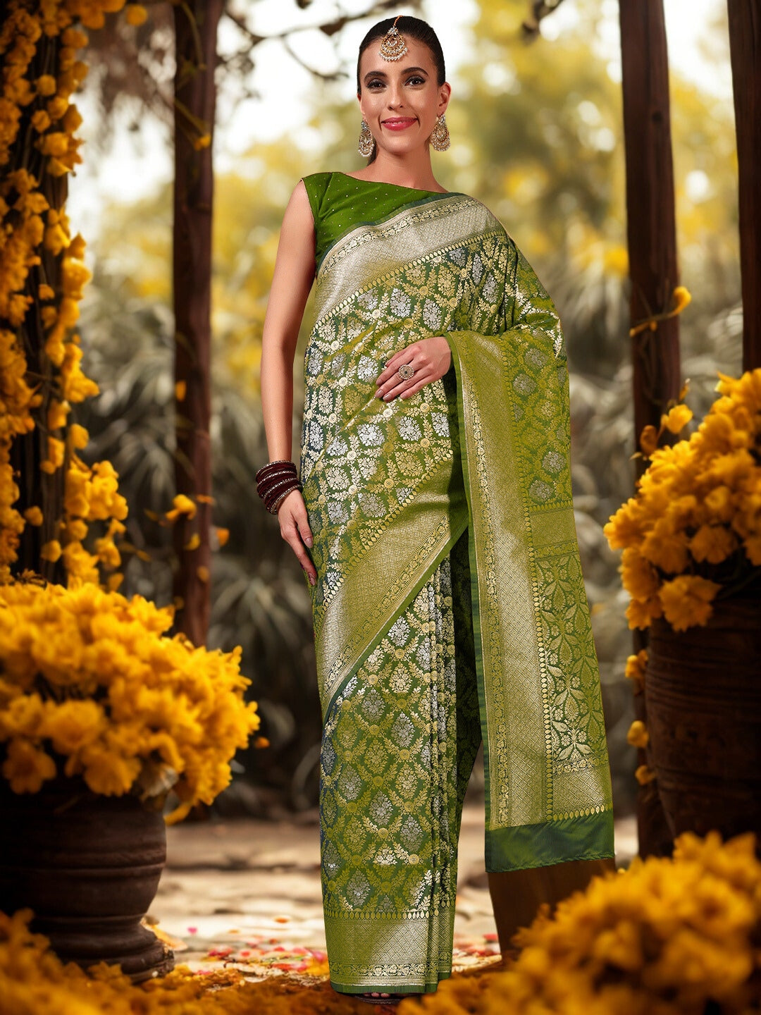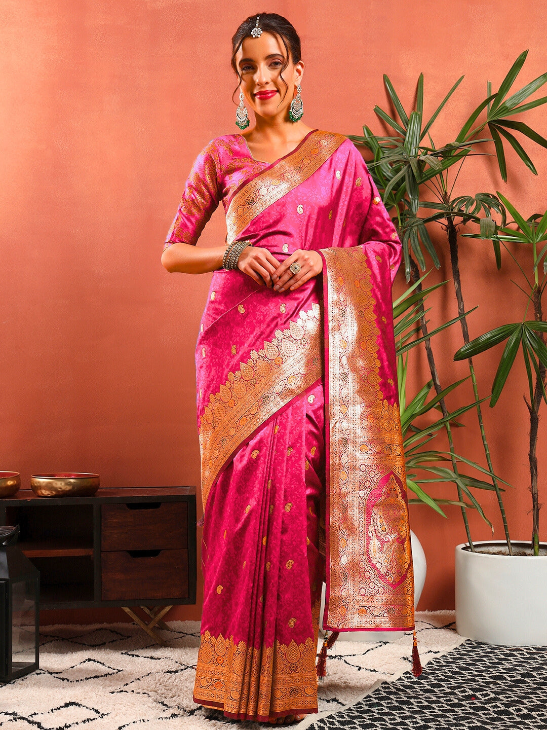 Pattern: All-over woven floral motifs on the body with a broad, intricately designed paisley and floral brocade border and pallu