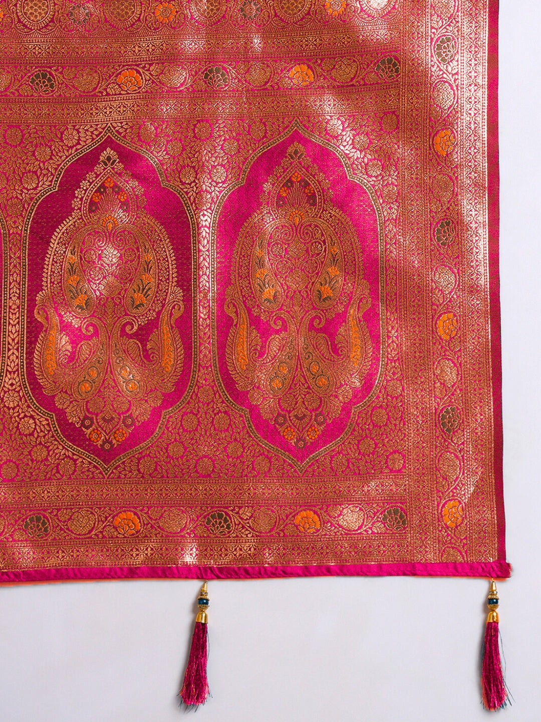 Border: Broad golden brocade border with detailed floral and paisley weaving, finished with orange tassels on the pallu.