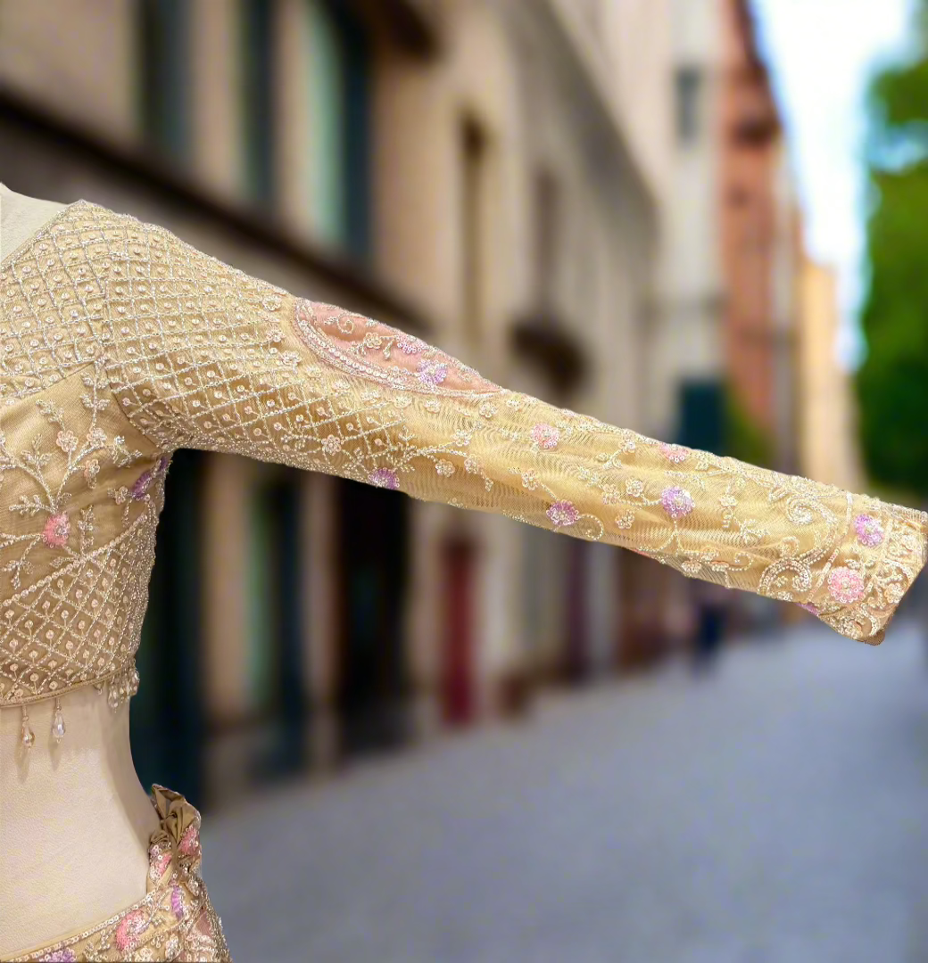 Soft Gold Embroidered Net Lehenga