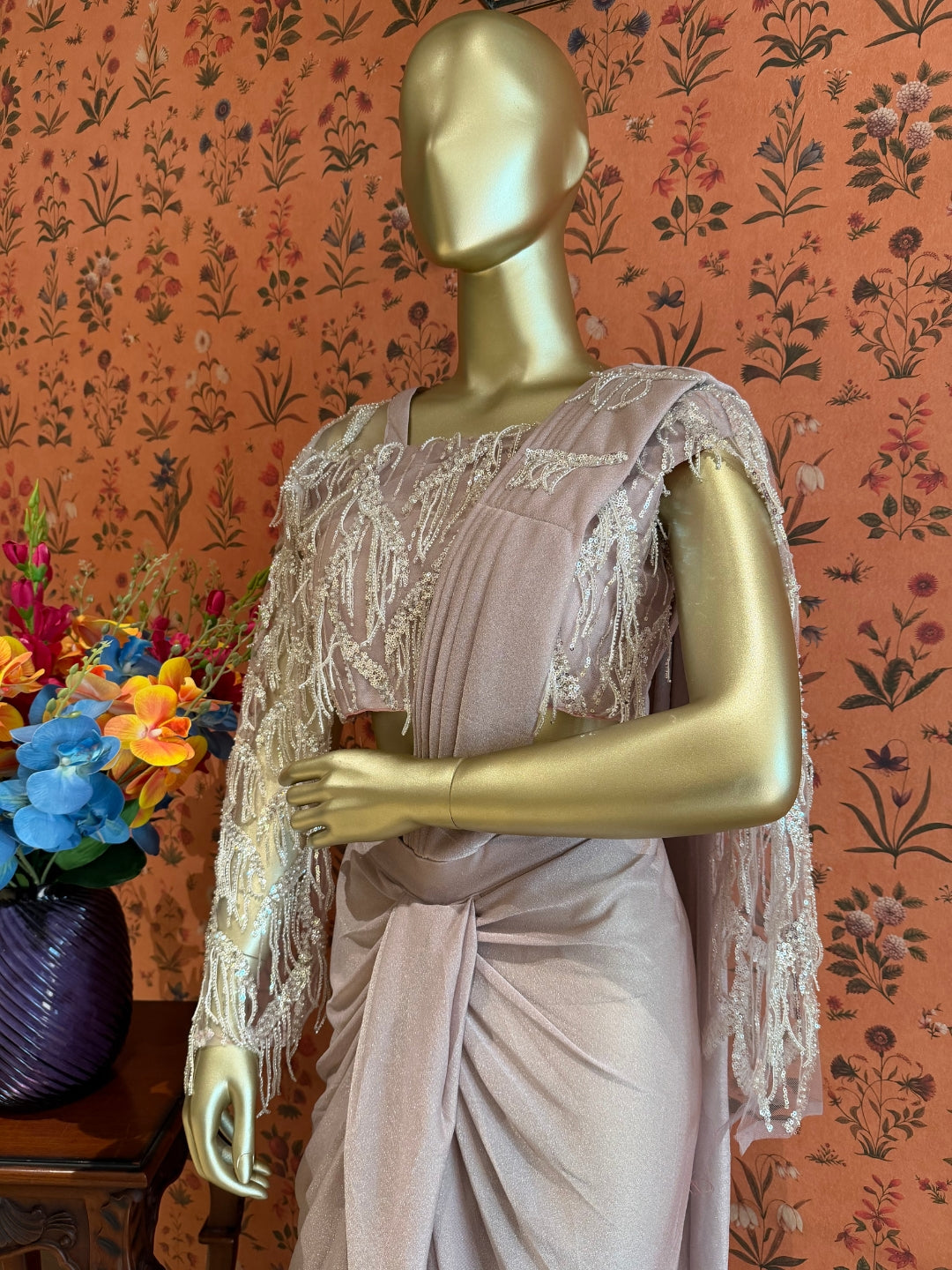 Dusty Mauve Shimmer Draped Saree with Beaded Fringe Embroidered Cape Blouse