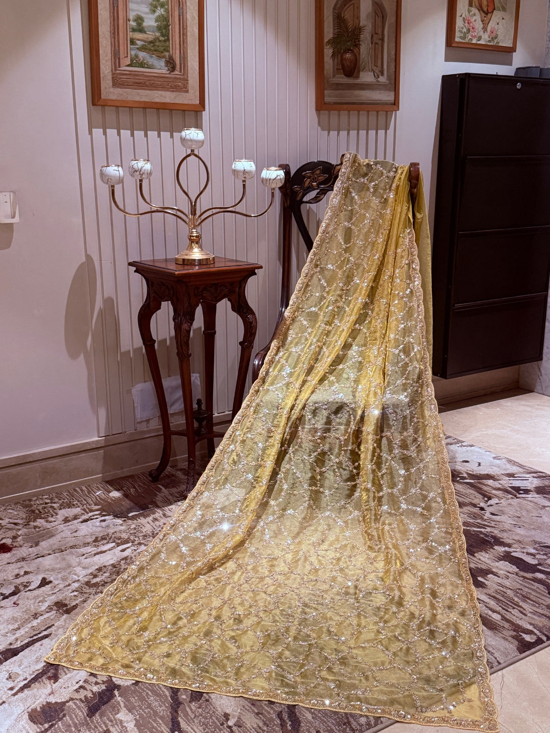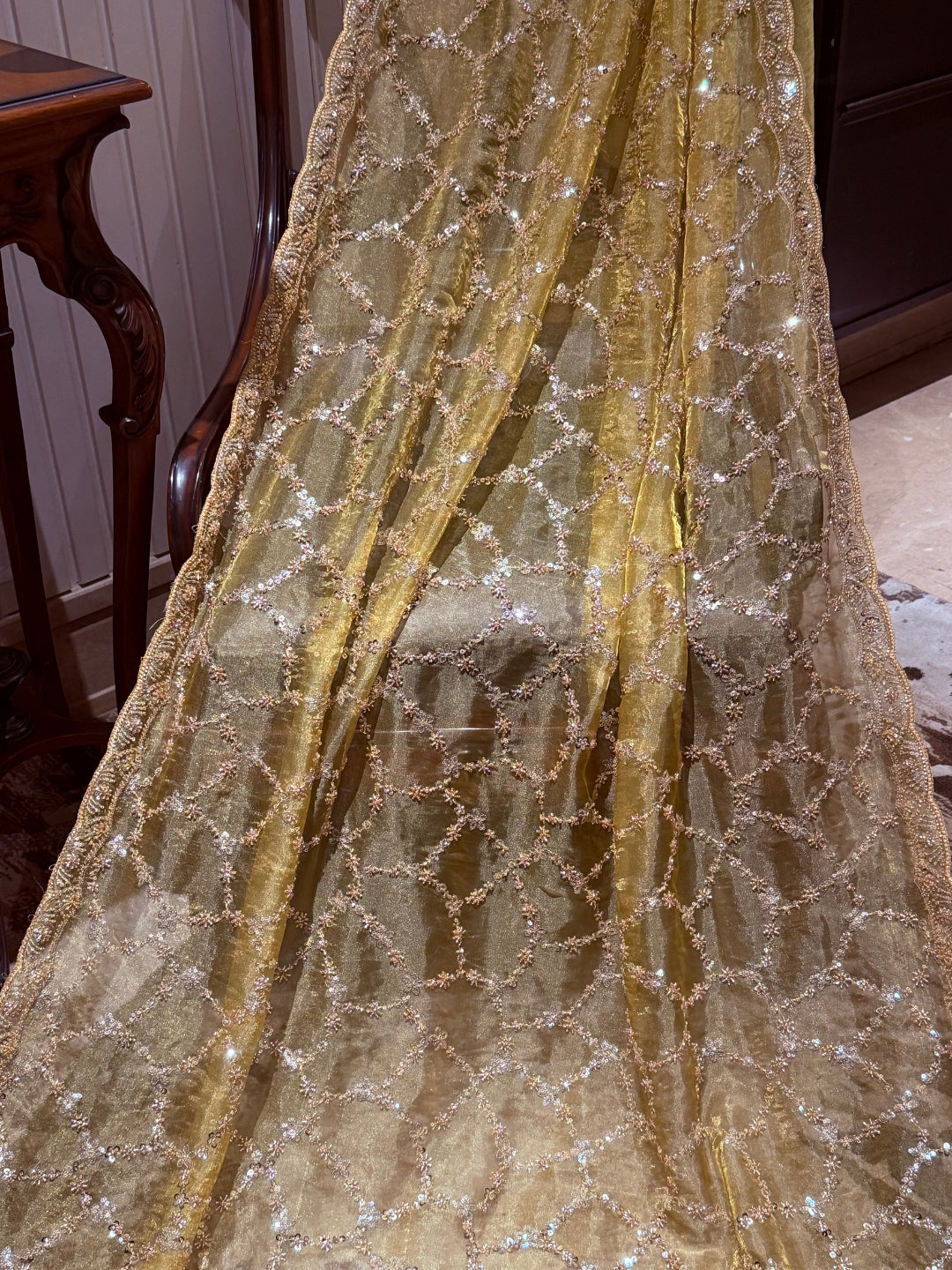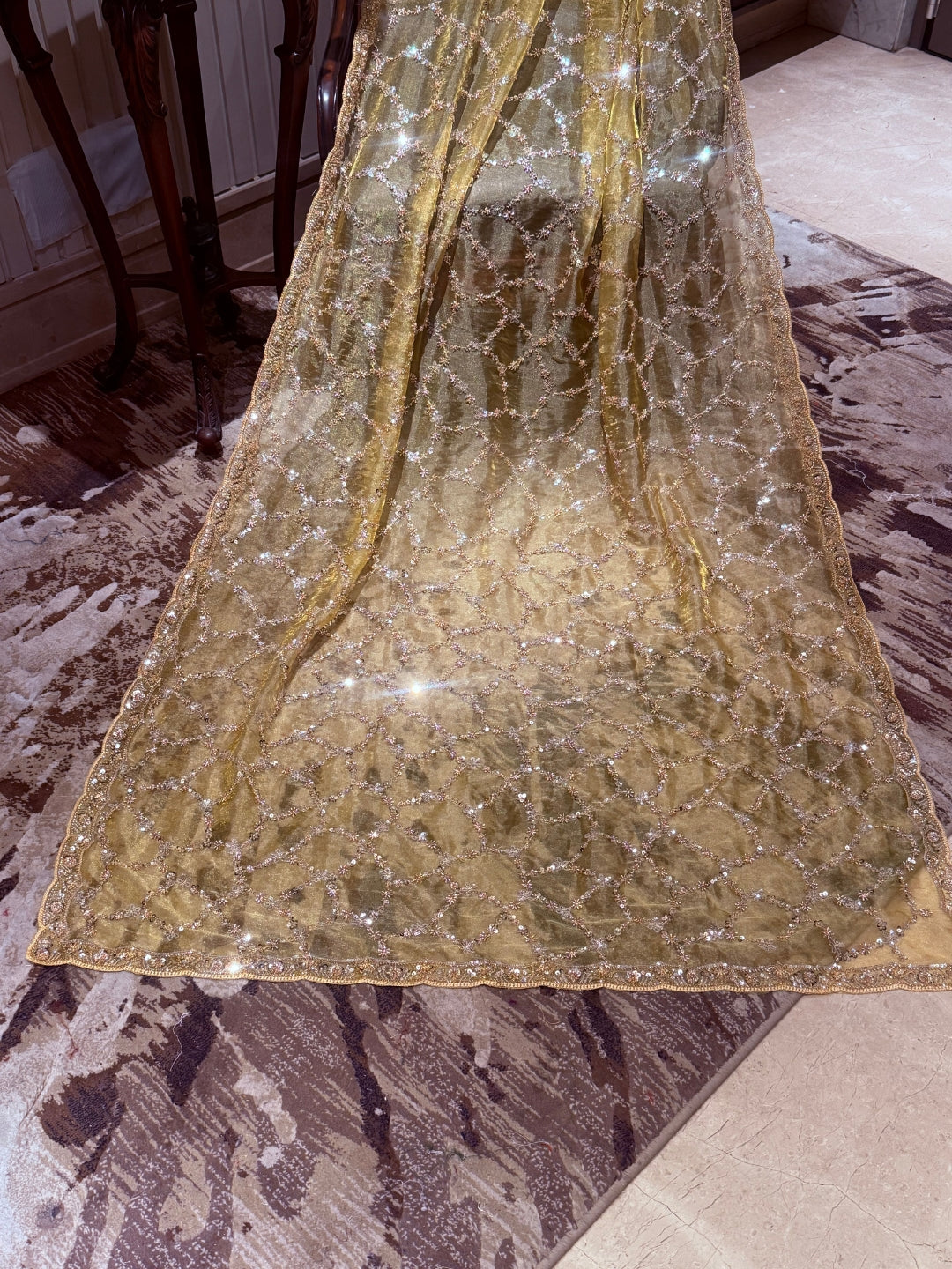 Border: Minimal self‑finish border on saree; blouse cape edges highlighted with dense bead and sequin work plus hanging fringes.