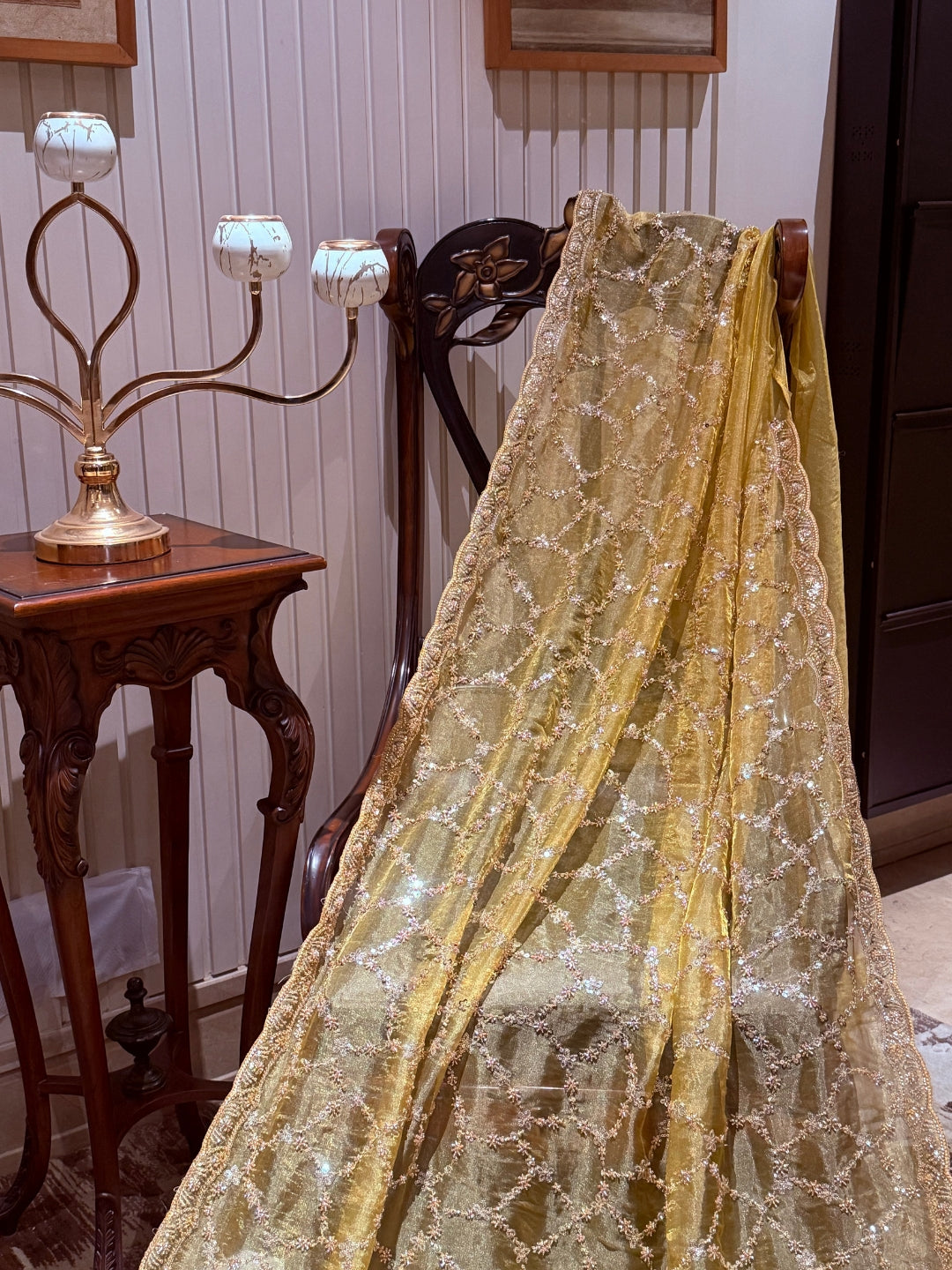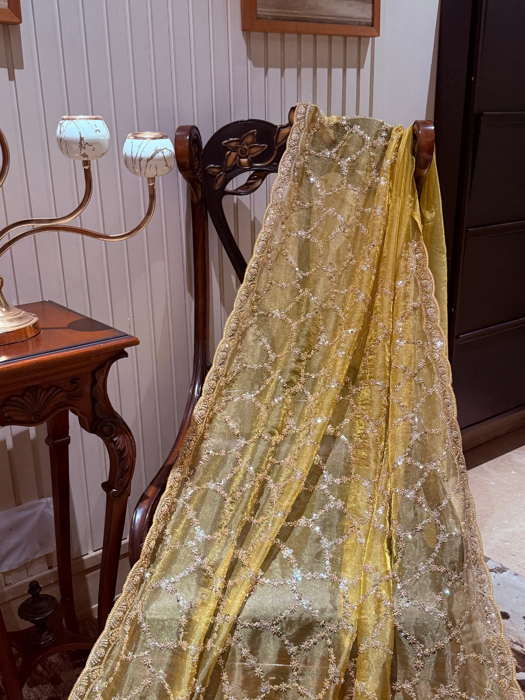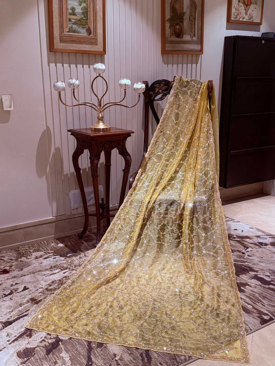Border: Minimal self‑finish border on saree; blouse cape edges highlighted with dense bead and sequin work plus hanging fringes.