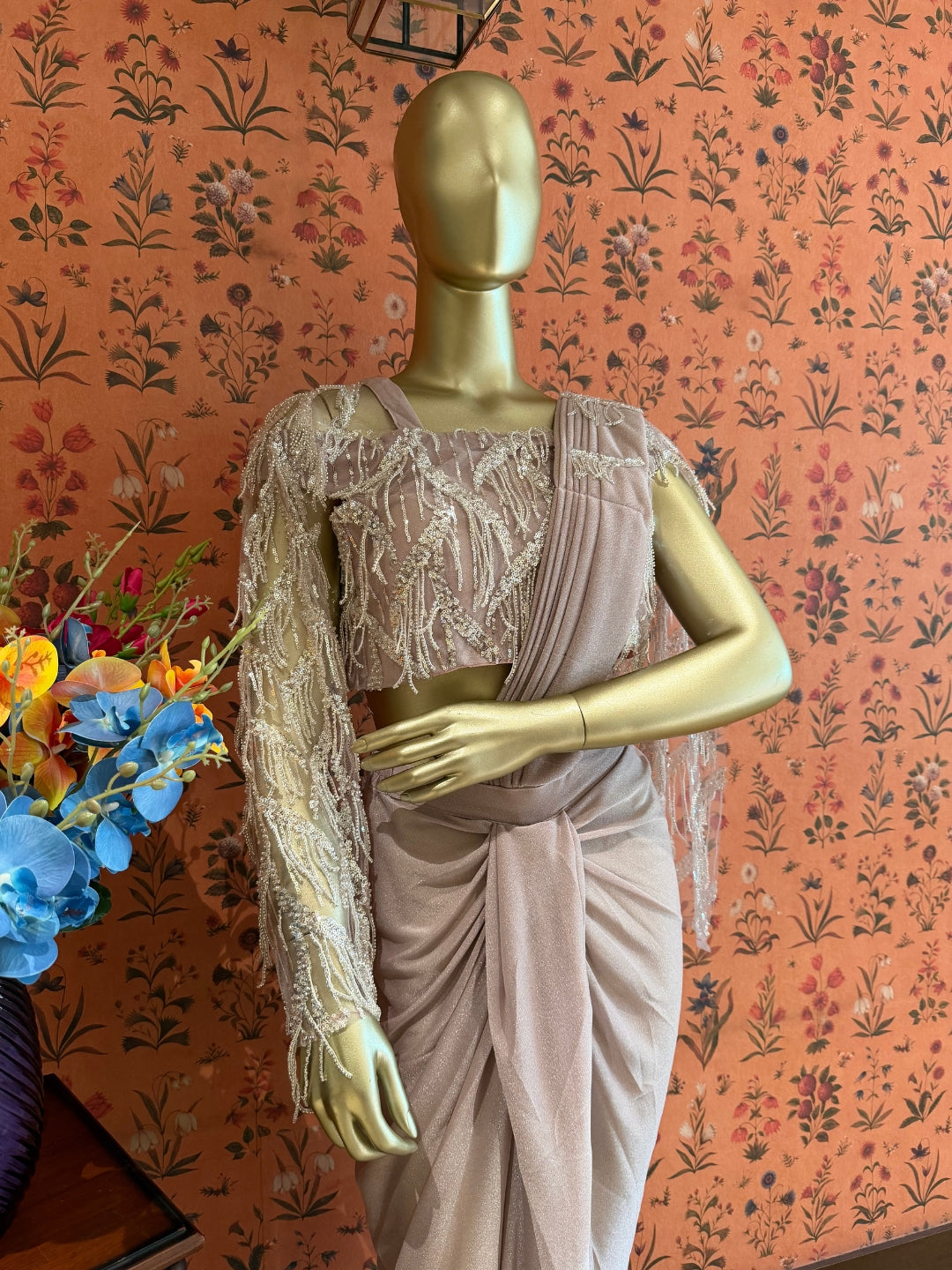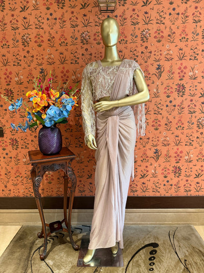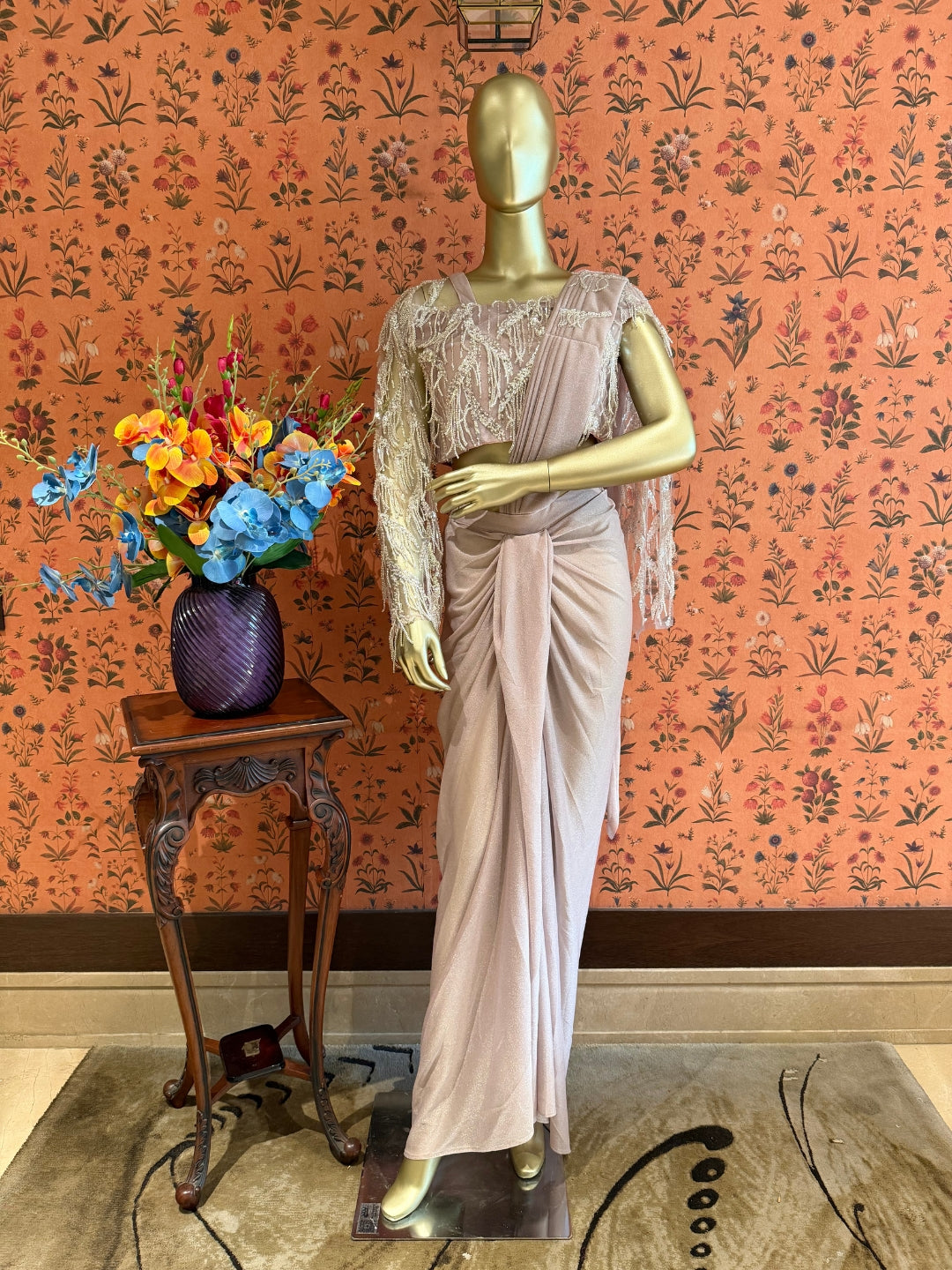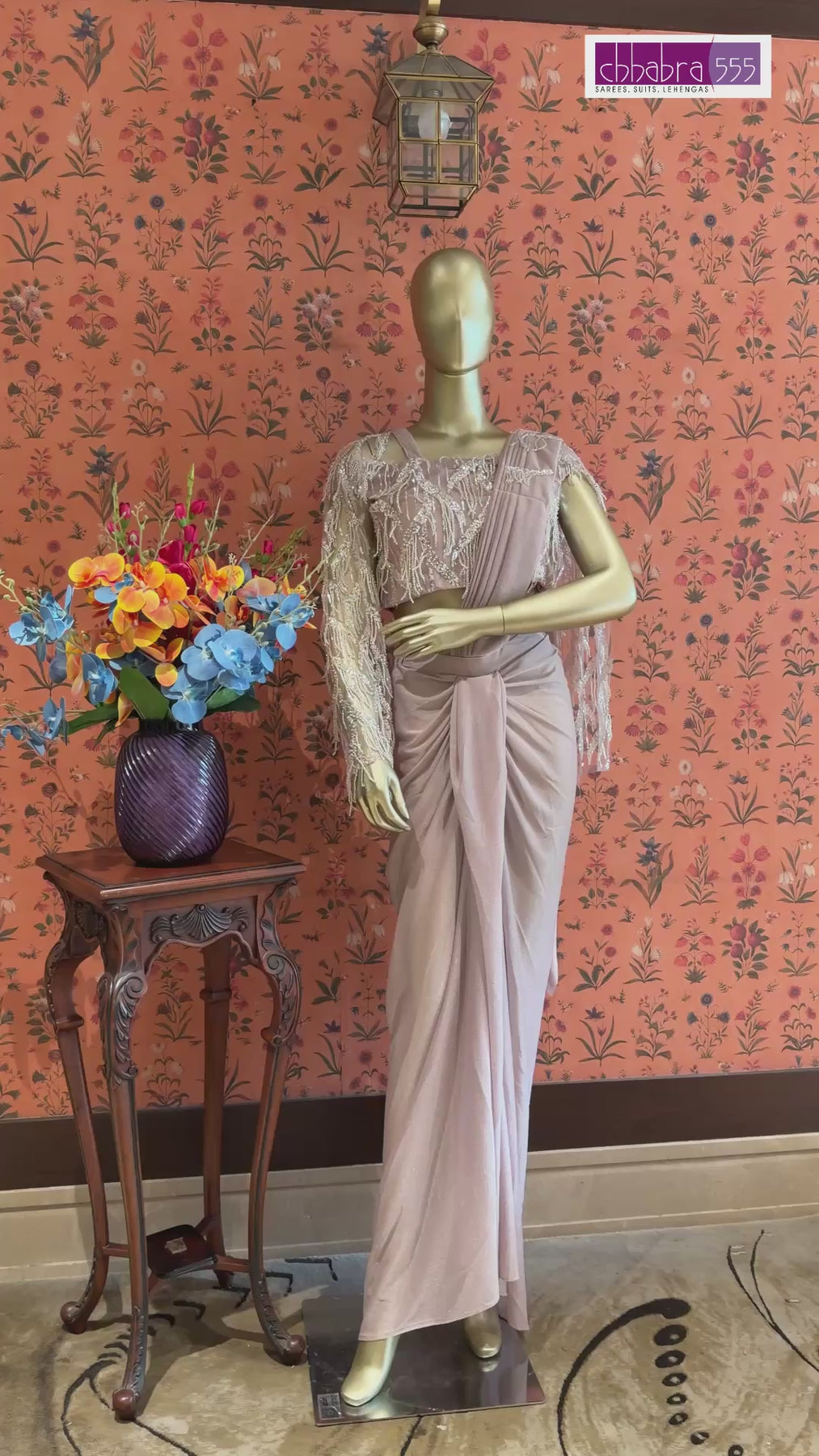 Chhabra 555 Dusty mauve shimmer draped saree set paired with a statement cape‑style blouse. The saree features pre‑stitched pleats and a soft, fluid fall that hugs the body for a contemporary gown‑like look. The attached blouse is crafted on a sheer base with all‑over tonal bead, sequin and cut dana embroidery in abstract leaf and linear motifs.