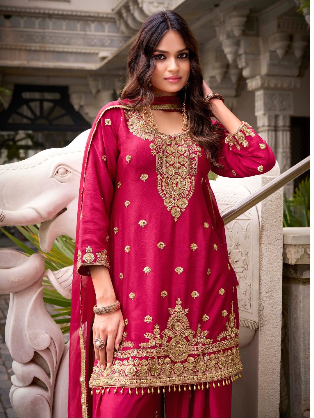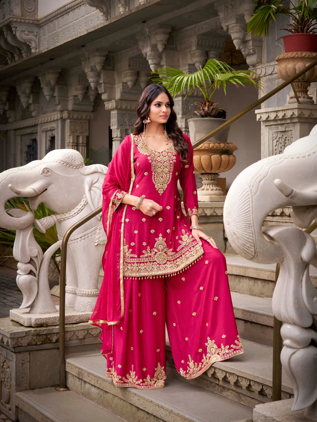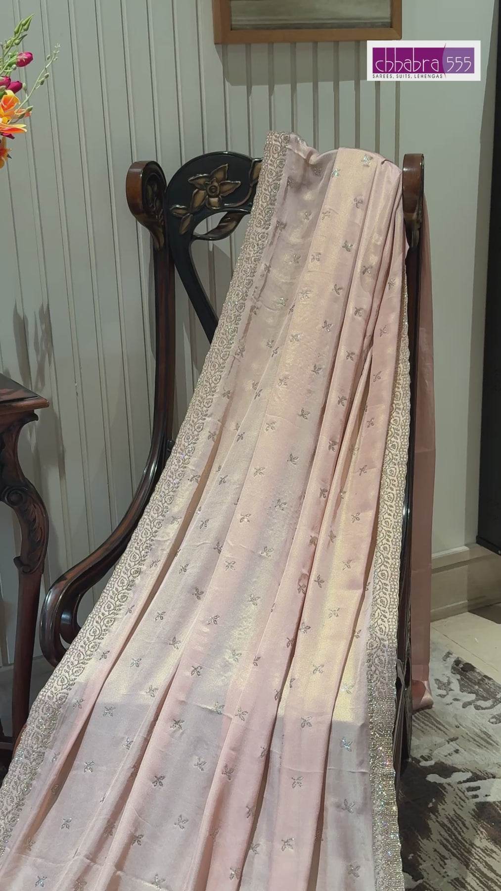 Chhabra 555 luxurious deep pink saree featuring a woven jacquard body, lavishly ornamented with heavy floral and peacock intricate zardozi embroidery along the border, highlighted by sequins, pearls, resham, and zari.