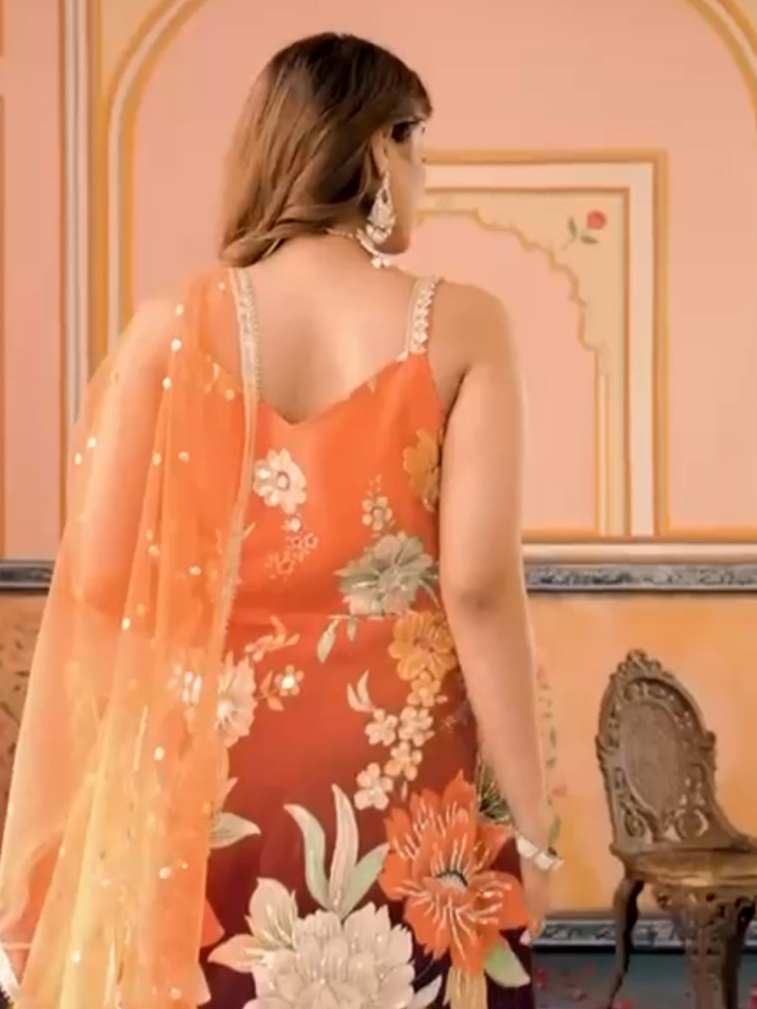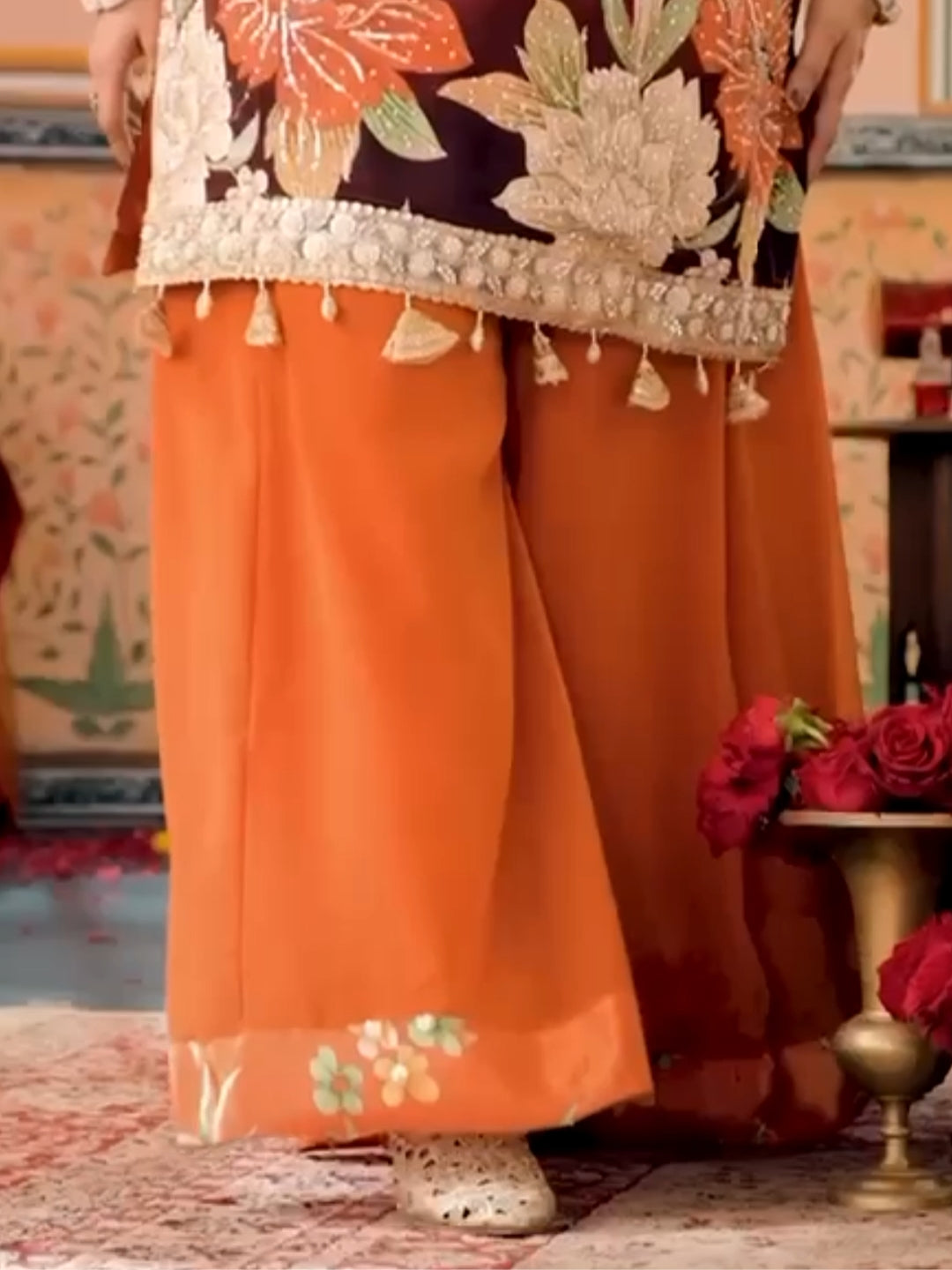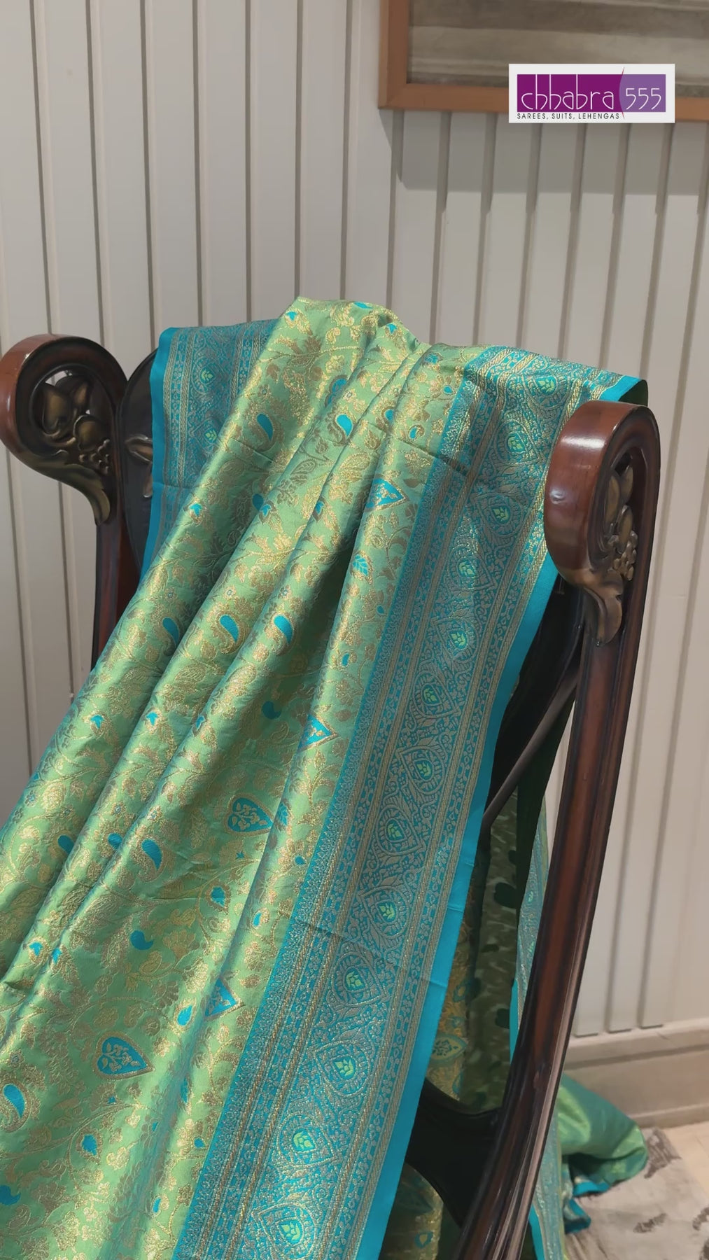 Fabric: Rich jacquard silk blend (saree) and contrasting embroidered raw silk (blouse).