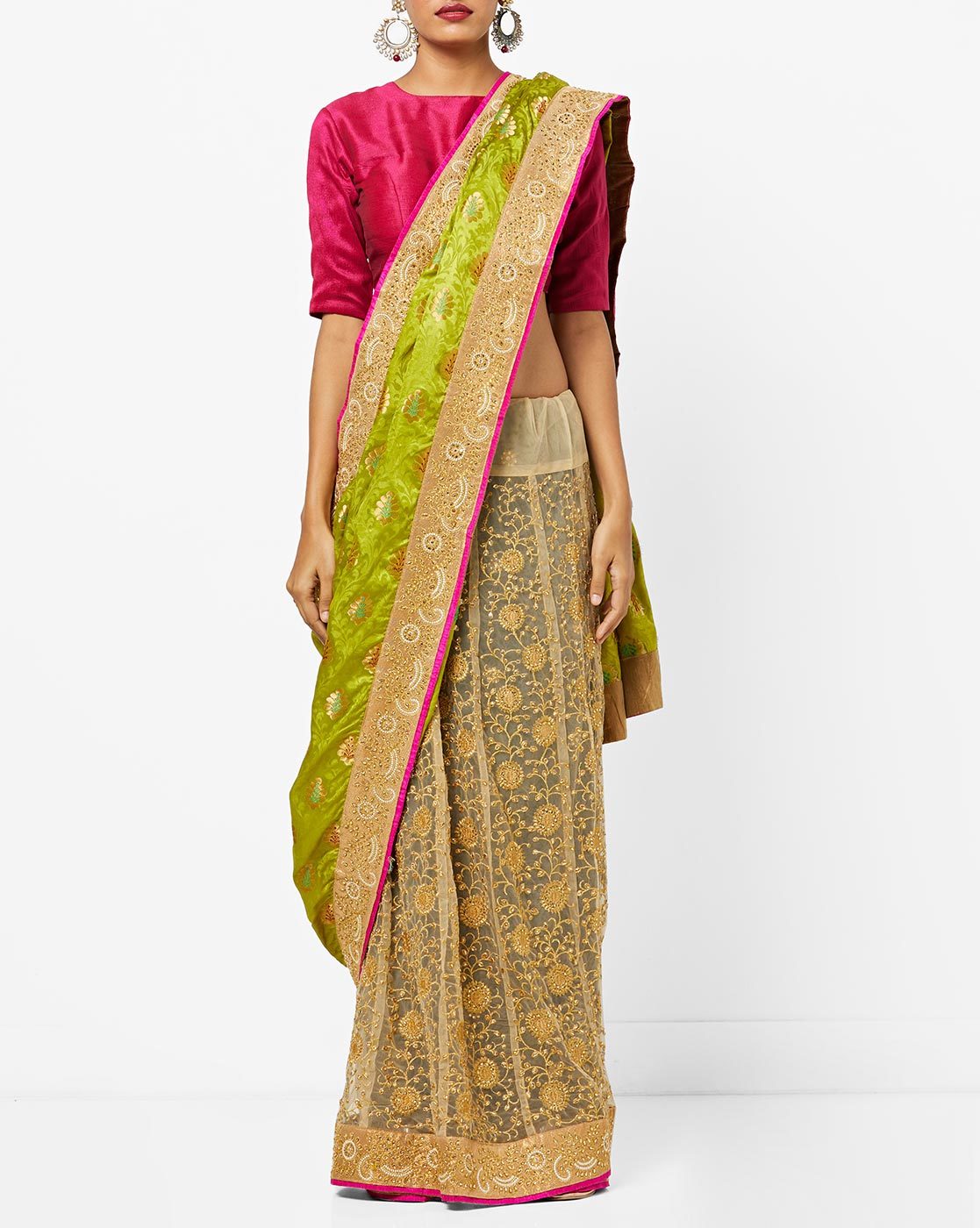 Chhabra 555 Half and Half Silk Jamdani Saree with Jacquard Pallu and Embroidered Paneled Pleats