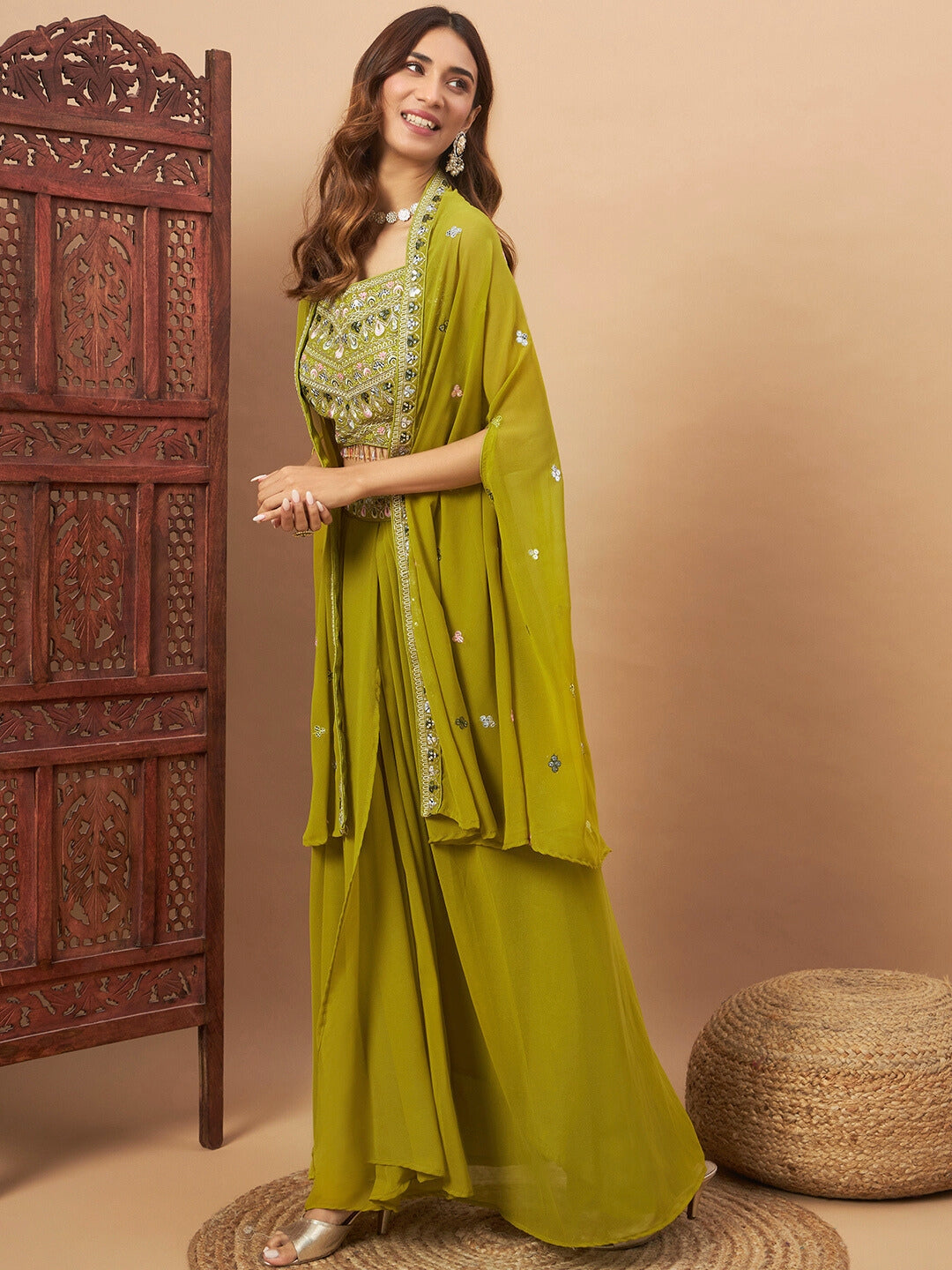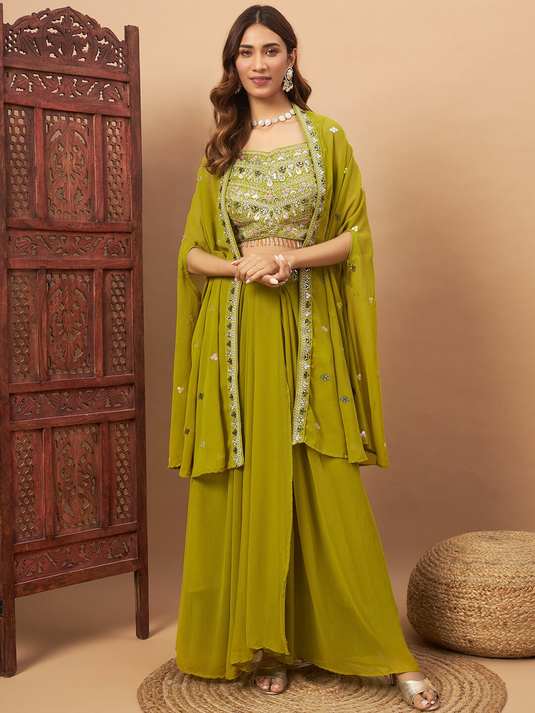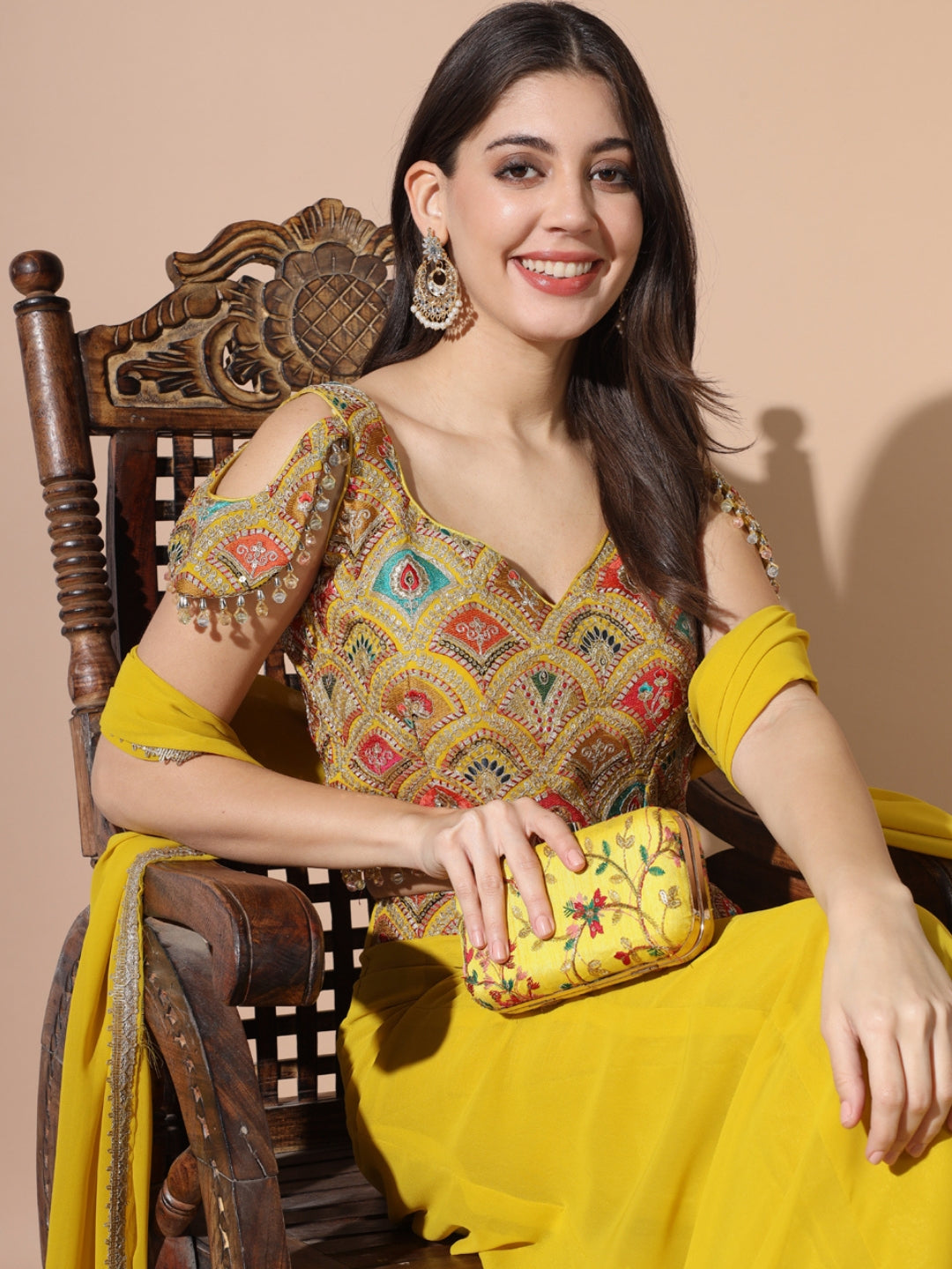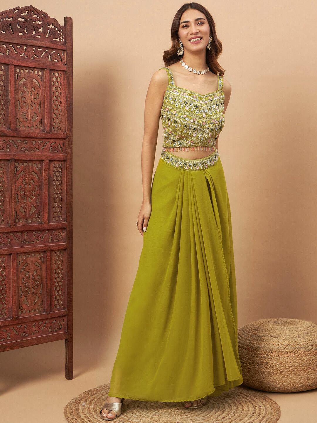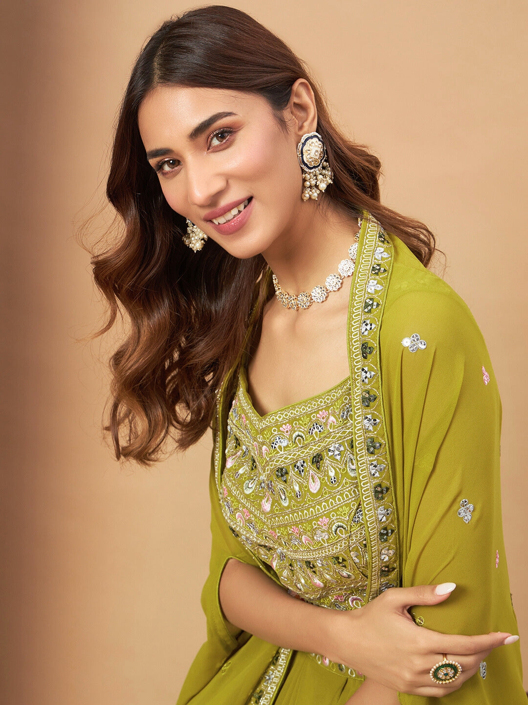 Chhabra 555 This lehenga set features a flared panelled skirt in mustard yellow and olive green with heavily embroidered scalloped hem panels, floral butis and paisley motifs in pastel pink, mint and silver tones for a high-shine festive look. padded blouse has a plunging V-neck and curved hem, highlighted with dense sequin, cut-dana, bead and thread embroidery forming mirrored paisleys, floral sprays and vertical stripe detailing.