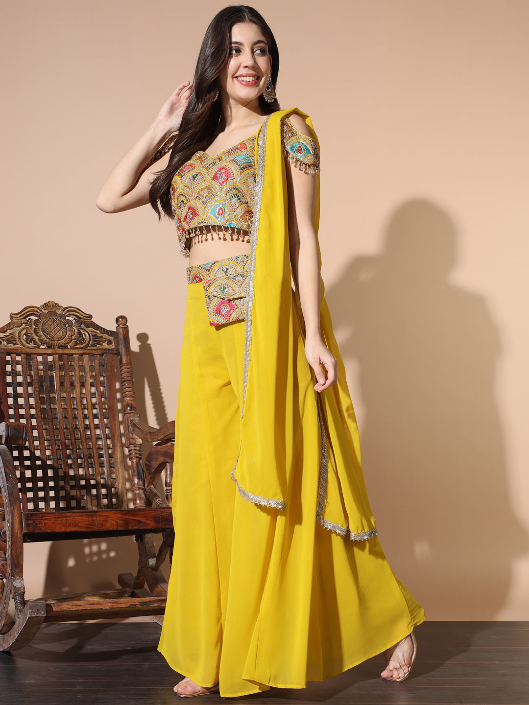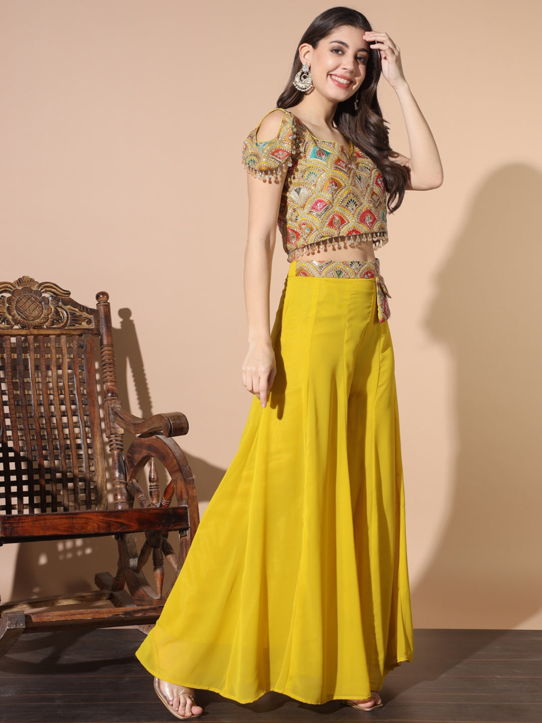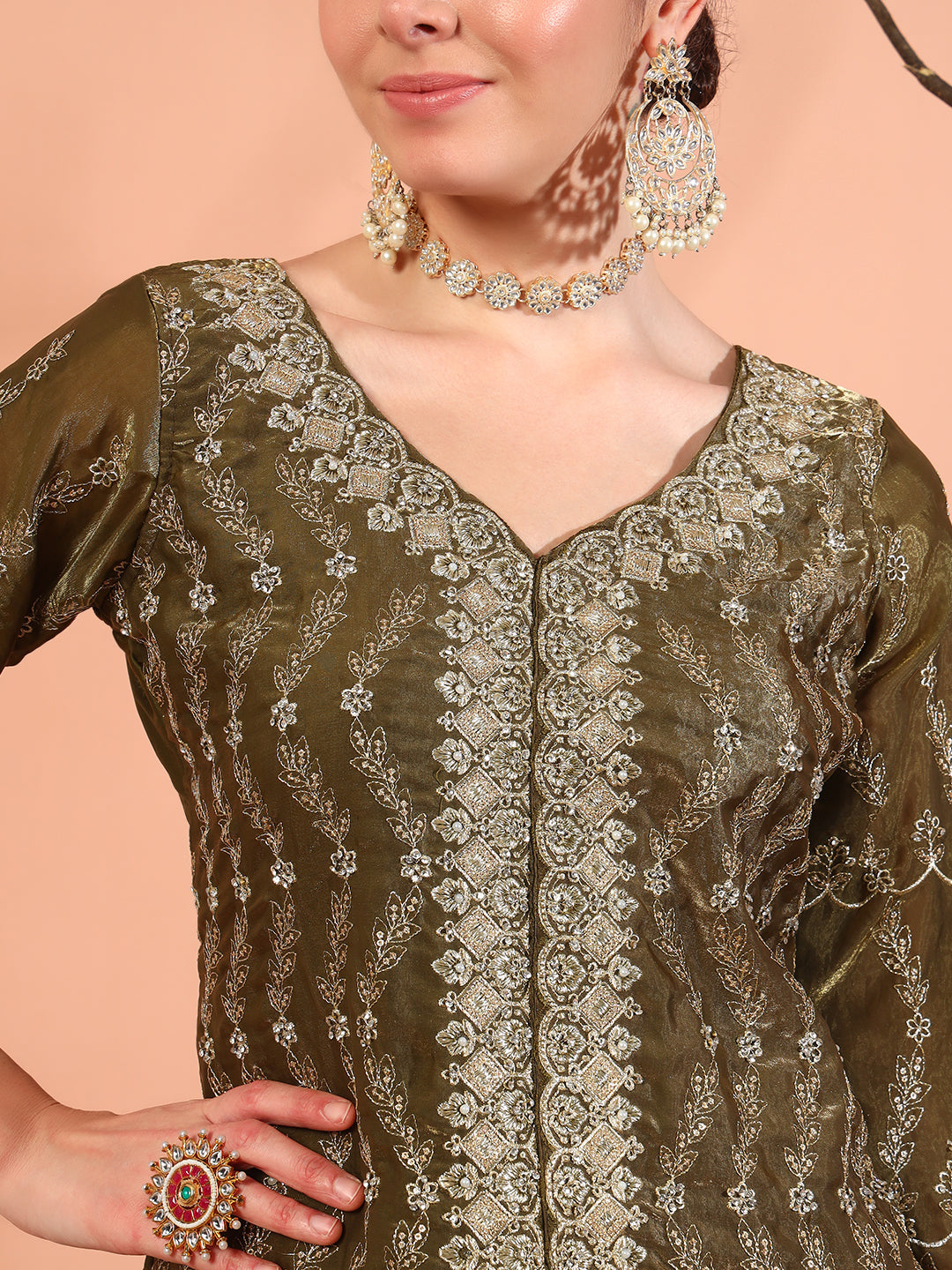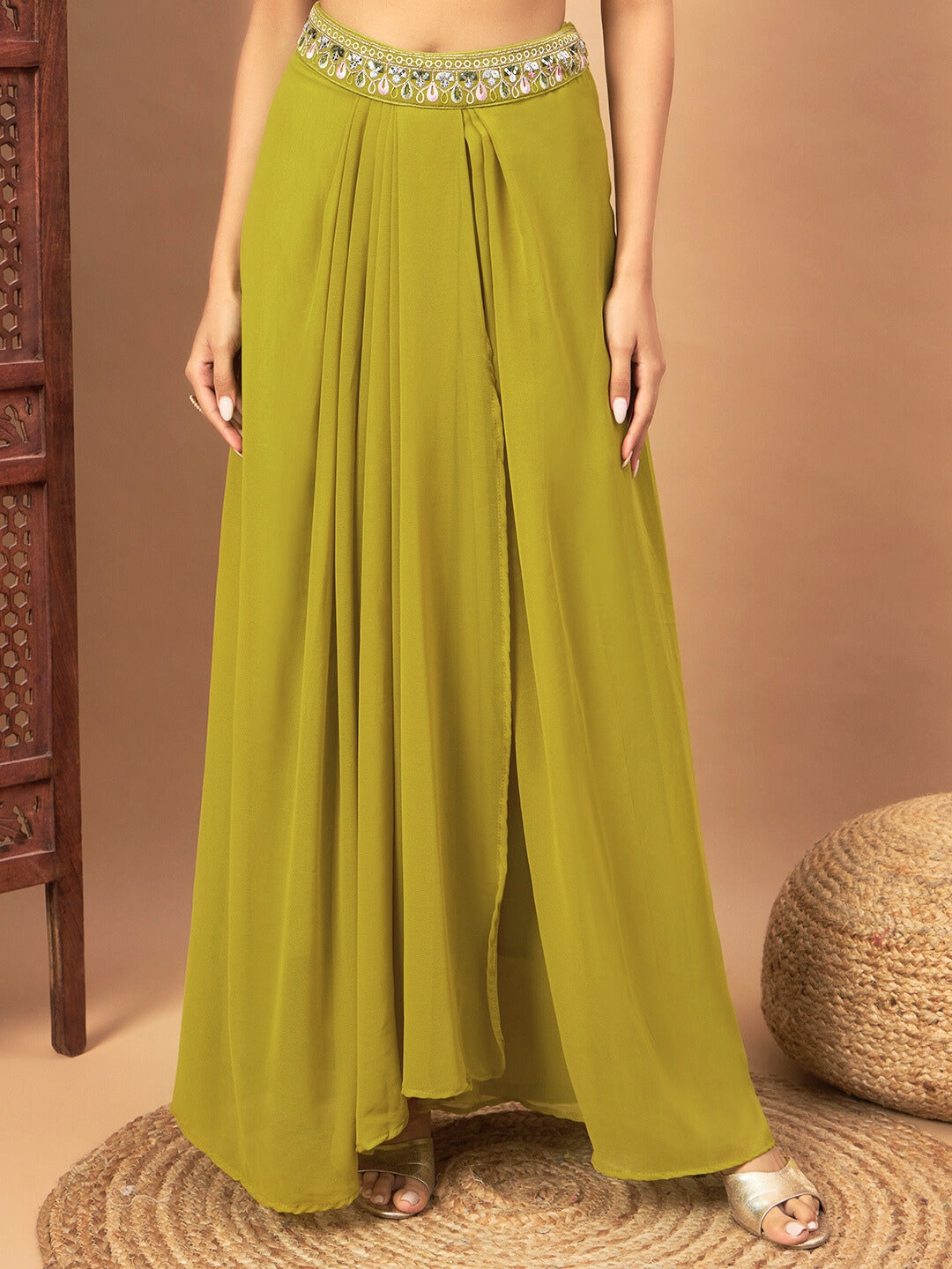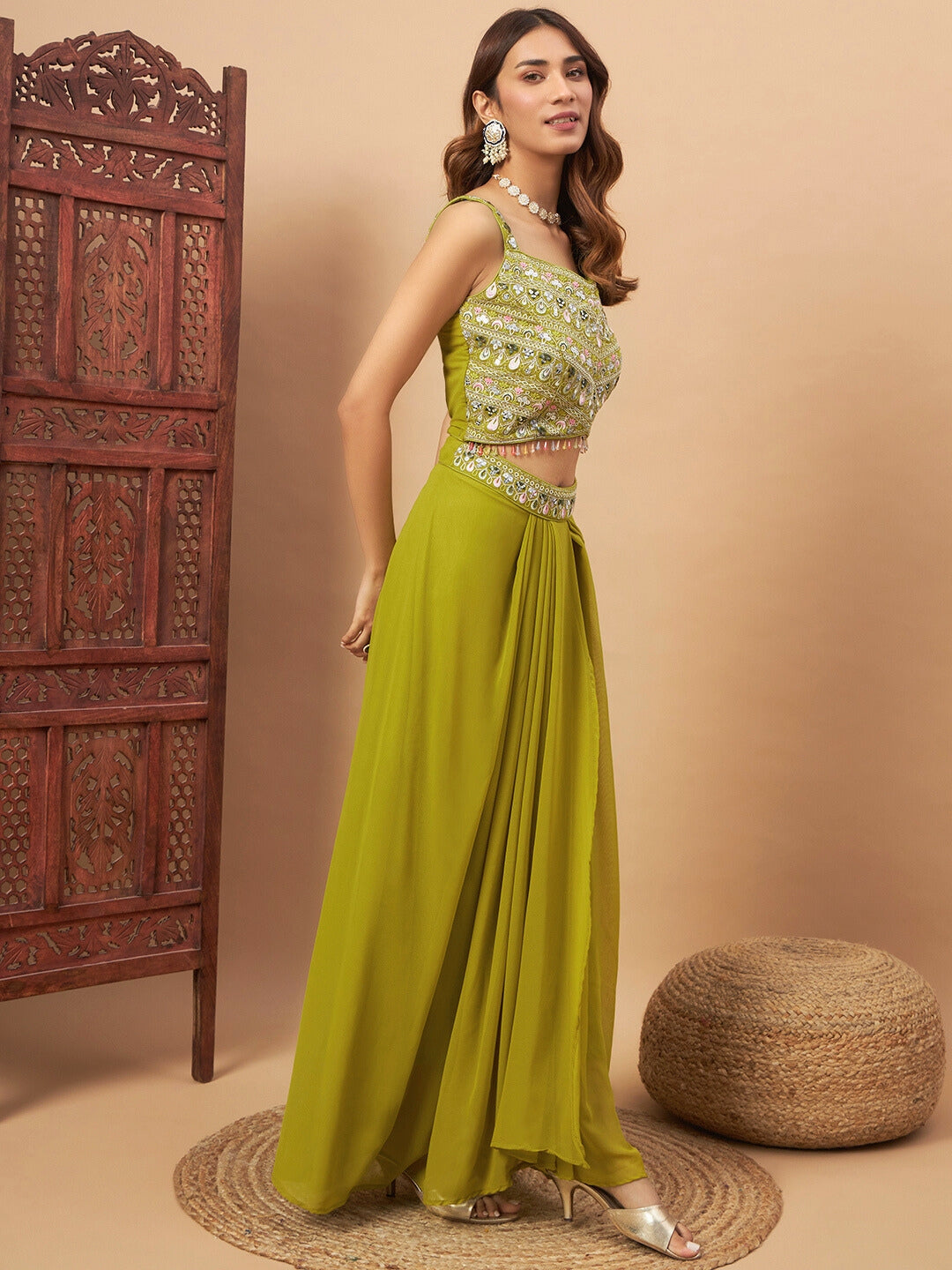 Chhabra 555 This lehenga set features a flared panelled skirt in mustard yellow and olive green with heavily embroidered scalloped hem panels, floral butis and paisley motifs in pastel pink, mint and silver tones for a high-shine festive look. padded blouse has a plunging V-neck and curved hem, highlighted with dense sequin, cut-dana, bead and thread embroidery forming mirrored paisleys, floral sprays and vertical stripe detailing.
