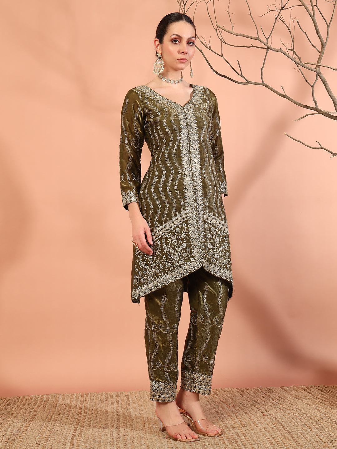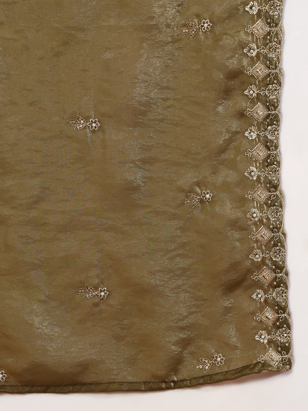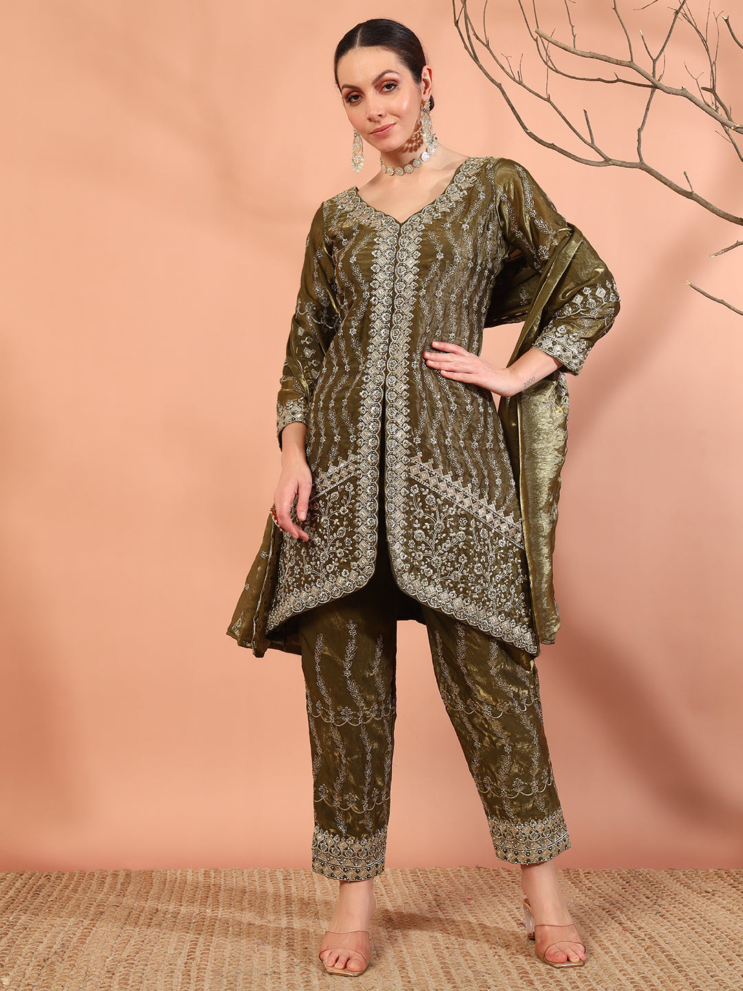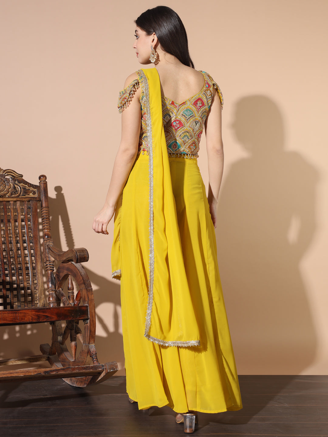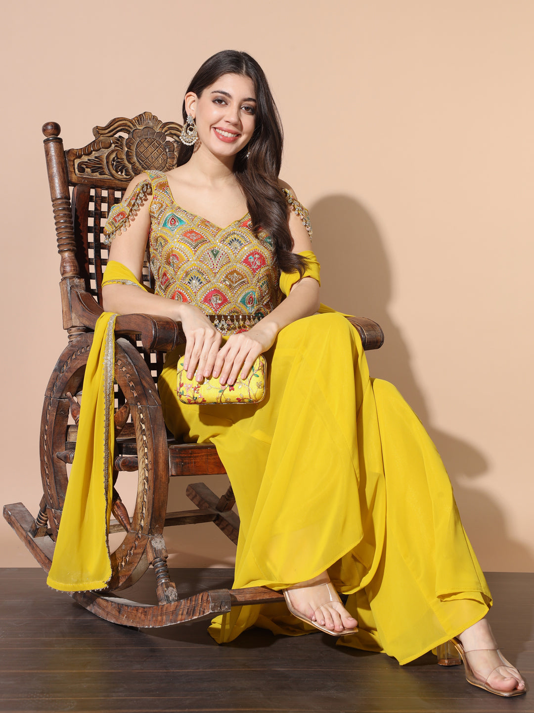 Chhabra 555 This lehenga set features a flared panelled skirt in mustard yellow and olive green with heavily embroidered scalloped hem panels, floral butis and paisley motifs in pastel pink, mint and silver tones for a high-shine festive look. padded blouse has a plunging V-neck and curved hem, highlighted with dense sequin, cut-dana, bead and thread embroidery forming mirrored paisleys, floral sprays and vertical stripe detailing.