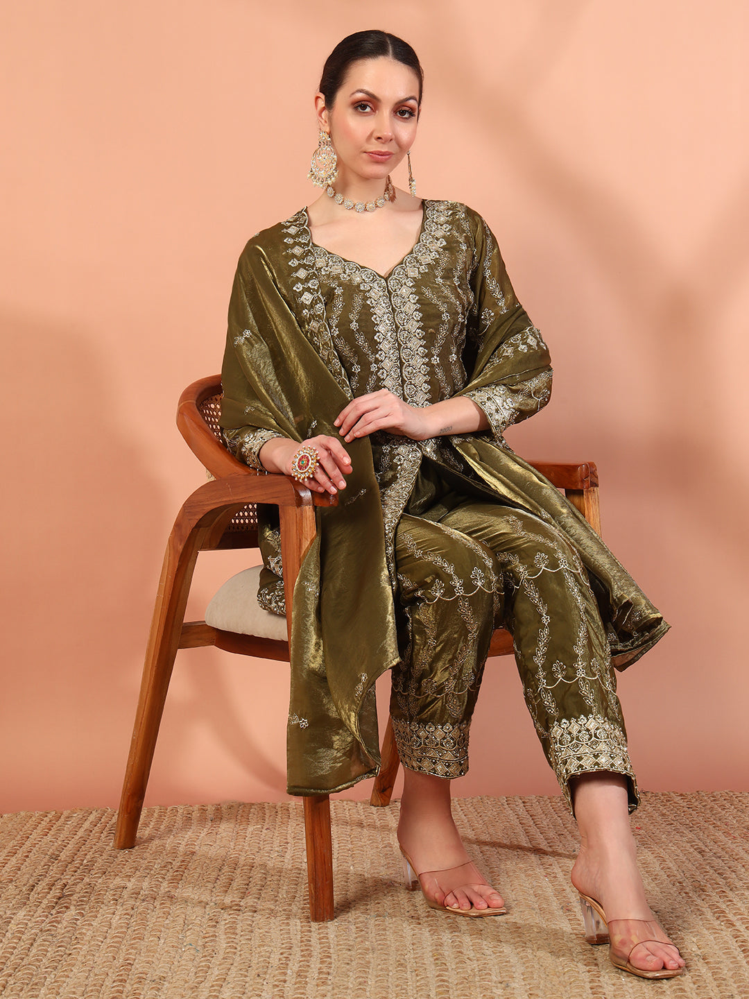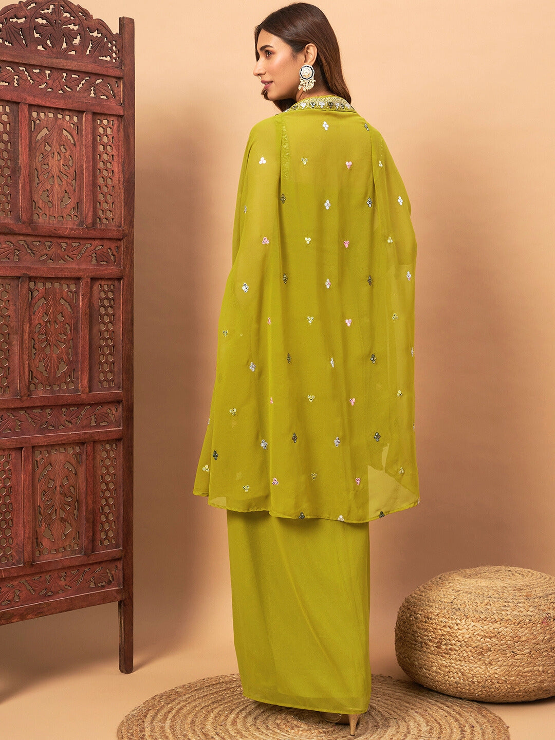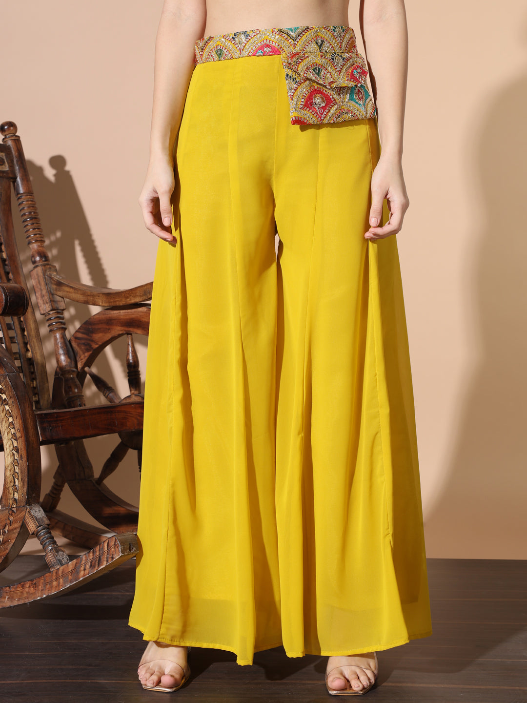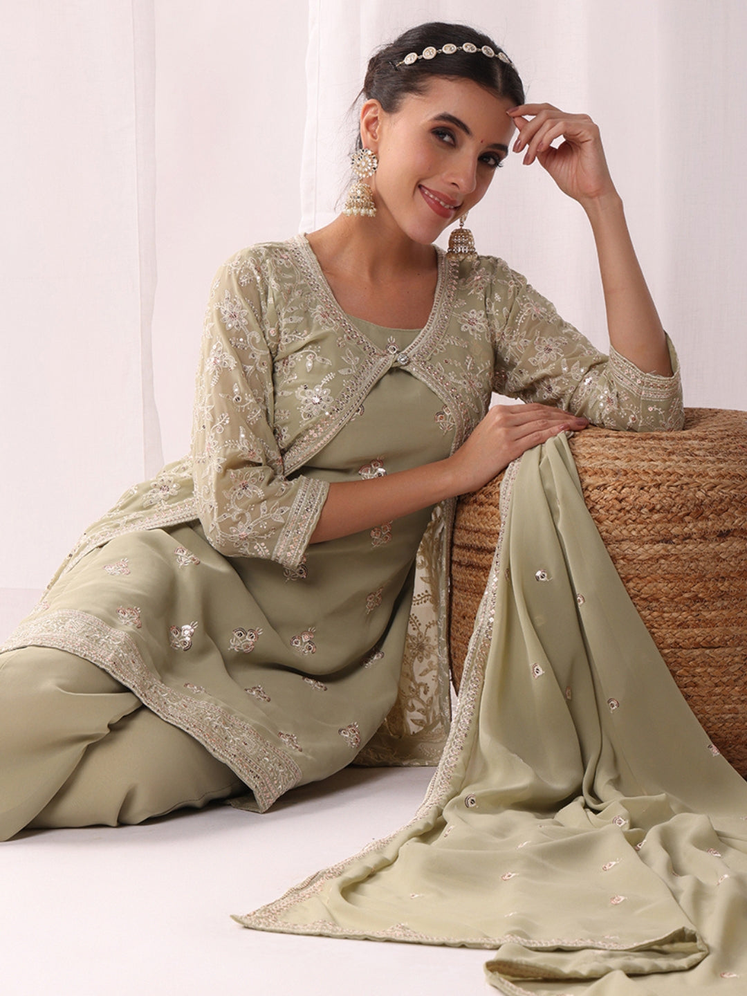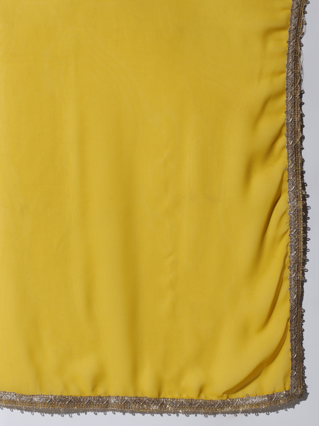 Chhabra 555 This lehenga set features a flared panelled skirt in mustard yellow and olive green with heavily embroidered scalloped hem panels, floral butis and paisley motifs in pastel pink, mint and silver tones for a high-shine festive look. padded blouse has a plunging V-neck and curved hem, highlighted with dense sequin, cut-dana, bead and thread embroidery forming mirrored paisleys, floral sprays and vertical stripe detailing.