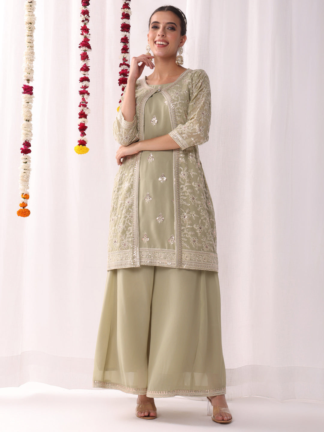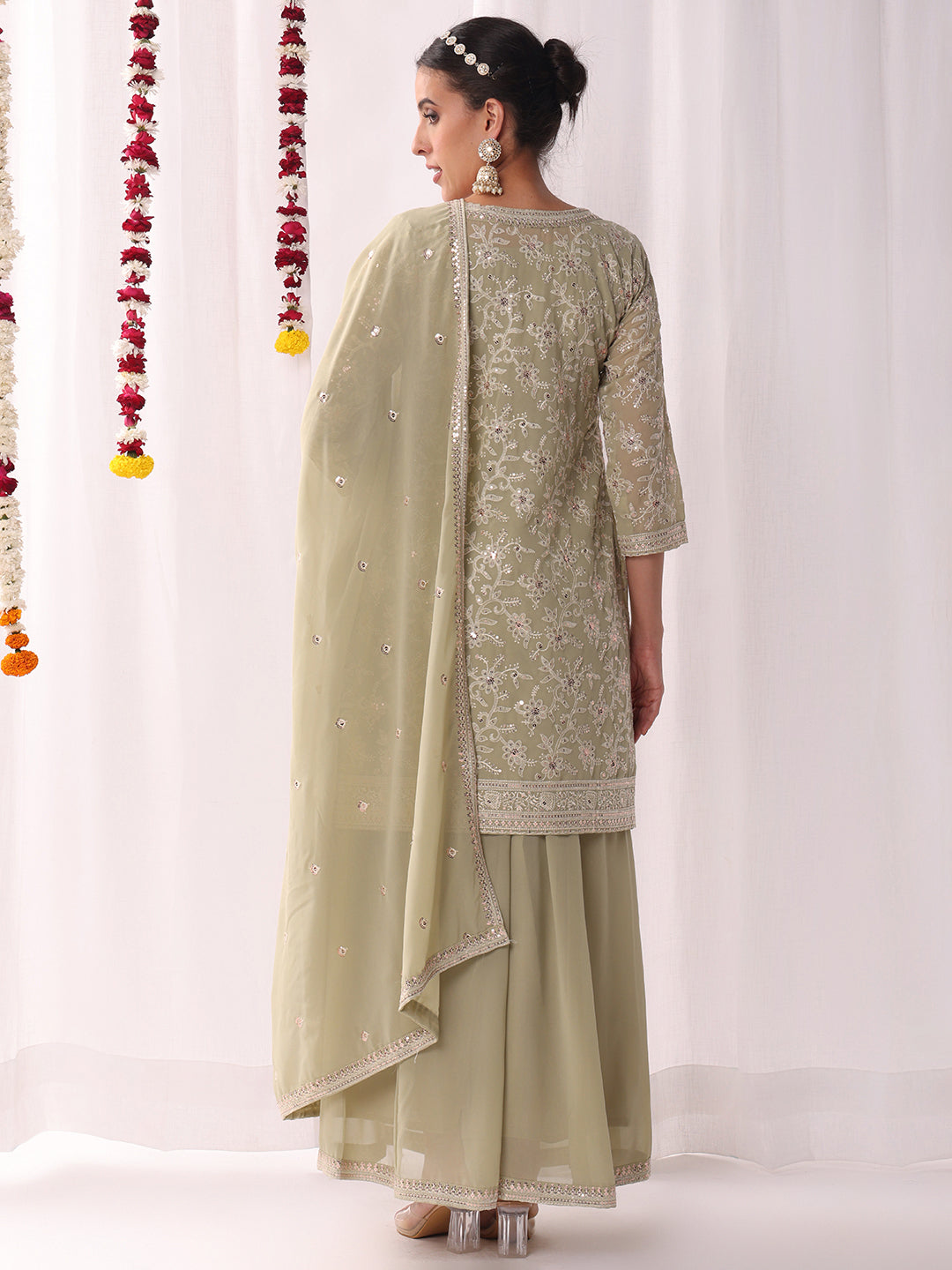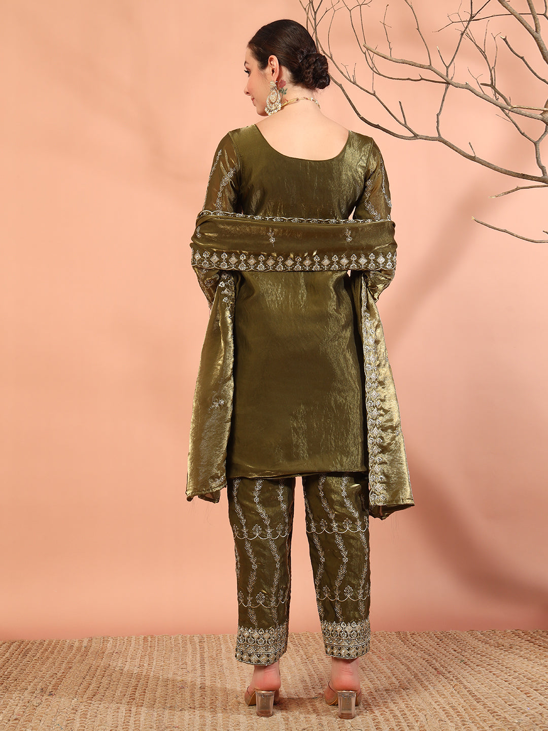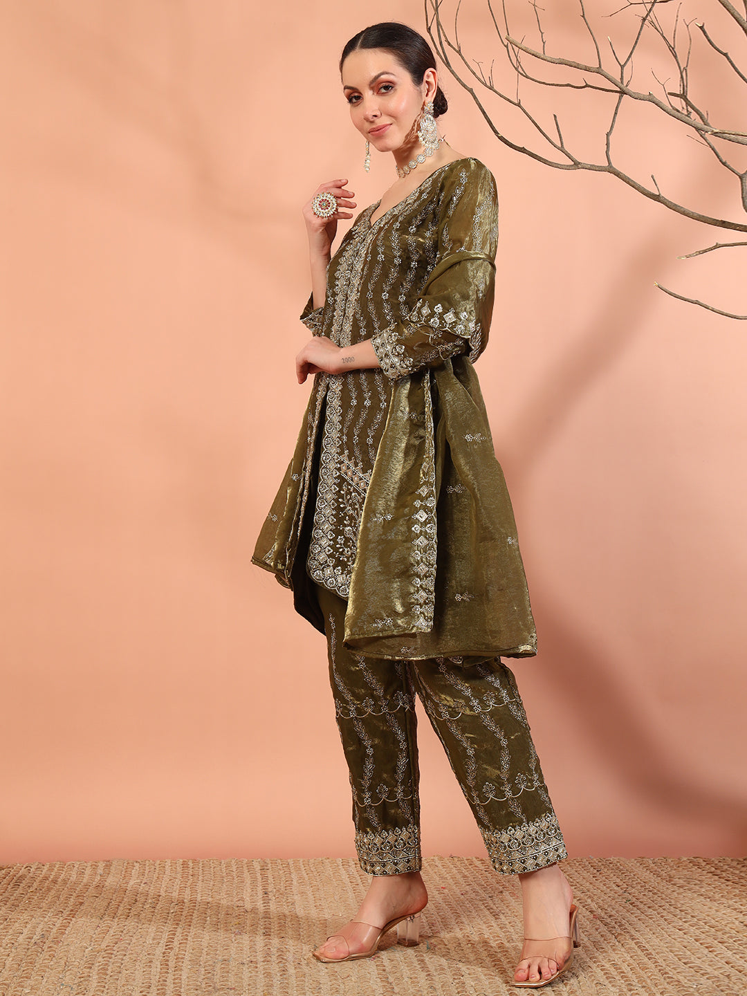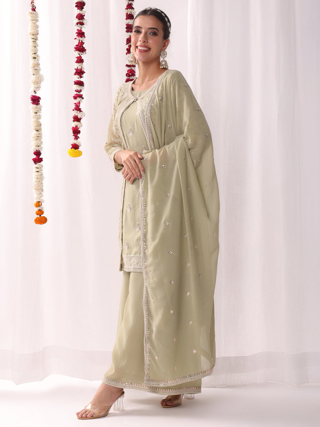 Chhabra 555 This lehenga set features a flared panelled skirt in mustard yellow and olive green with heavily embroidered scalloped hem panels, floral butis and paisley motifs in pastel pink, mint and silver tones for a high-shine festive look. padded blouse has a plunging V-neck and curved hem, highlighted with dense sequin, cut-dana, bead and thread embroidery forming mirrored paisleys, floral sprays and vertical stripe detailing.