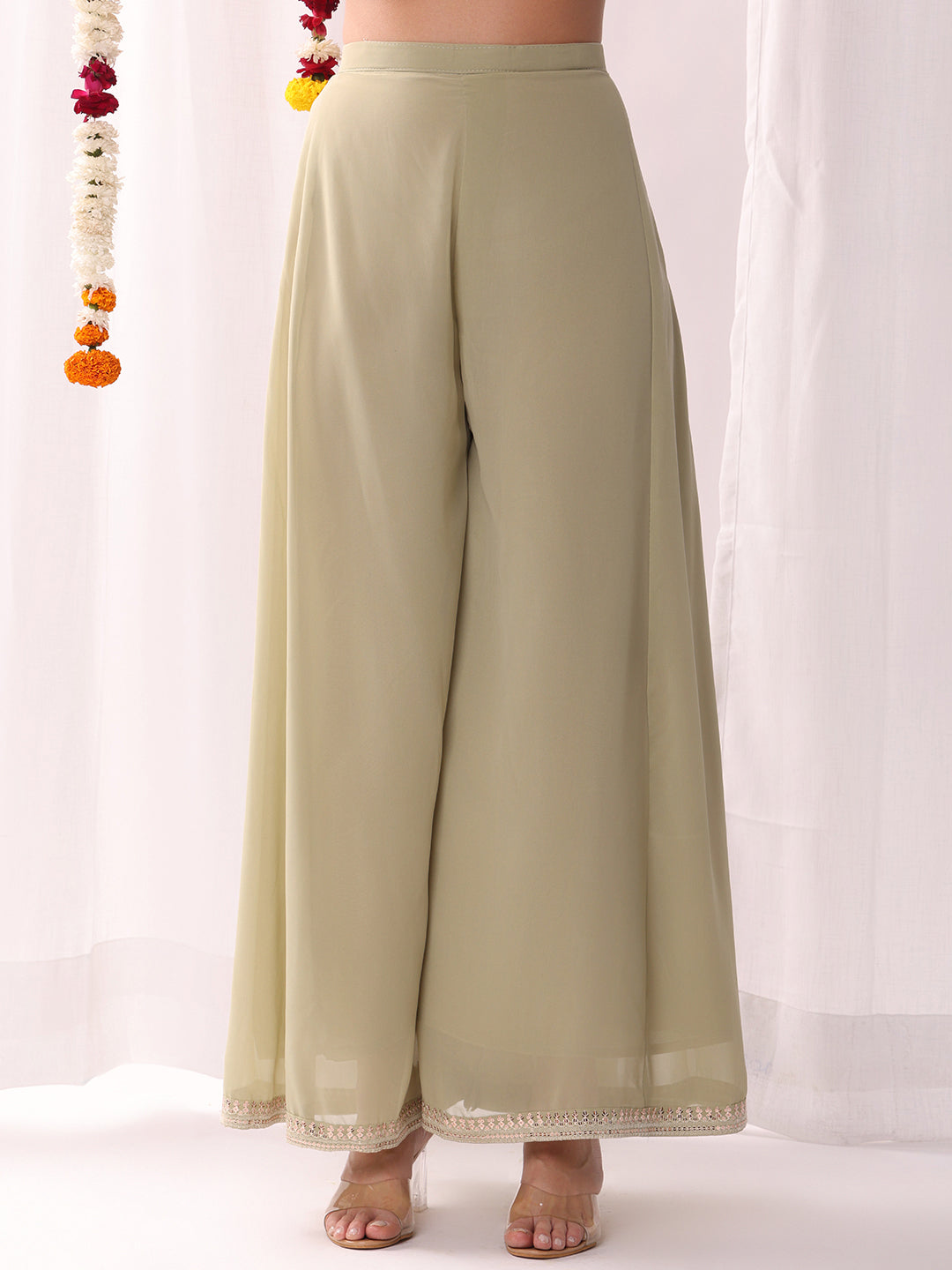 Bottom Pattern: Paneled lehenga with scalloped embroidered hem, floral and paisley butis, contrast olive and mustard panels.