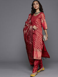 Red Unstitched Banarasi Kurta Set With Handloom Dupatta & Zari Weaving