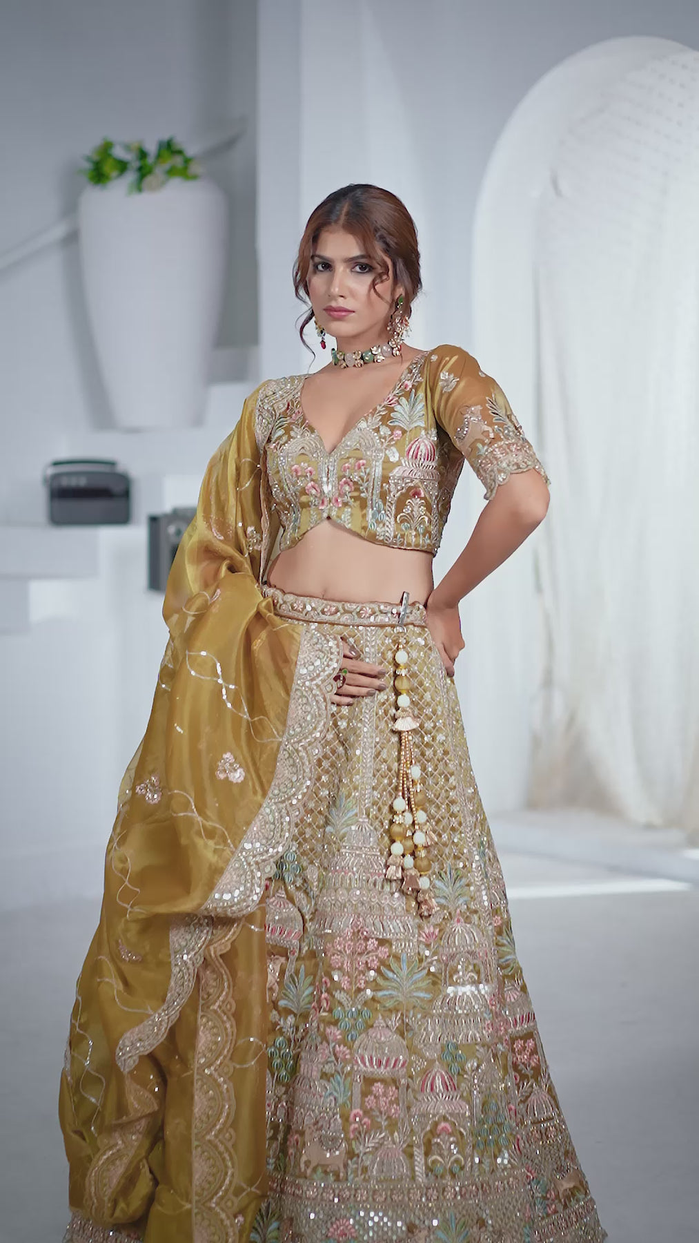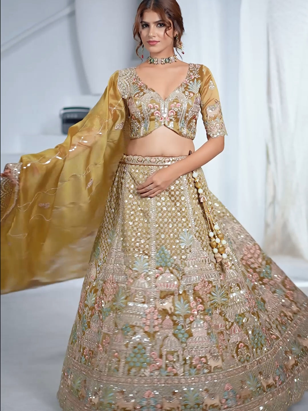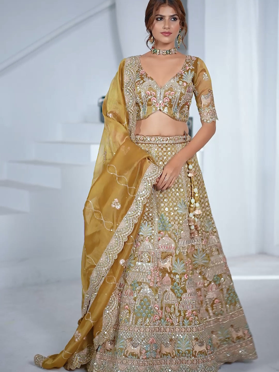Chhabra 555 Rich mustard antique-gold lehenga featuring an all-over lattice base that gradually transitions into heavily embroidered temple arches, trees and animal motifs in pastel pink, mint and blue threads, highlighted with dense zari and sequin work for a heritage bridal look.