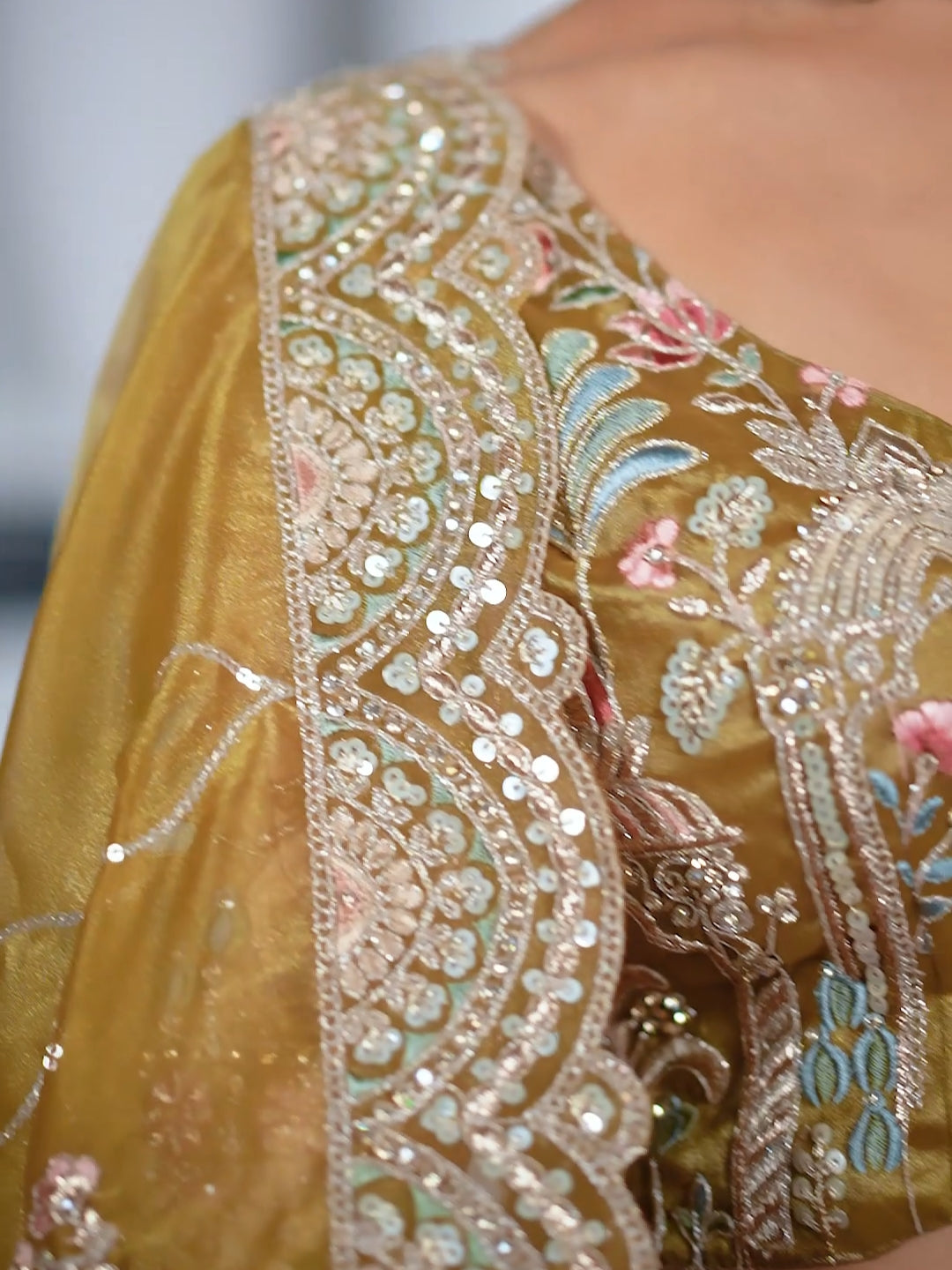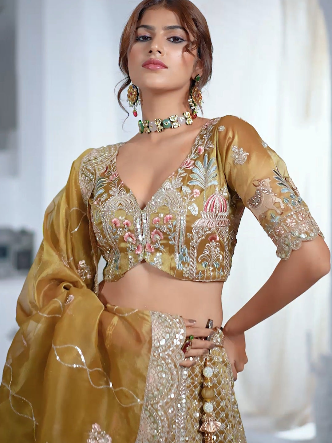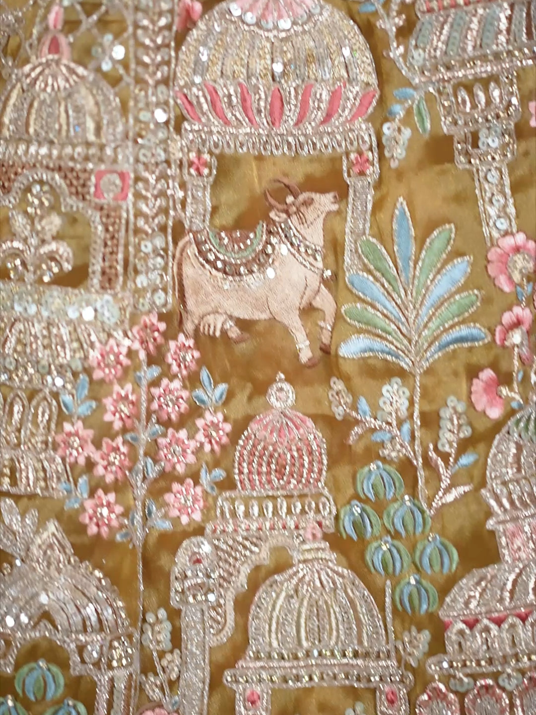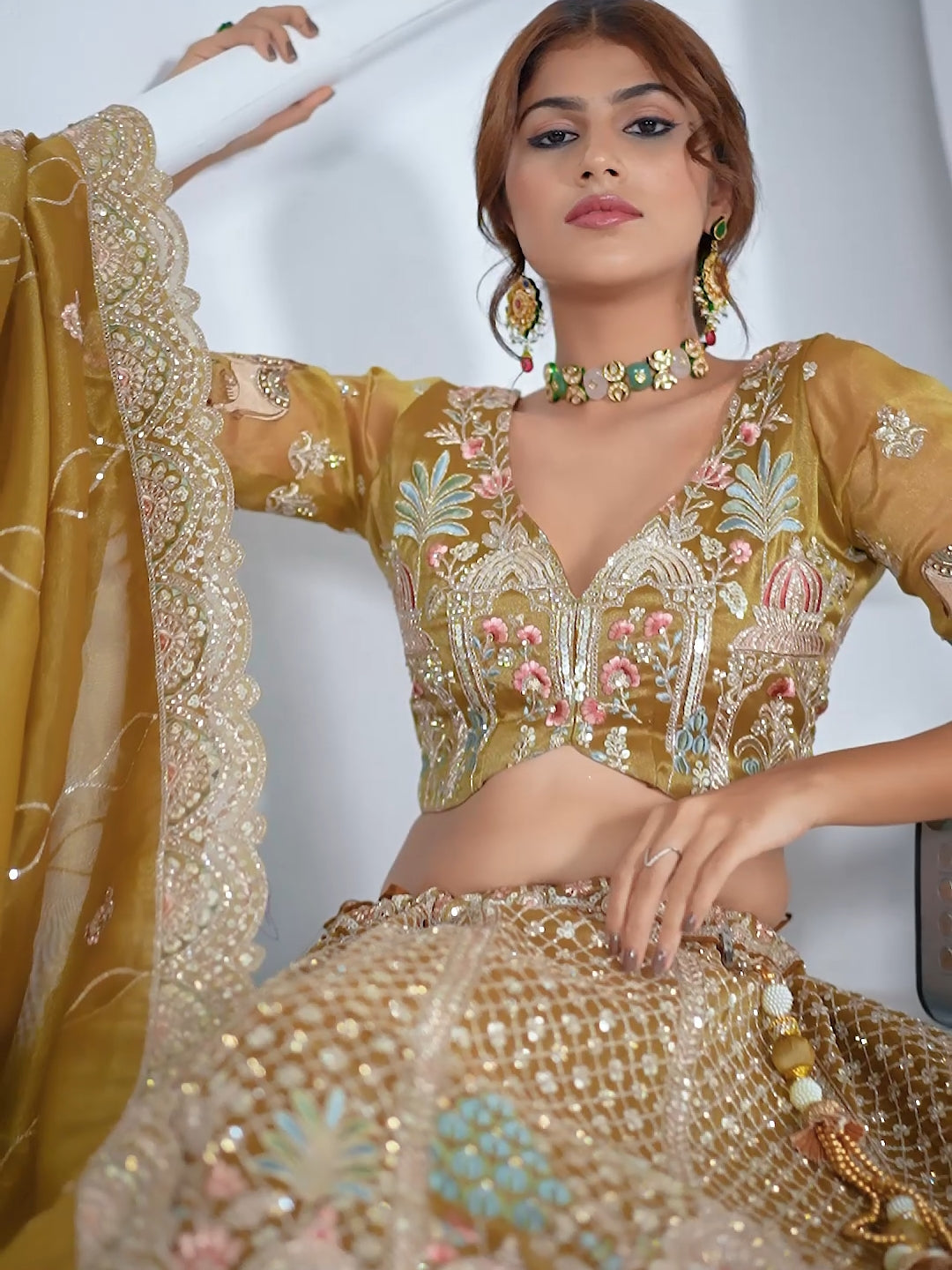 Chhabra 555 Rich mustard antique-gold lehenga featuring an all-over lattice base that gradually transitions into heavily embroidered temple arches, trees and animal motifs in pastel pink, mint and blue threads, highlighted with dense zari and sequin work for a heritage bridal look.