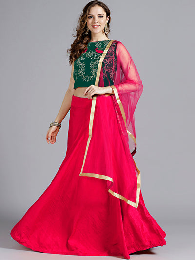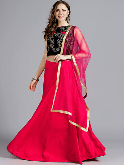 Ethnic Embroidery Net Pleated Lehenga Set & Velvet Cut-Work Border