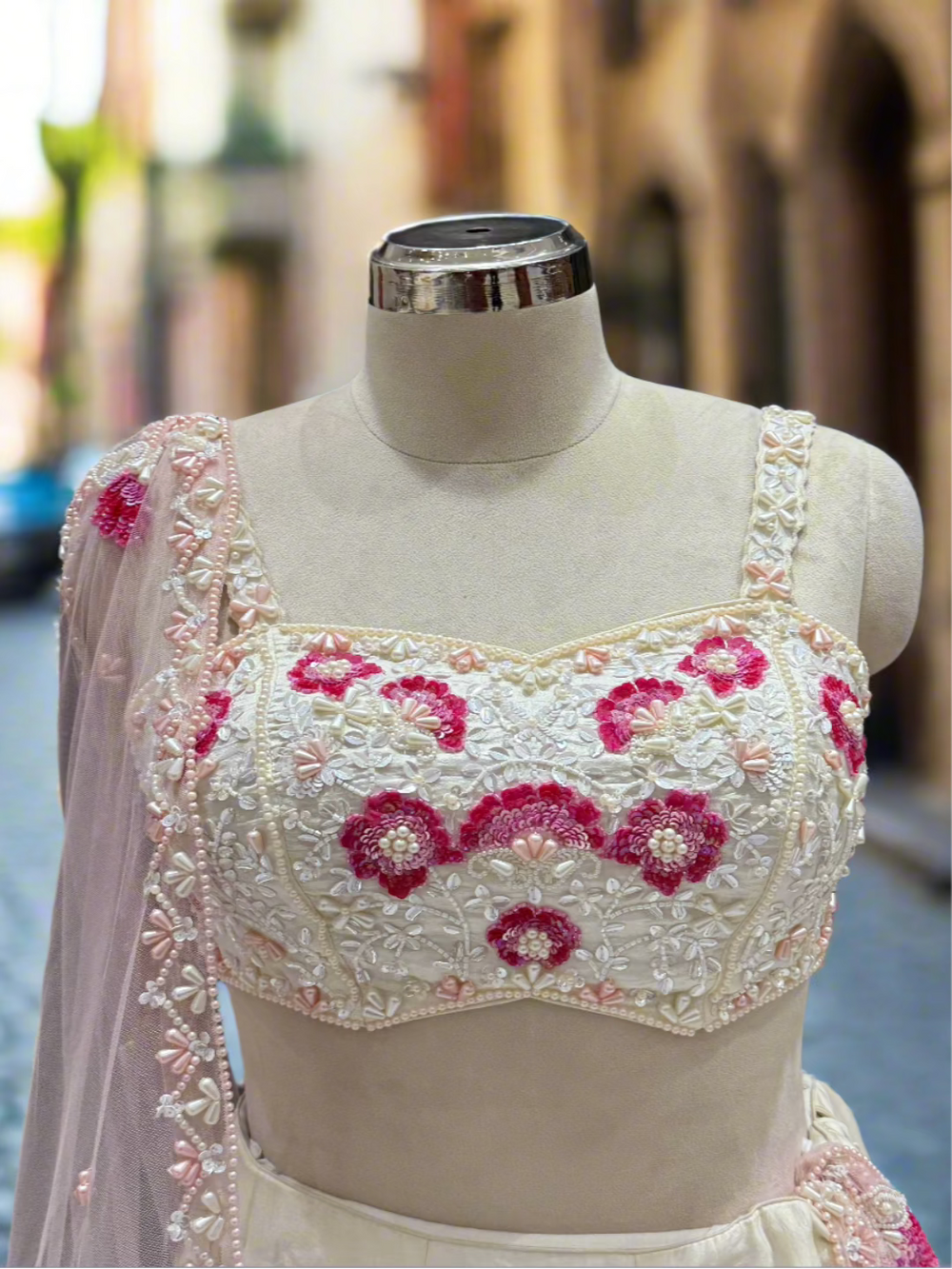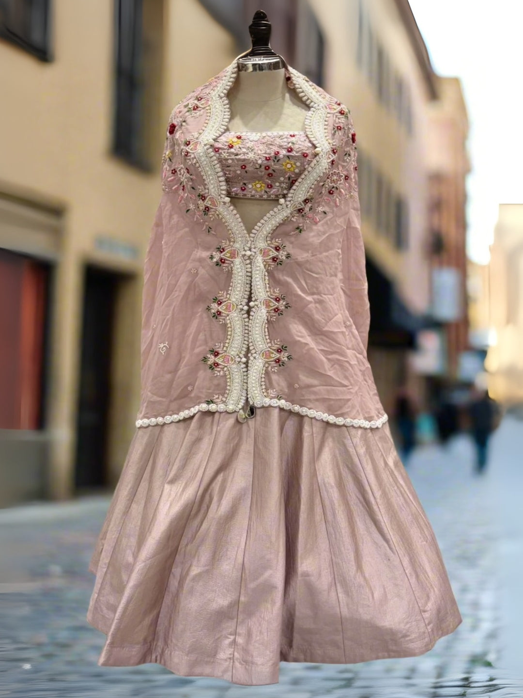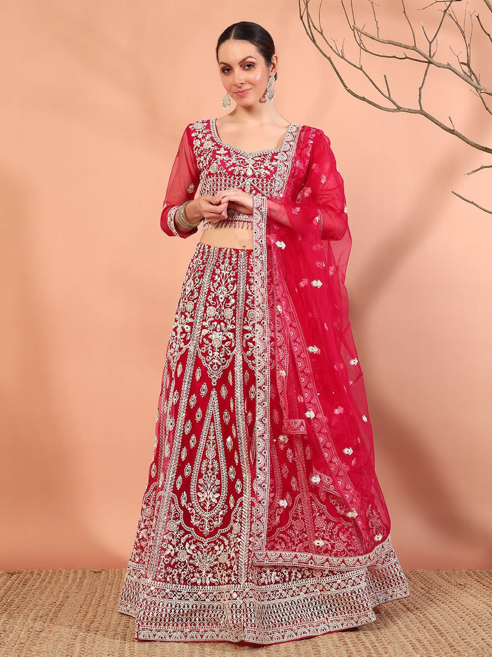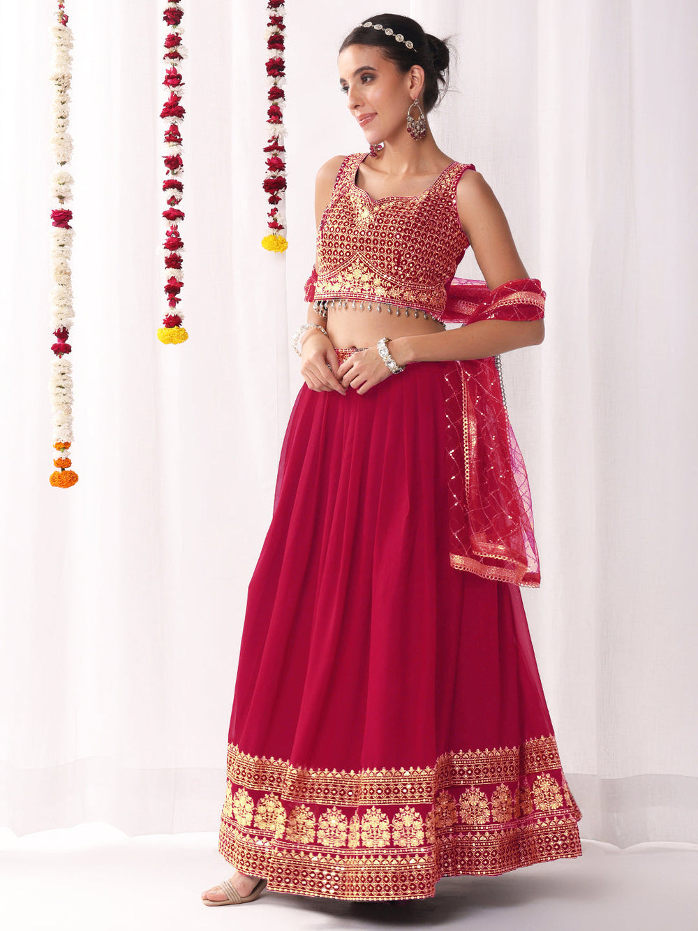 Chhabra 555 Rani Pink Sequin Embellished Crop-Top Palazzo Set with Jasmine style Cape Sleeves