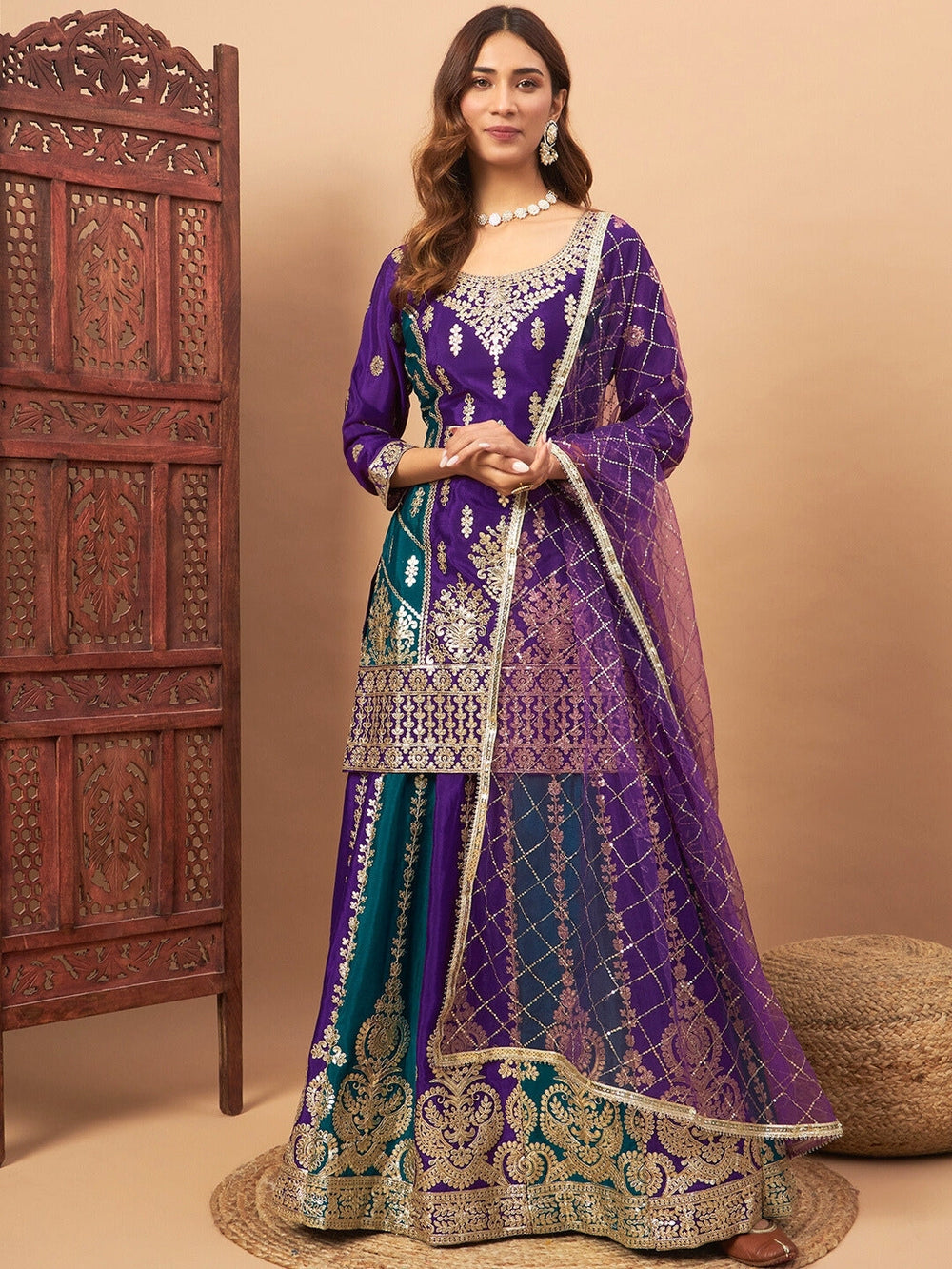Magenta Pink Embroidered Georgette Kurta Sharara Set with Heavy Thread Zari Work