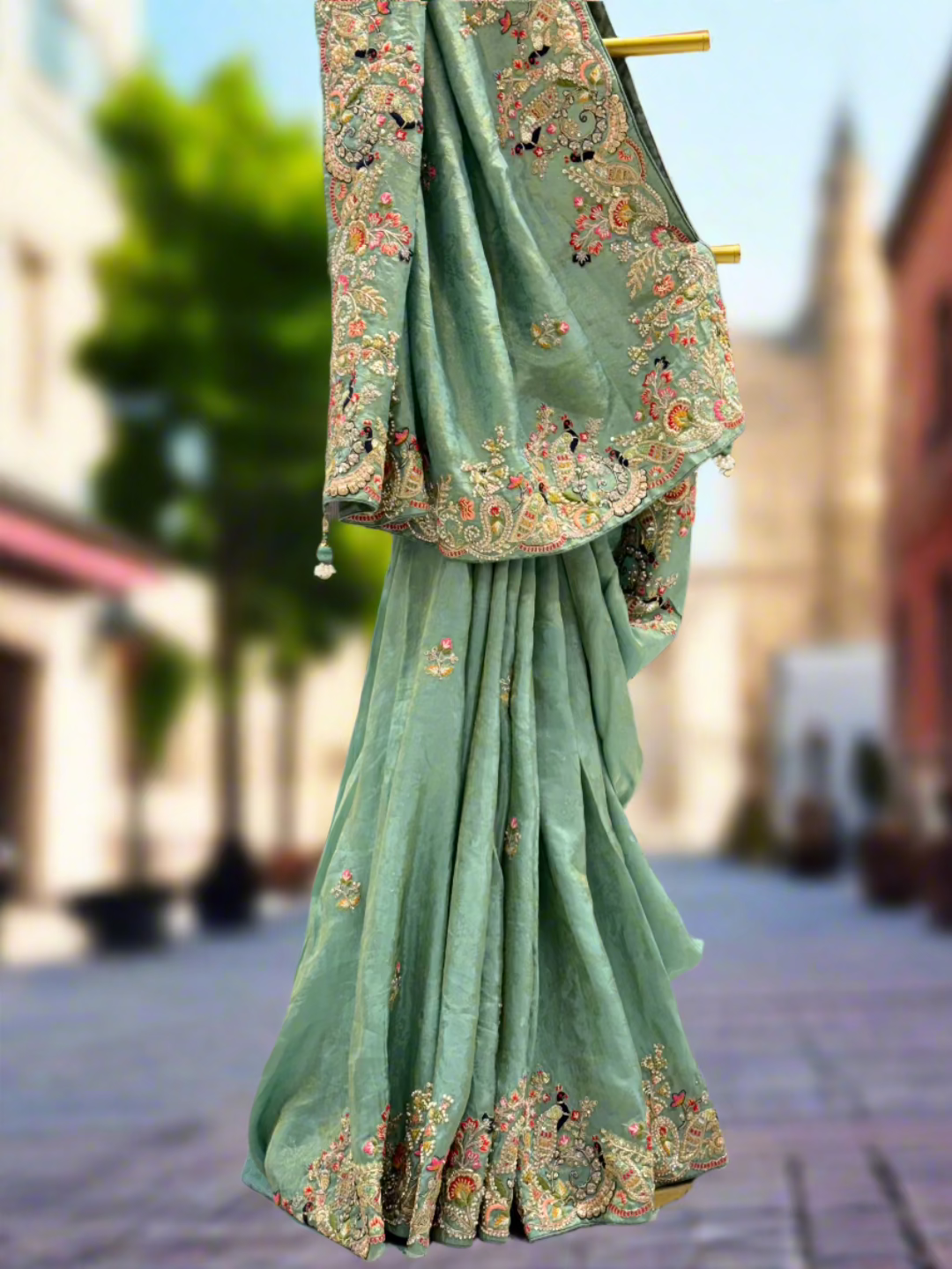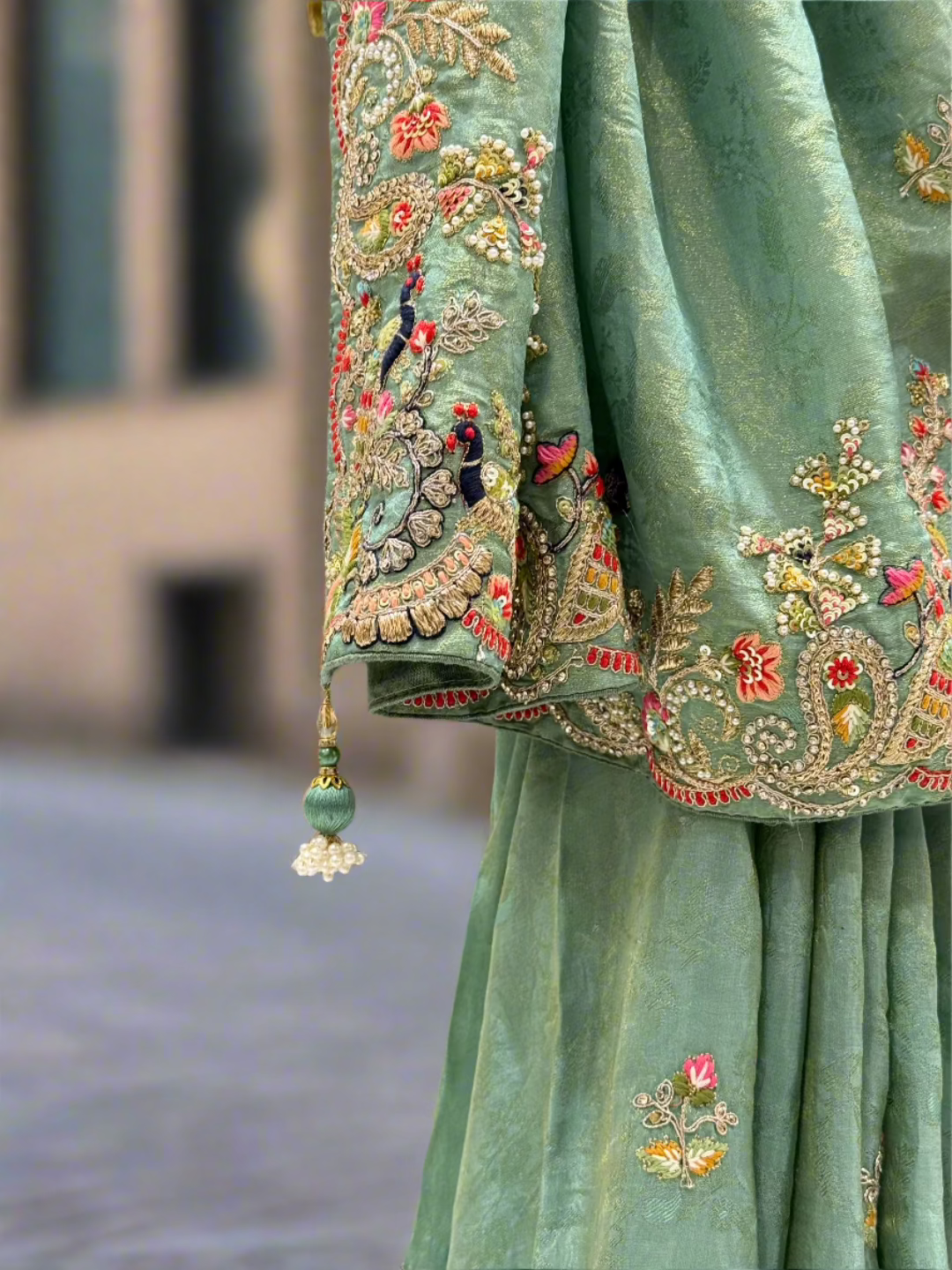 Border: Broad contrast red woven border on both sides with intricate multicolour floral and paisley detailing.