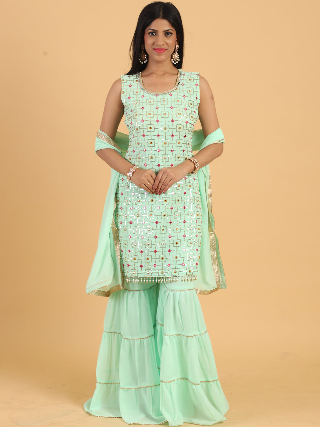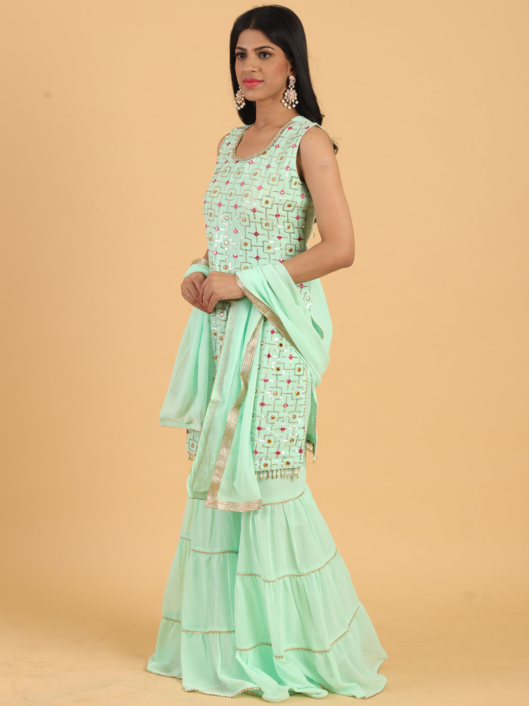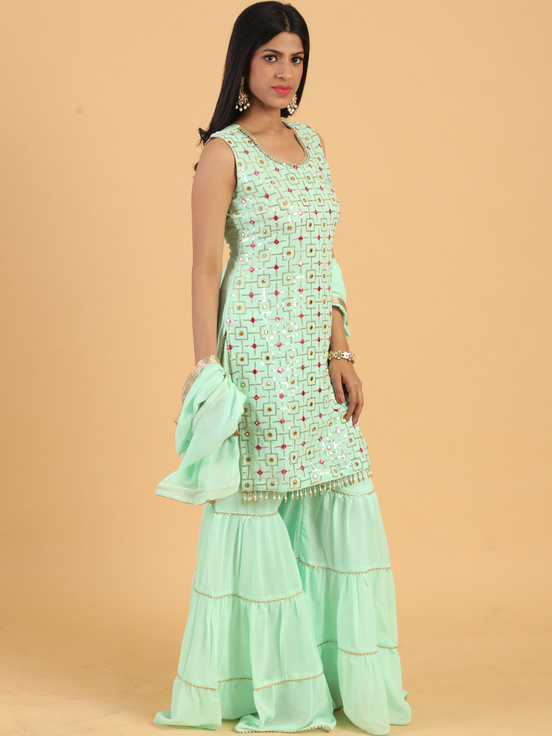 Sea Green Resham & Sequin Embellished Georgette Kurta Sharara Set