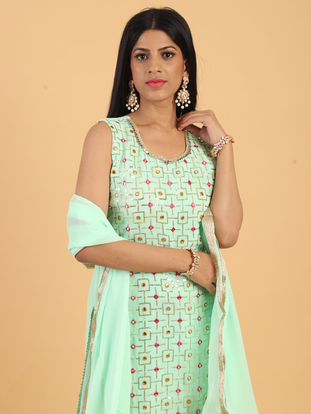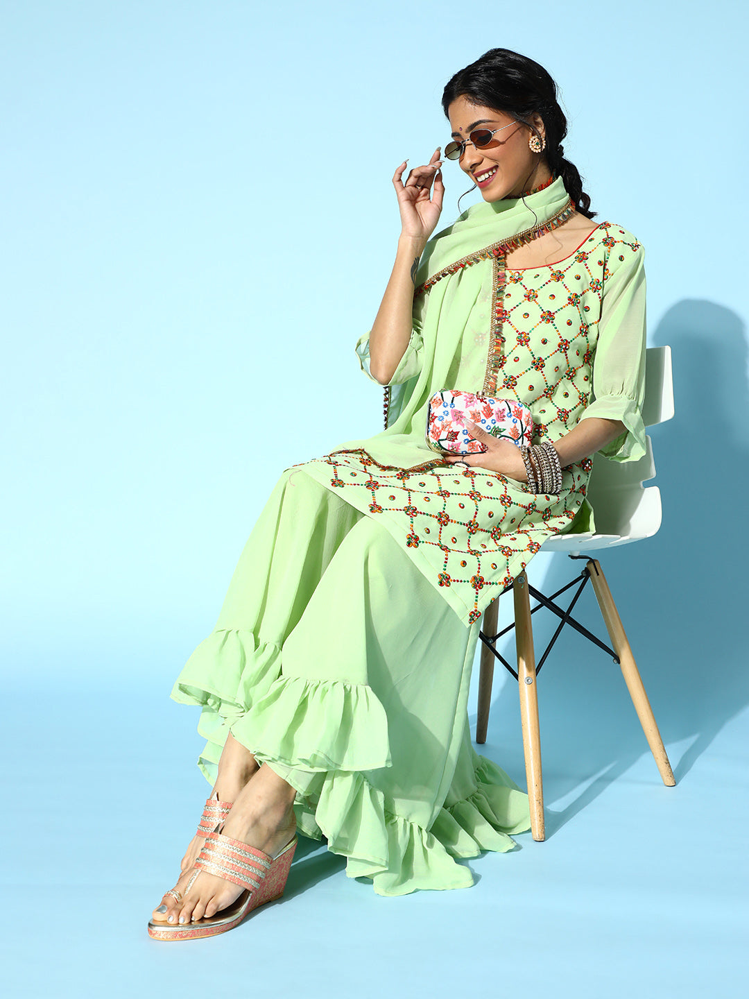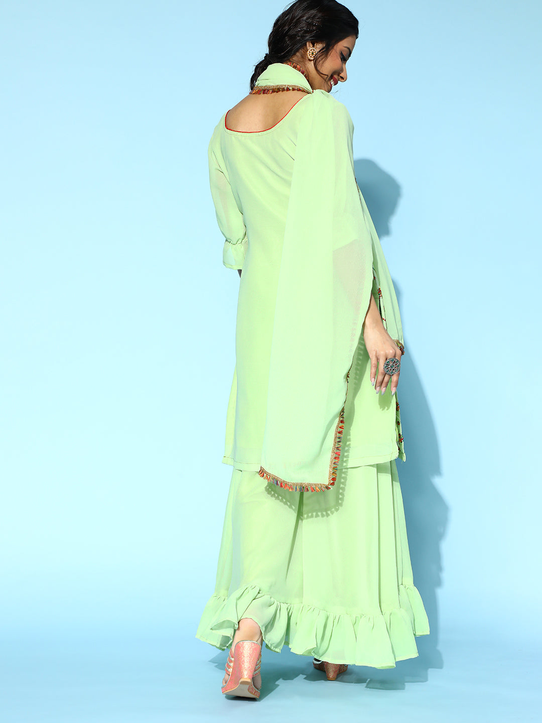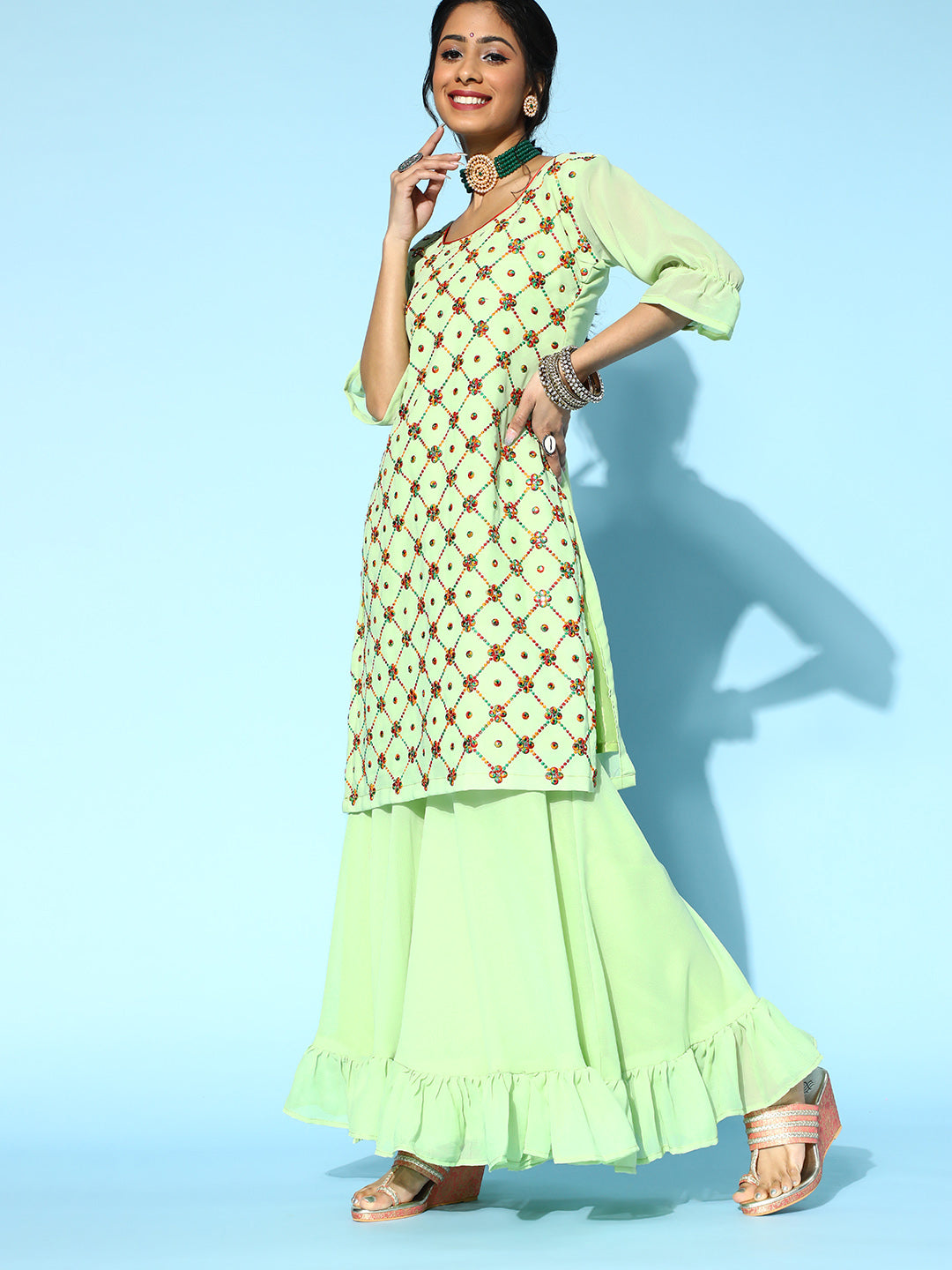 Sea Green Resham & Sequin Embellished Georgette Kurta Sharara Set