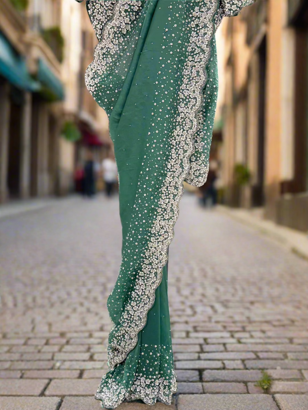 Chhabra 555 This pastel olive-green saree features closely placed zari buta in floral and paisley-inspired motifs, giving the drape a rich Banarasi brocade look while remaining lightweight and fluid.