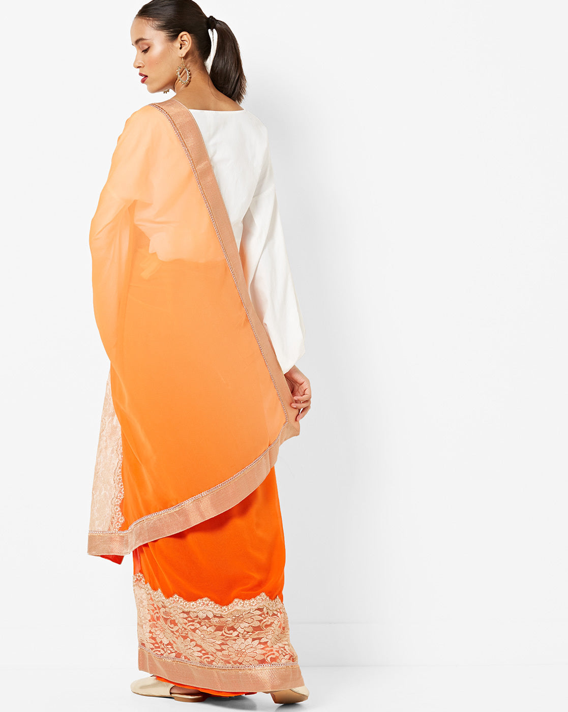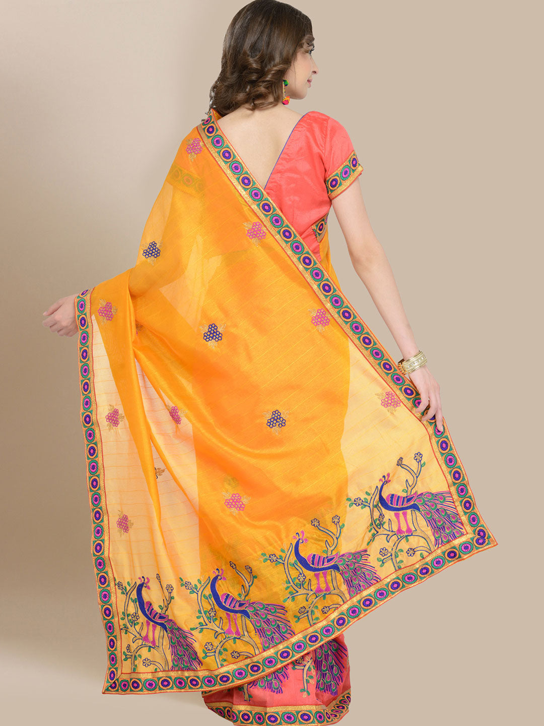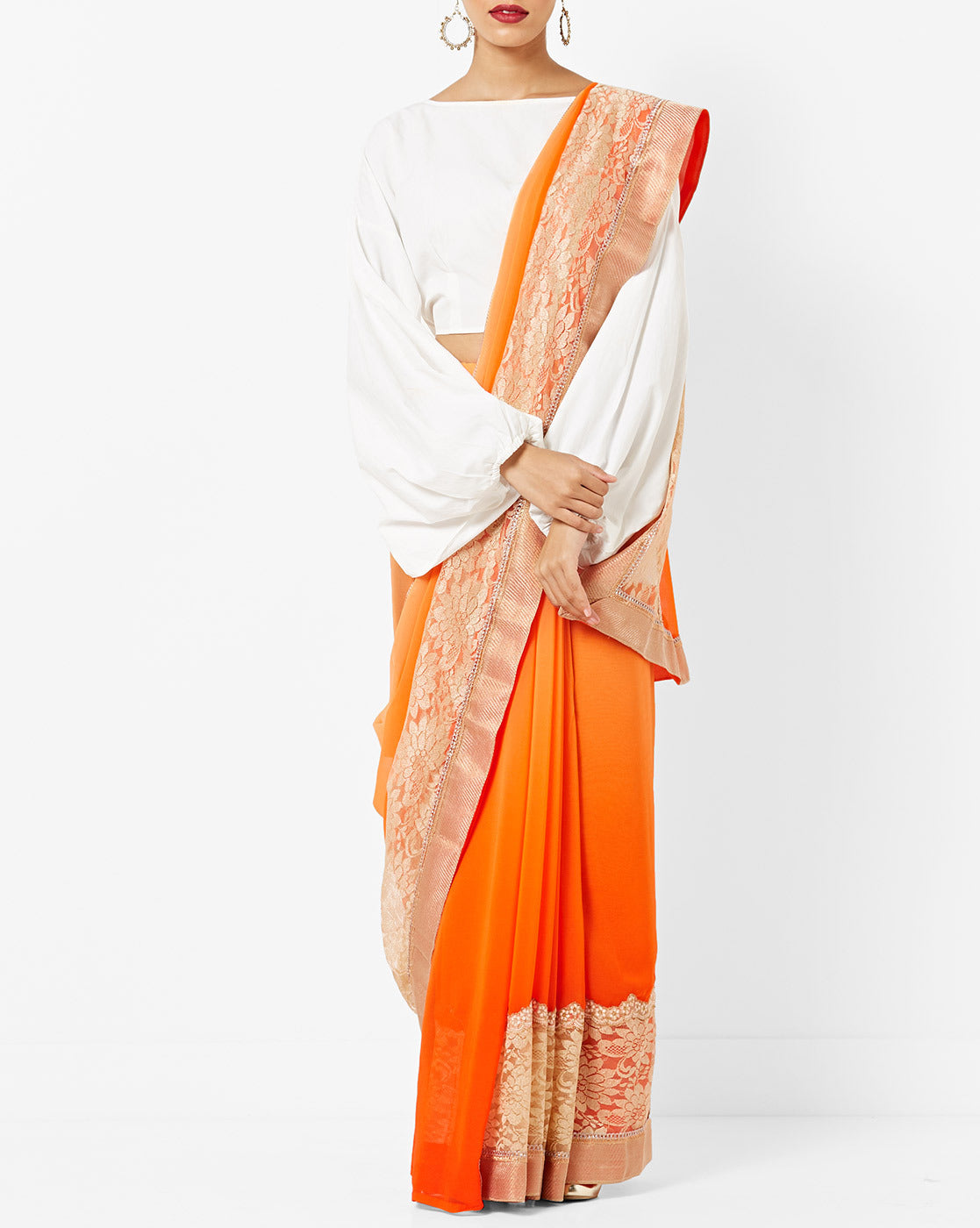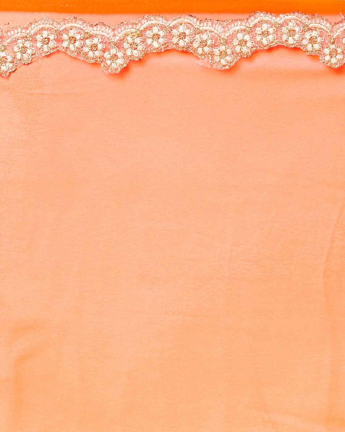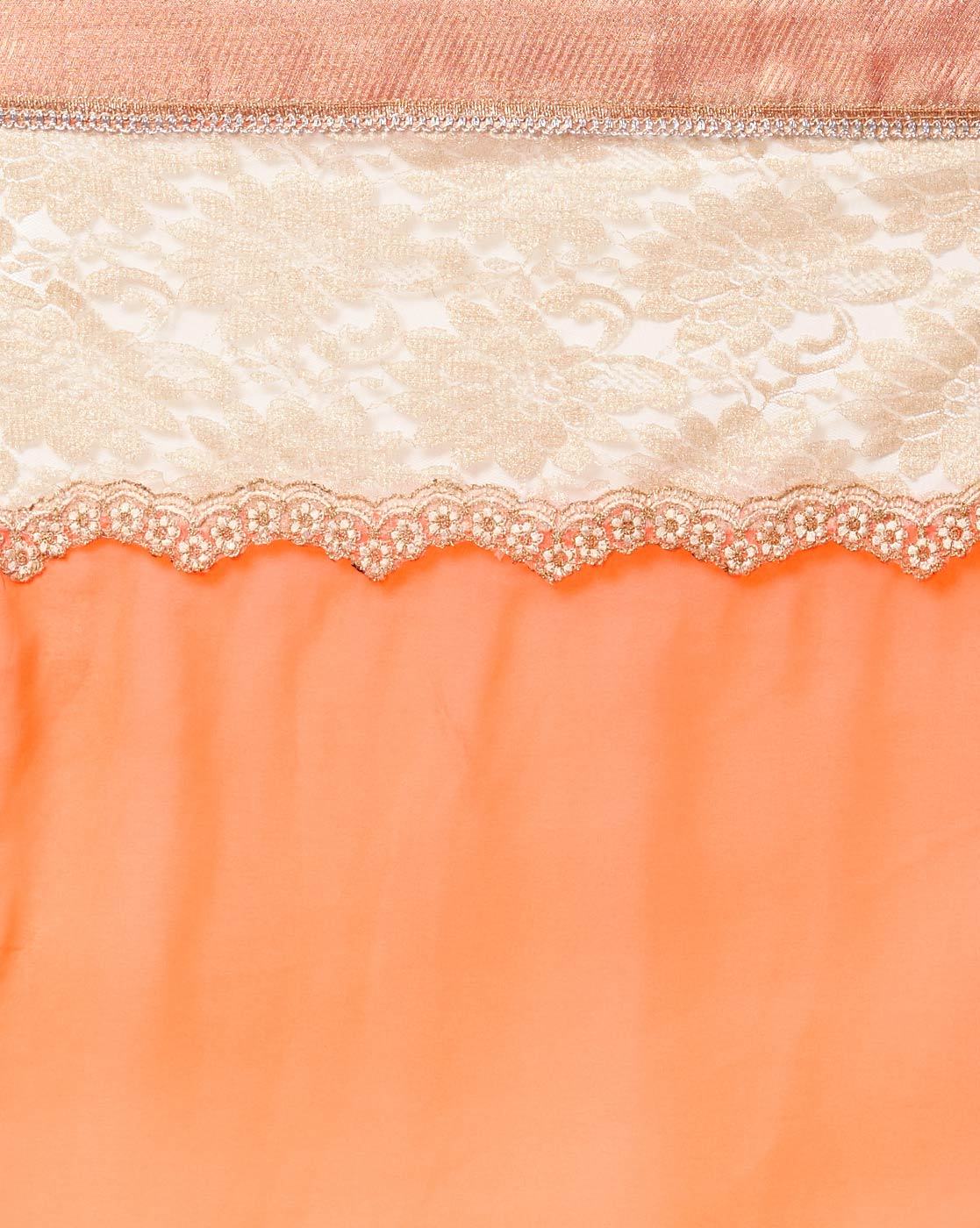 Chhabra 555 vibrant dual-tone saree gleams in shades of orange and pink, woven in a shimmer georgette base with a luminous finish. The body is plain for an elegant, contemporary feel, while the border is finely embellished with a strip of sequins and beadwork, lending subtle sparkle along the edges.