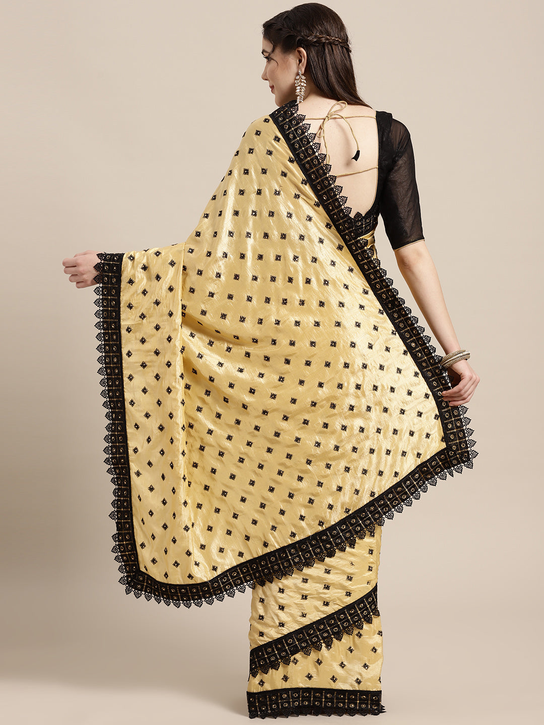 Border: Fine sequin and beadwork strip border in matching tones, edging the saree for subtle glam.