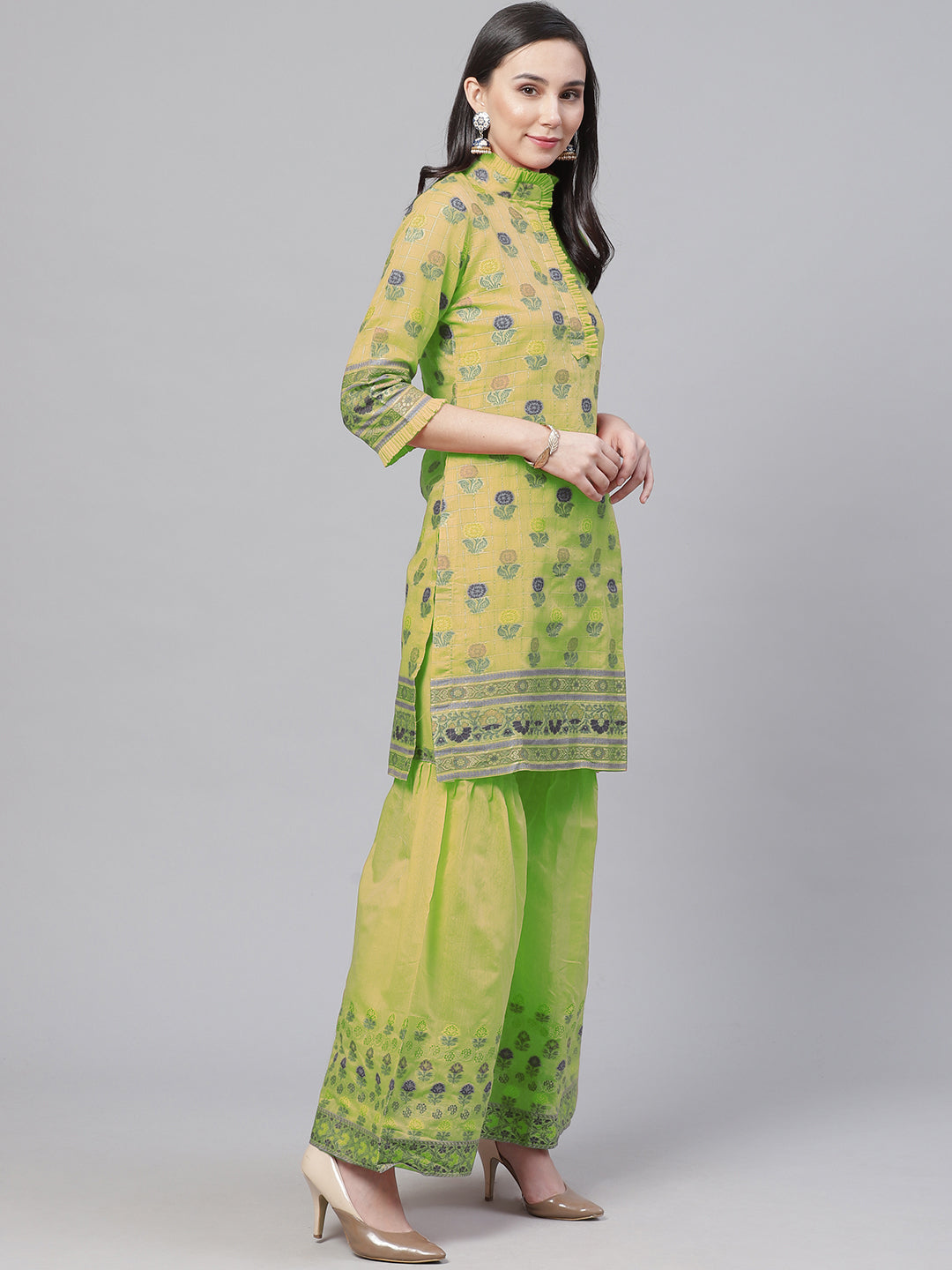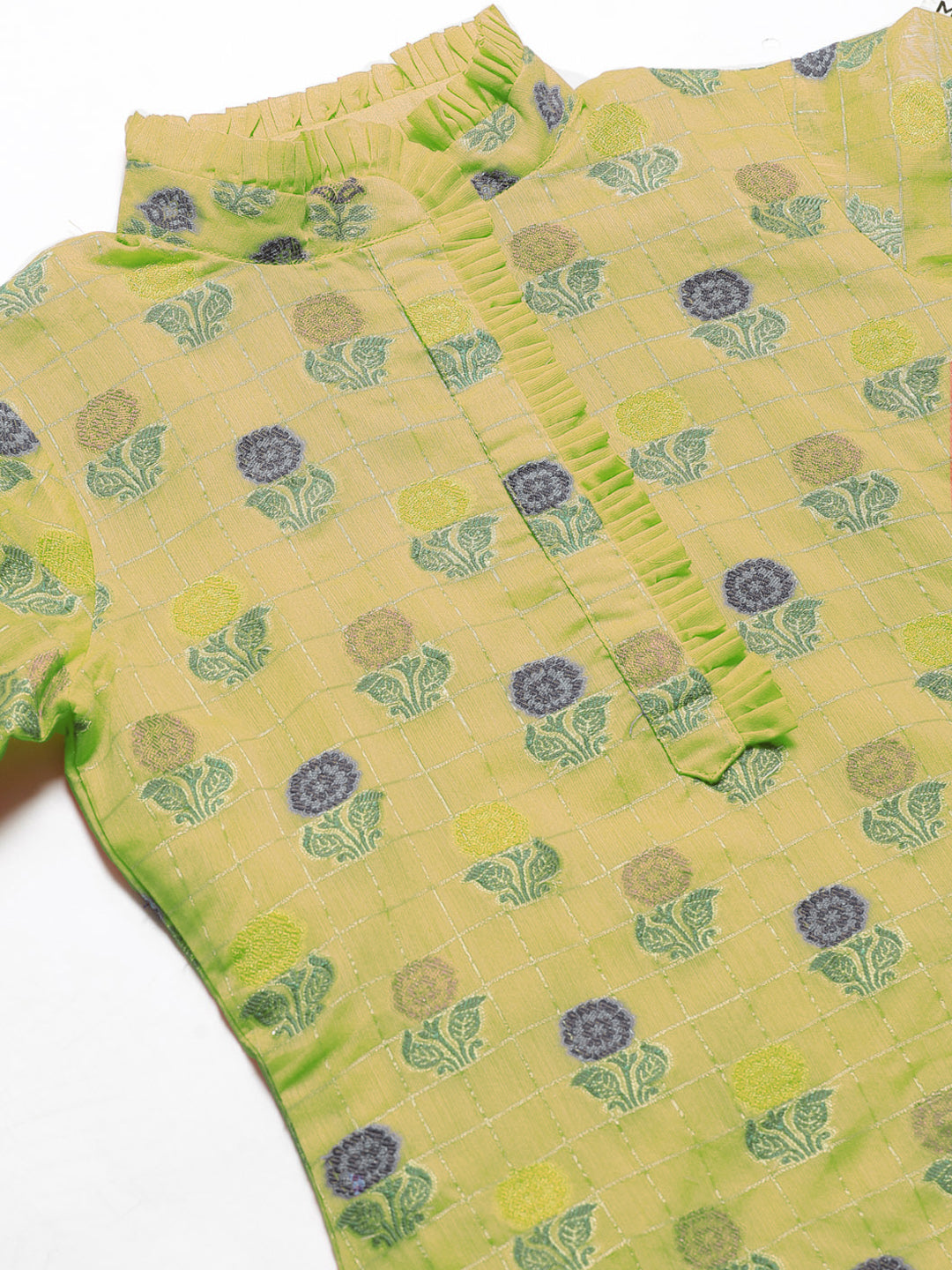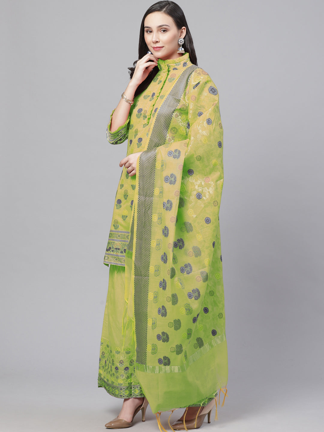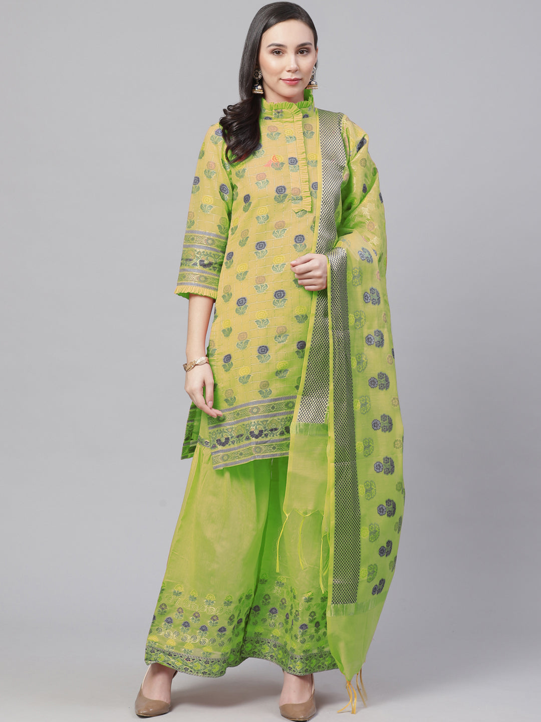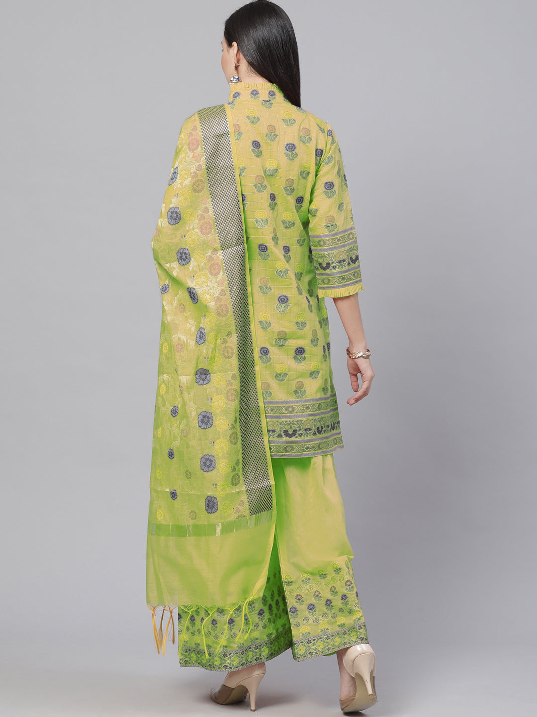 Meenakari Handloom Suit with Tropical leaf pattern, Tasseled Dupatta & Brocade Salwar