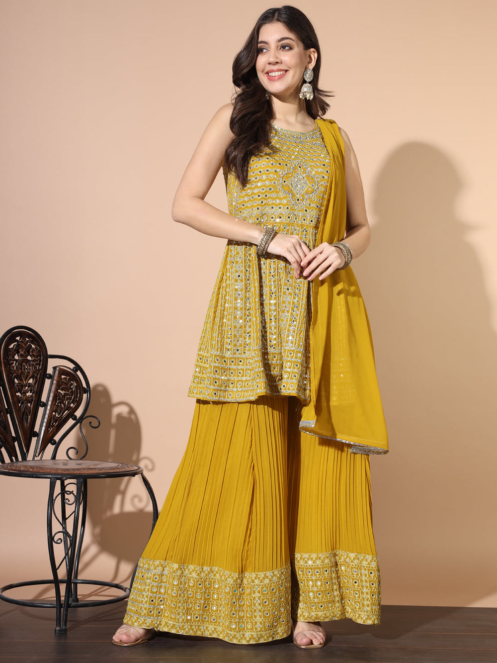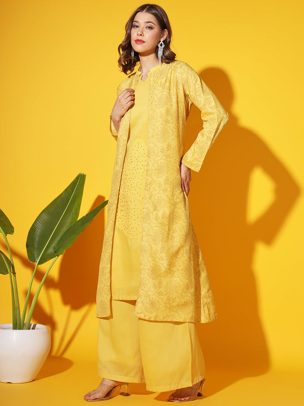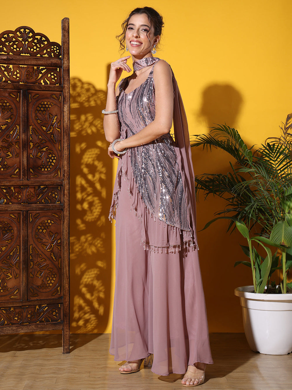 Sequinned Georgette Crop Top Palazzo Set with Shrug