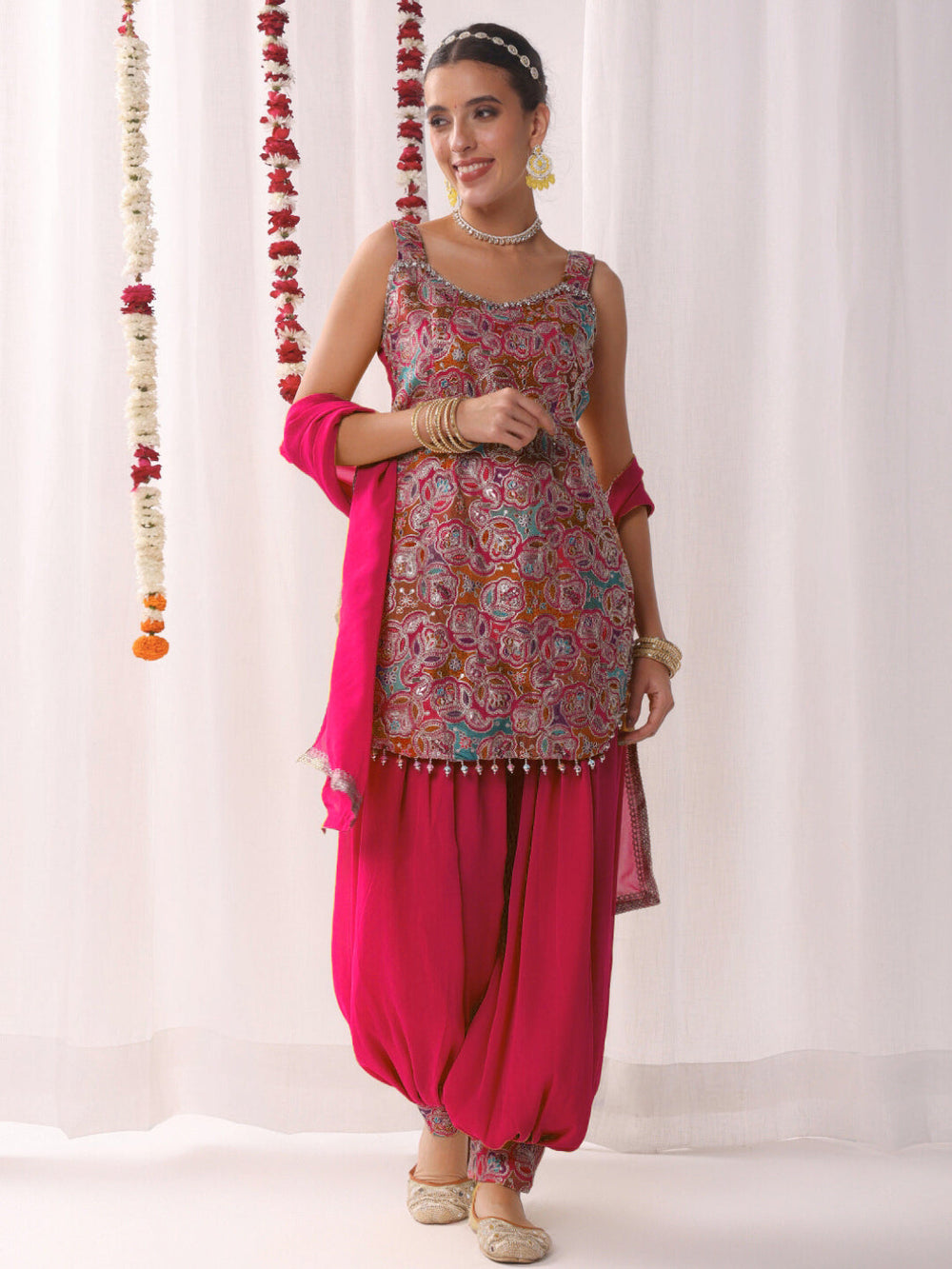Chhabra 555 Rani Pink Sequin Embellished Crop-Top Palazzo Set with Jasmine style Cape Sleeves