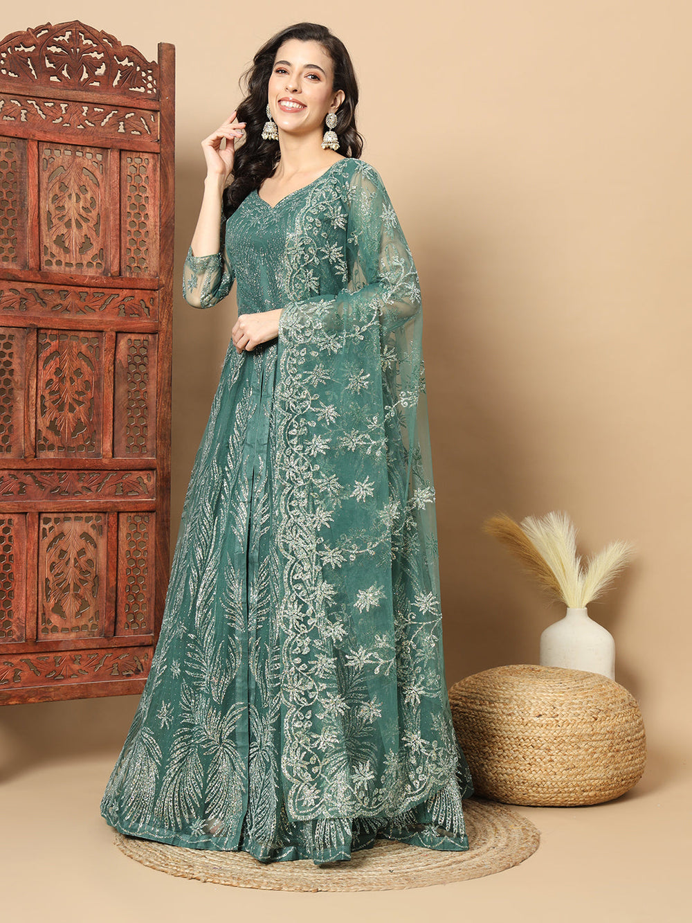 Mehndi Green Resham Embroidered Pathani Kurta Set with Afghan Salwar