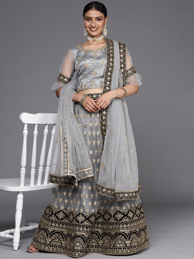 Chhabra 555 Semi-stitched Grey Gold Zari Embroidered Net Pleated LehengaSet With Black Velvet Border