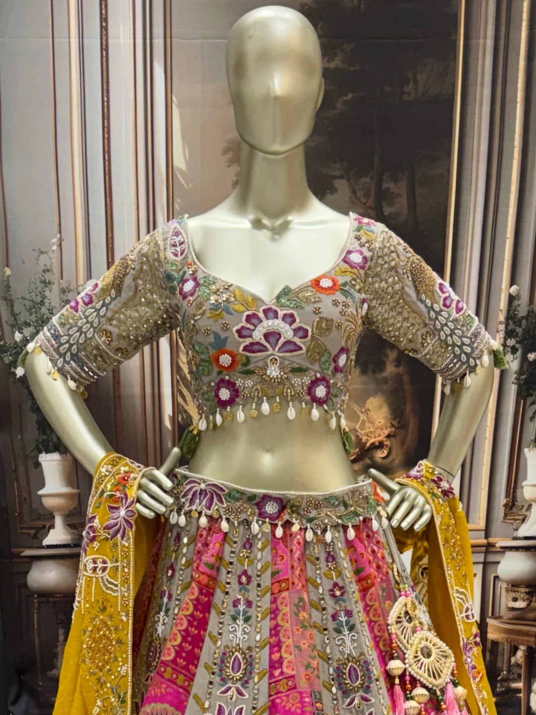From intricately embroidered zari lehengas to contemporary mirror work and sequin lehenga sets, each piece is crafted in luxurious fabrics like silk, velvet, georgette, net, and organza. Whether you're looking for a bridal lehenga choli, a ready-to-wear lehenga for festive occasions, or a trendy Indo-western lehenga, we have something for every style and silhouette.