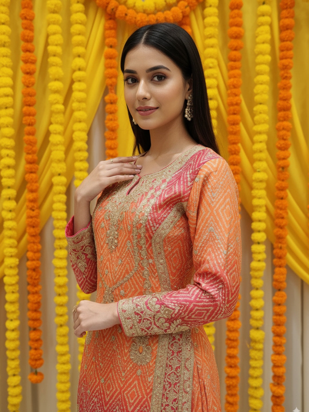 Crafted in breathable fabrics like georgette, chiffon, and cotton, these Mehendi function dresses feature mirror work, floral prints, gota patti, and playful tassels for the perfect festive vibe. Whether you're the bride, bridesmaid, or guest, find the ideal Mehendi outfit that lets you dance, pose, and enjoy rituals in style.
