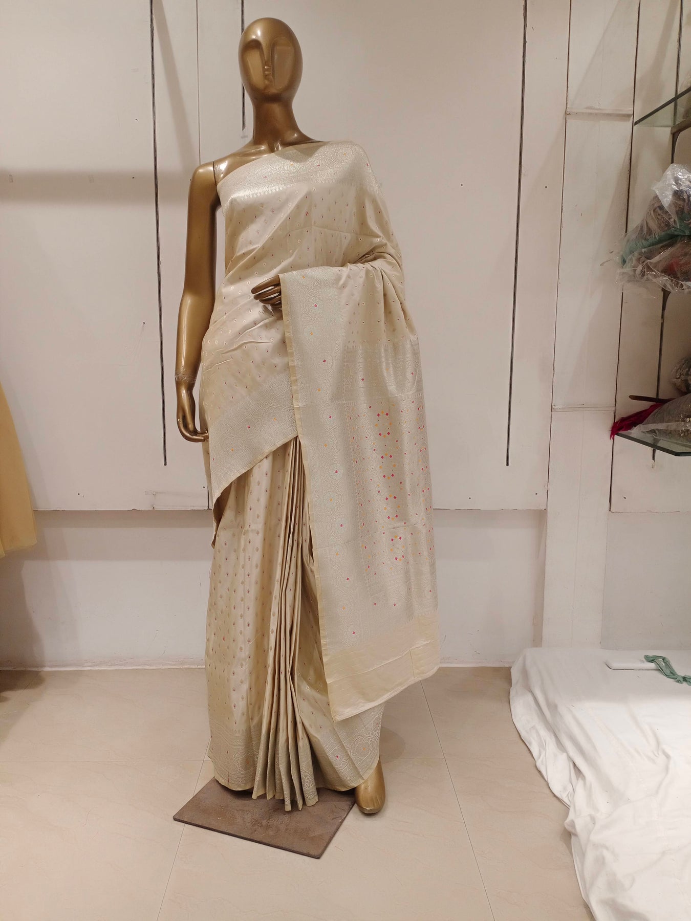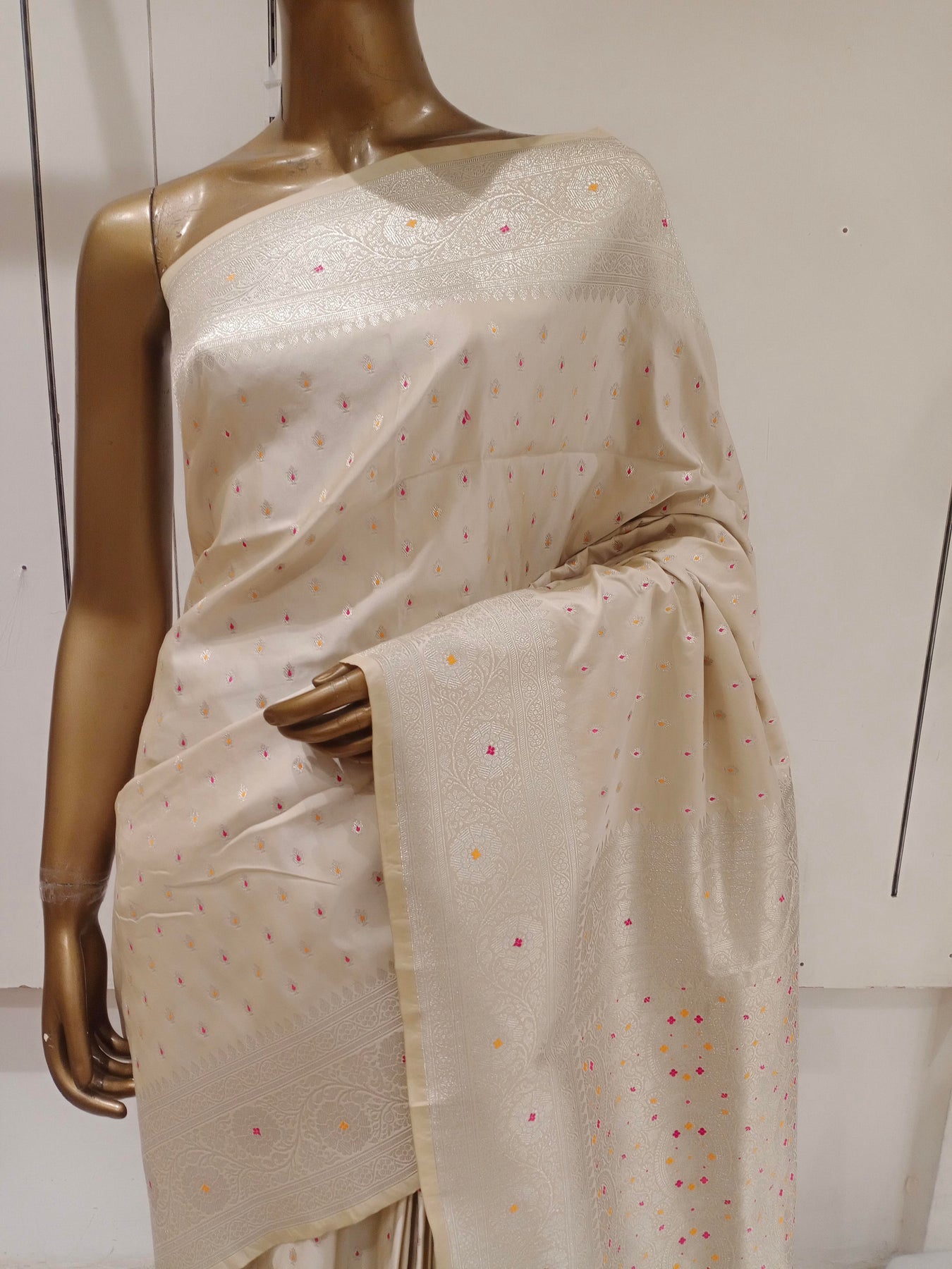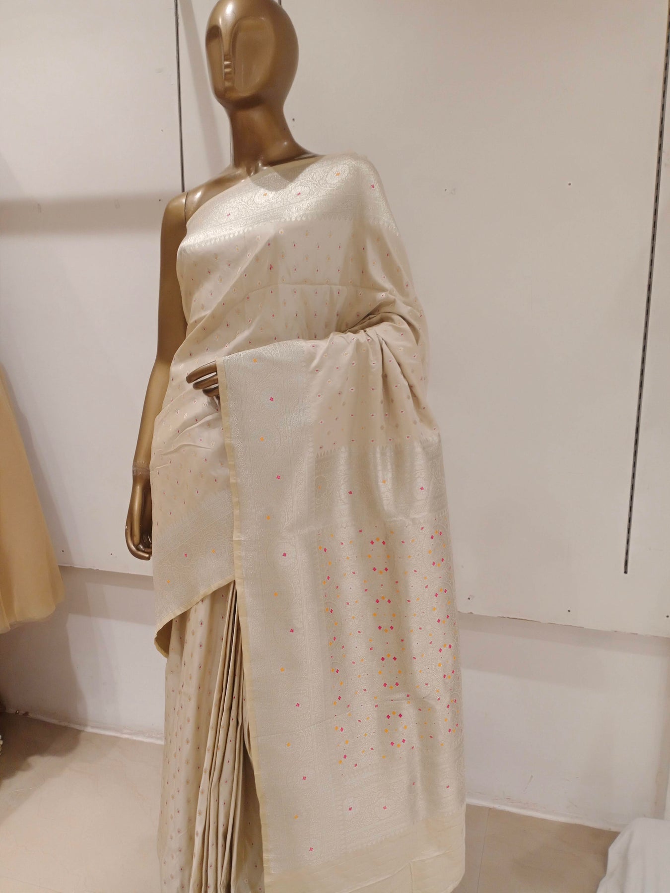 Chhabra 555 Cream Resham & Zari Embroidered Woven Embellished Silk Blend Saree