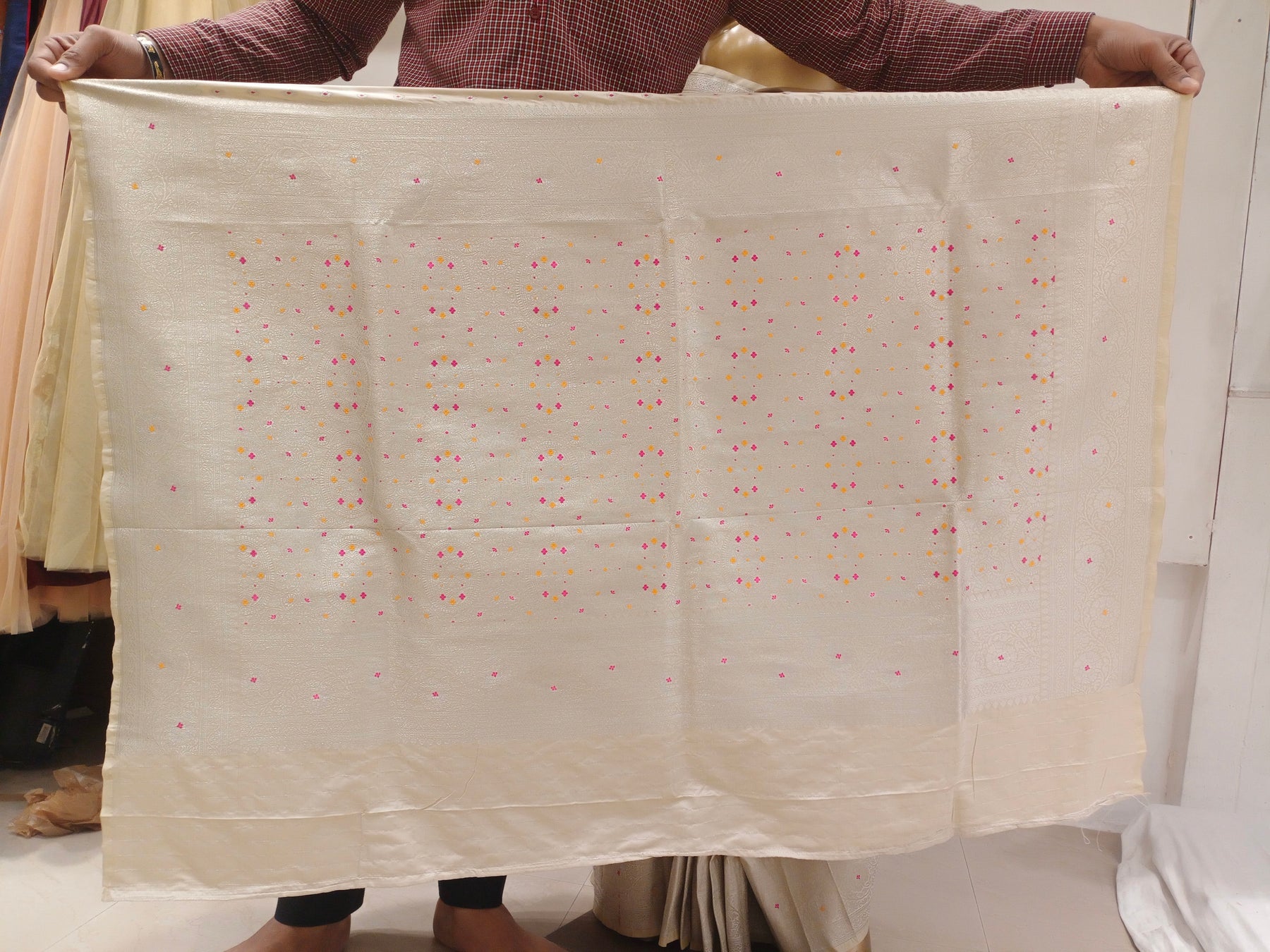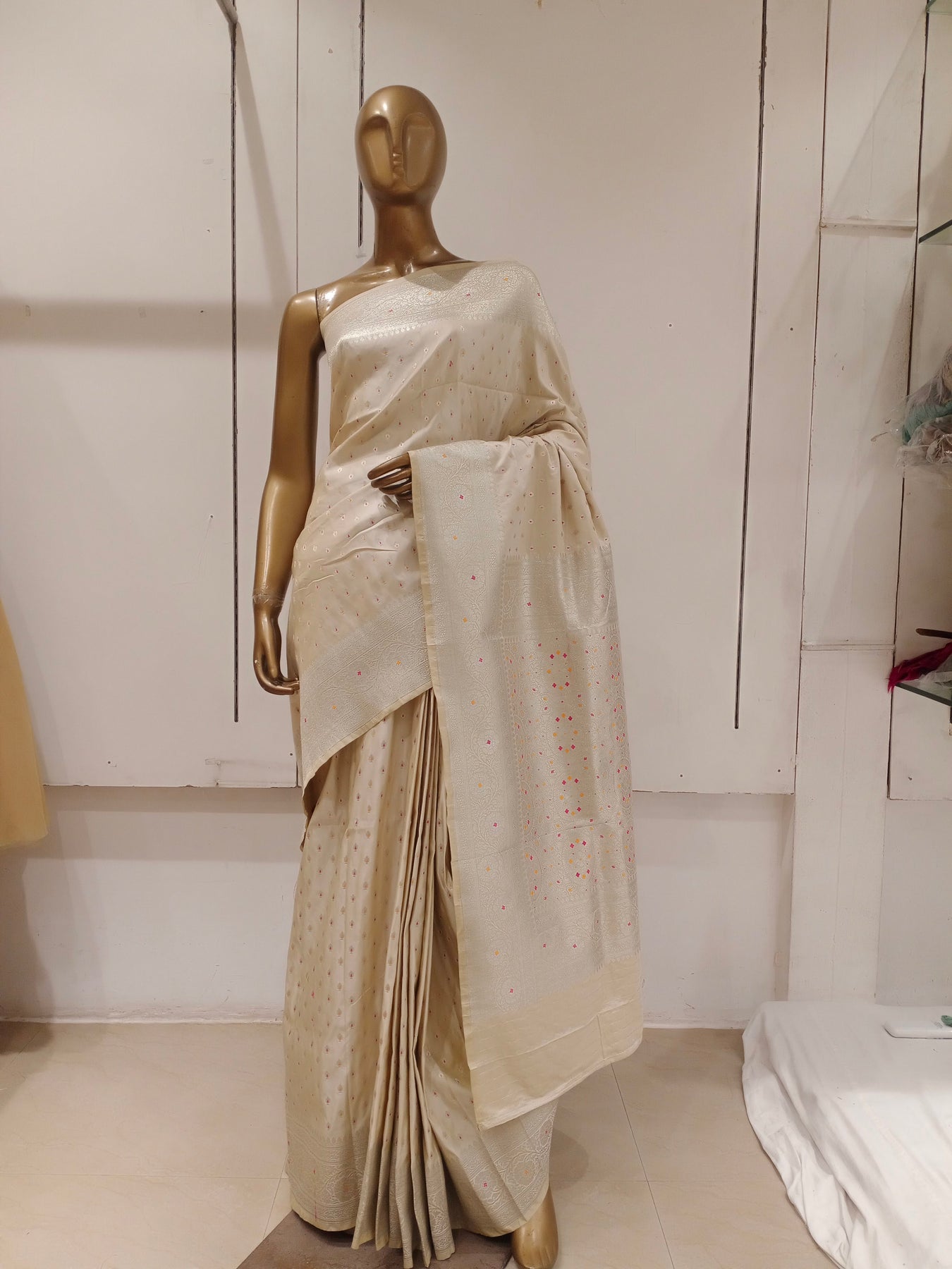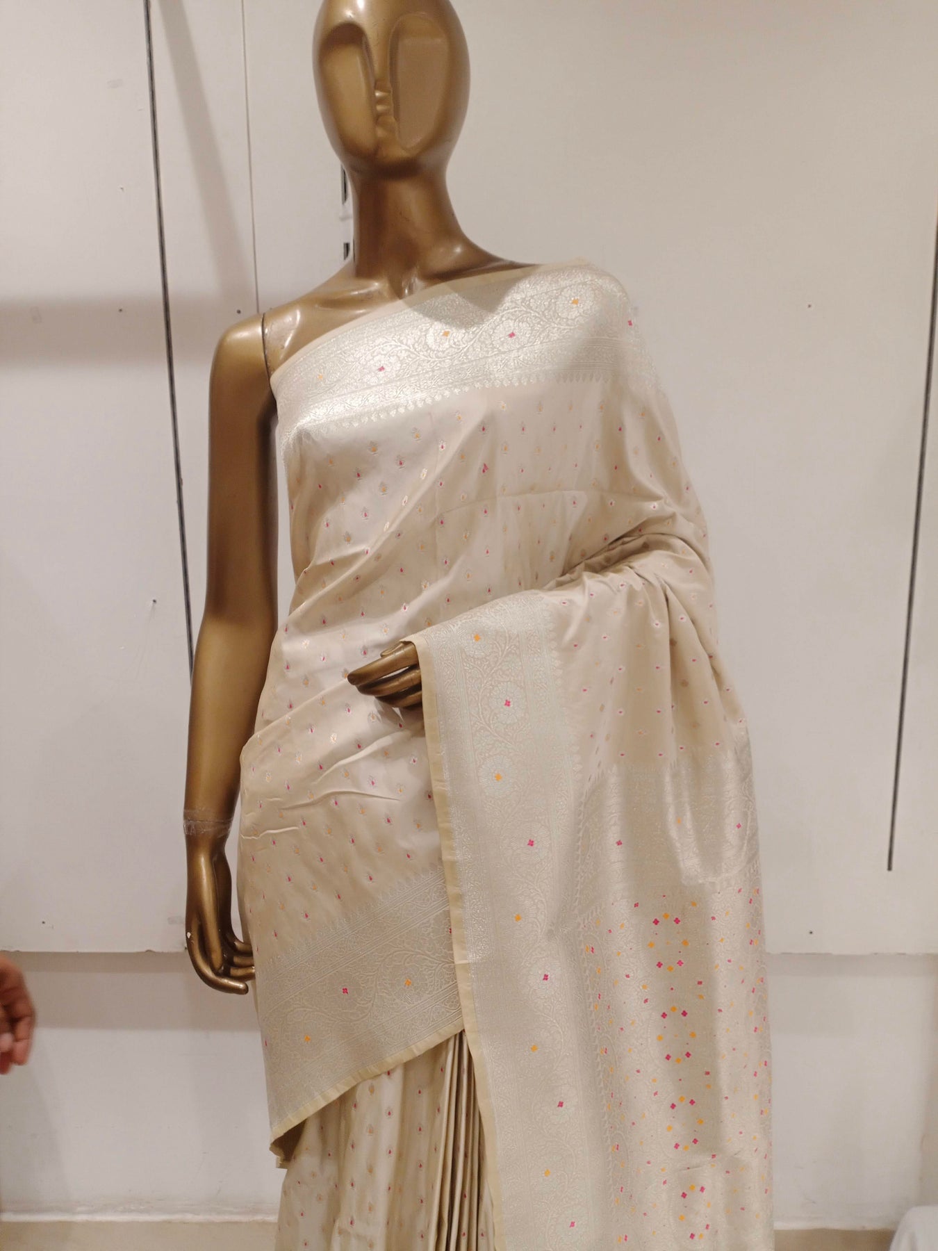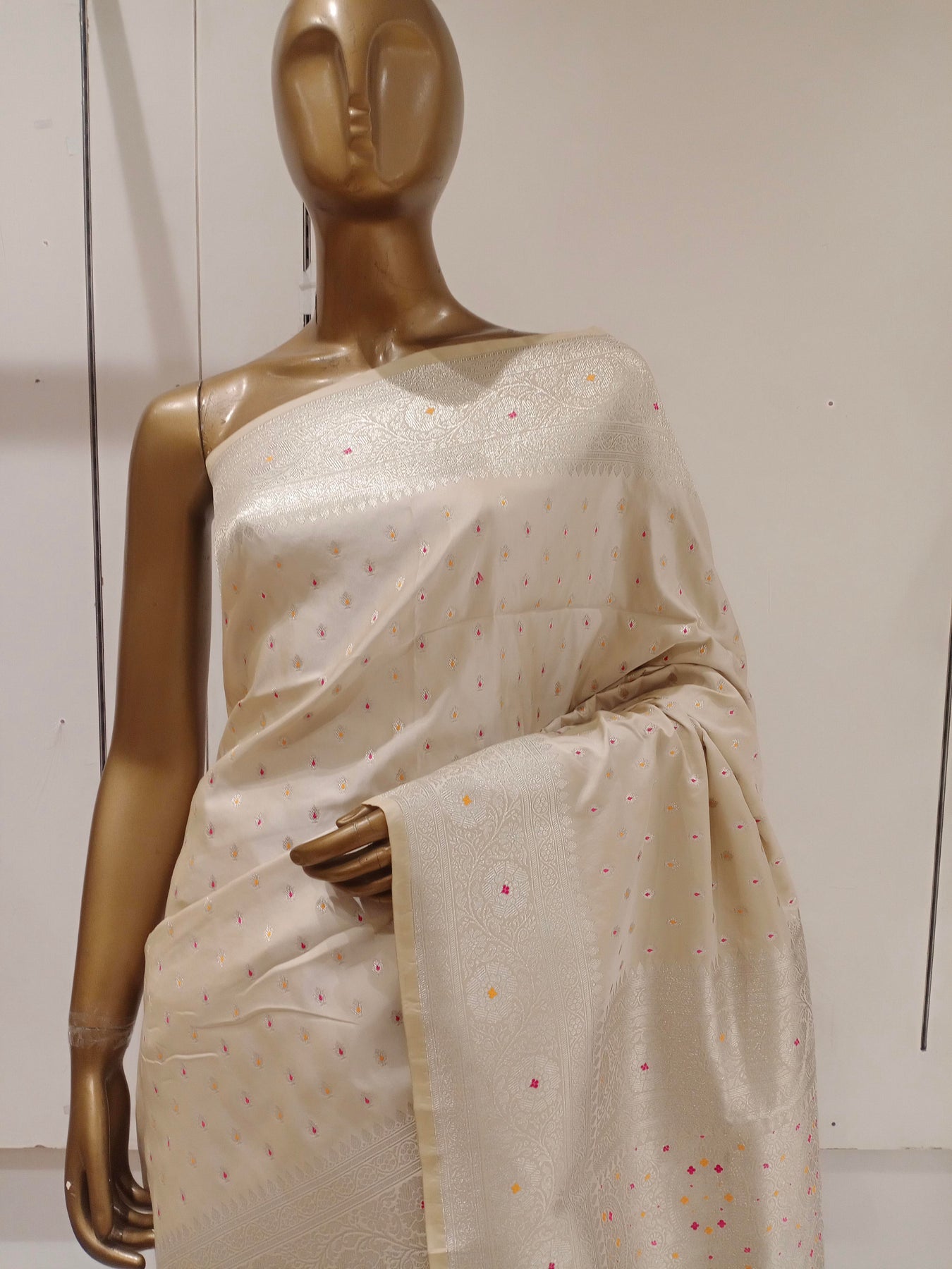 Chhabra 555 Cream Resham & Zari Embroidered Woven Embellished Silk Blend Saree