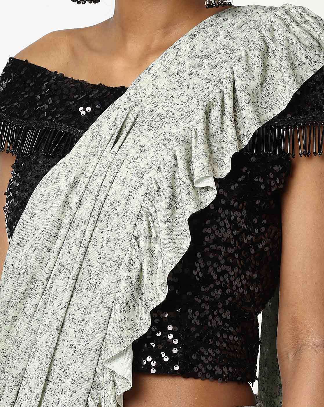 Made to Measure Dusty Green Ruffled Self Embossed Saree & Black Sequence Off Shoulder Embellished Blouse