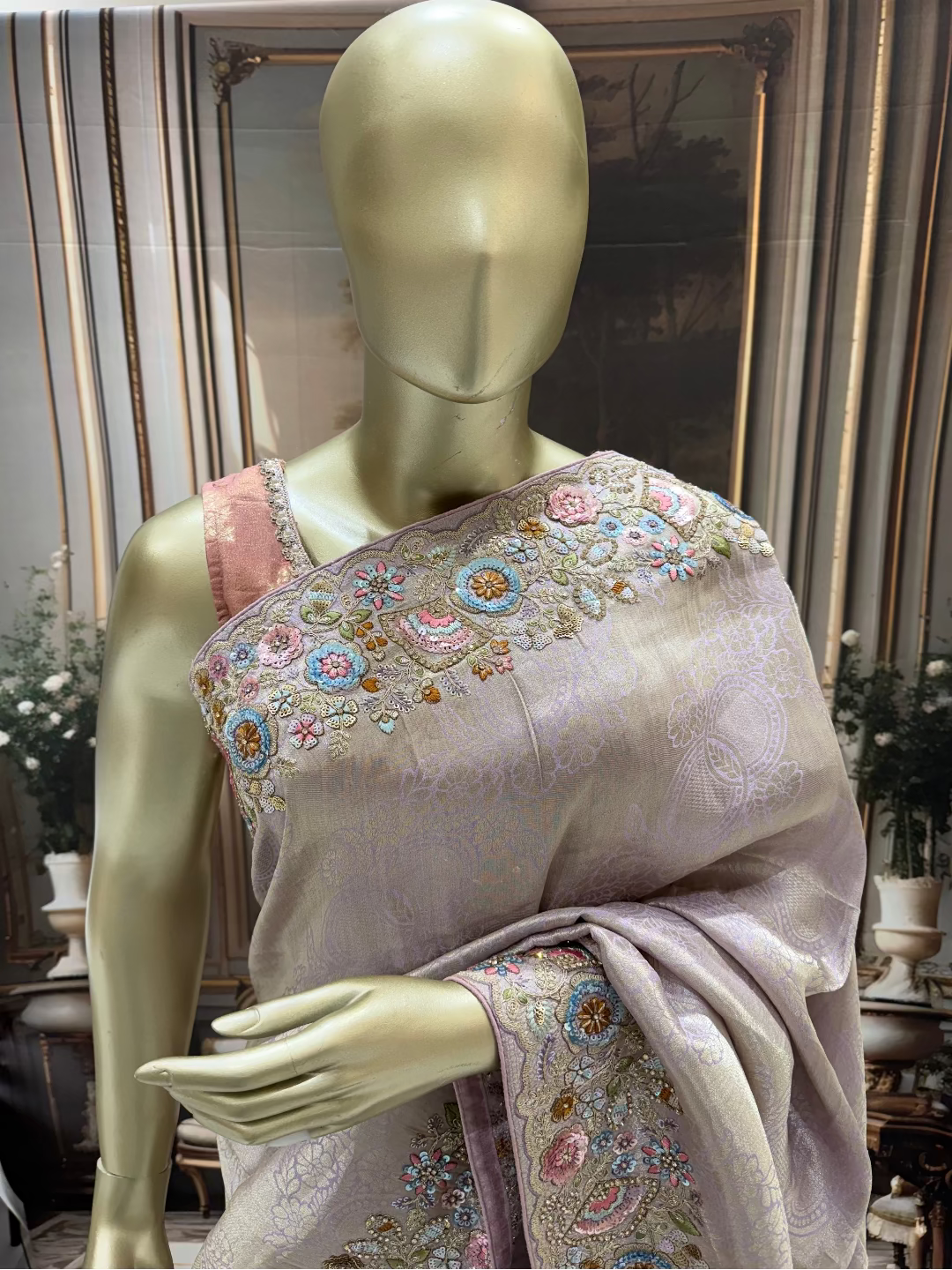 Elevate your ethnic wardrobe with this stunning blush pink designer saree, a perfect blend of tradition and contemporary elegance. Adorned with intricate embroidery featuring delicate animal and floral motifs, this saree showcases masterful craftsmanship that captures attention at every glance. The soft blush pink hue complements all skin tones, making it an ideal choice for weddings, festivals, and special occasions. The carefully placed embroidered details—from graceful fauna to blooming florals—add depth and sophistication to the fabric, creating a piece that tells a story.