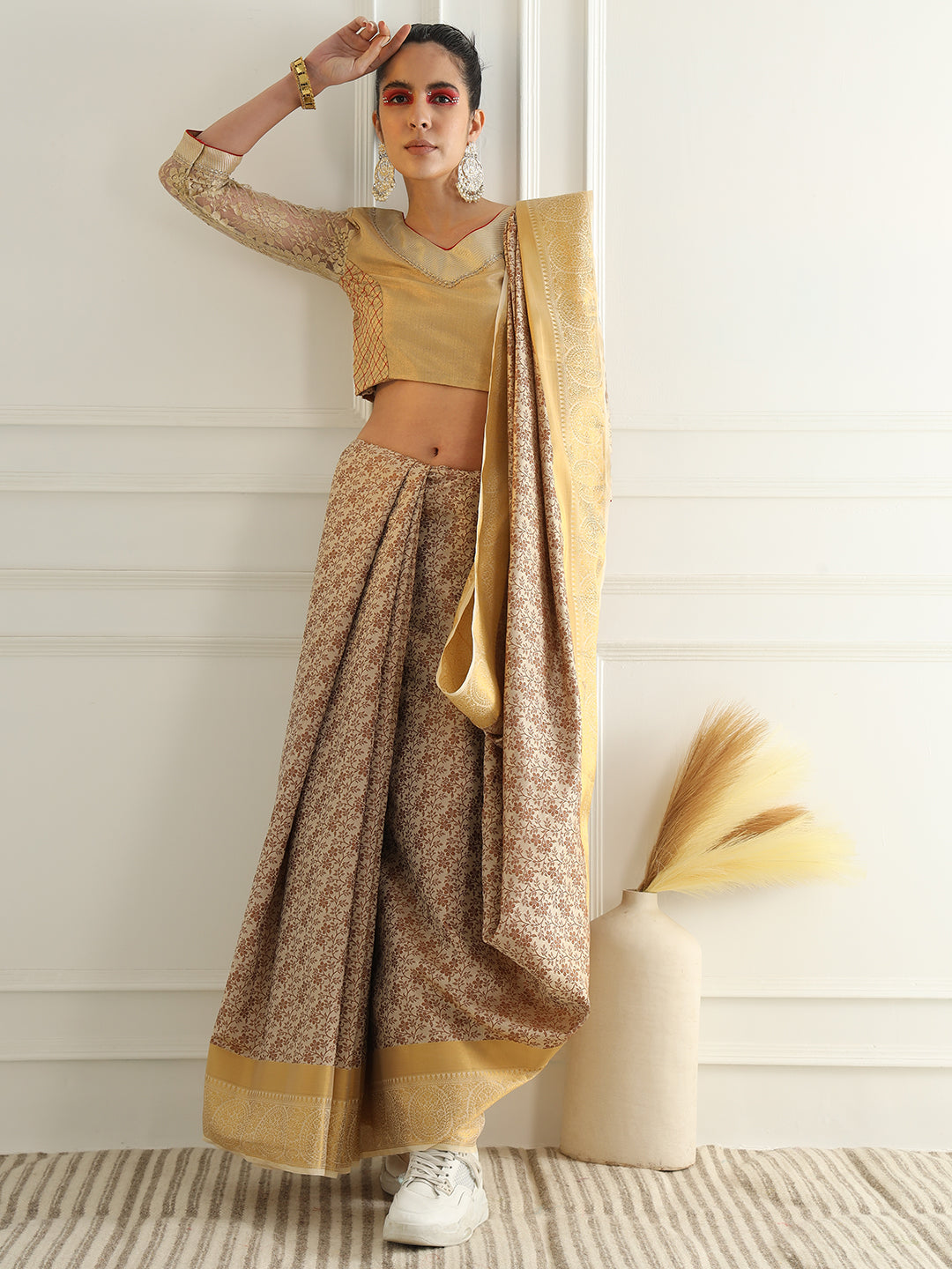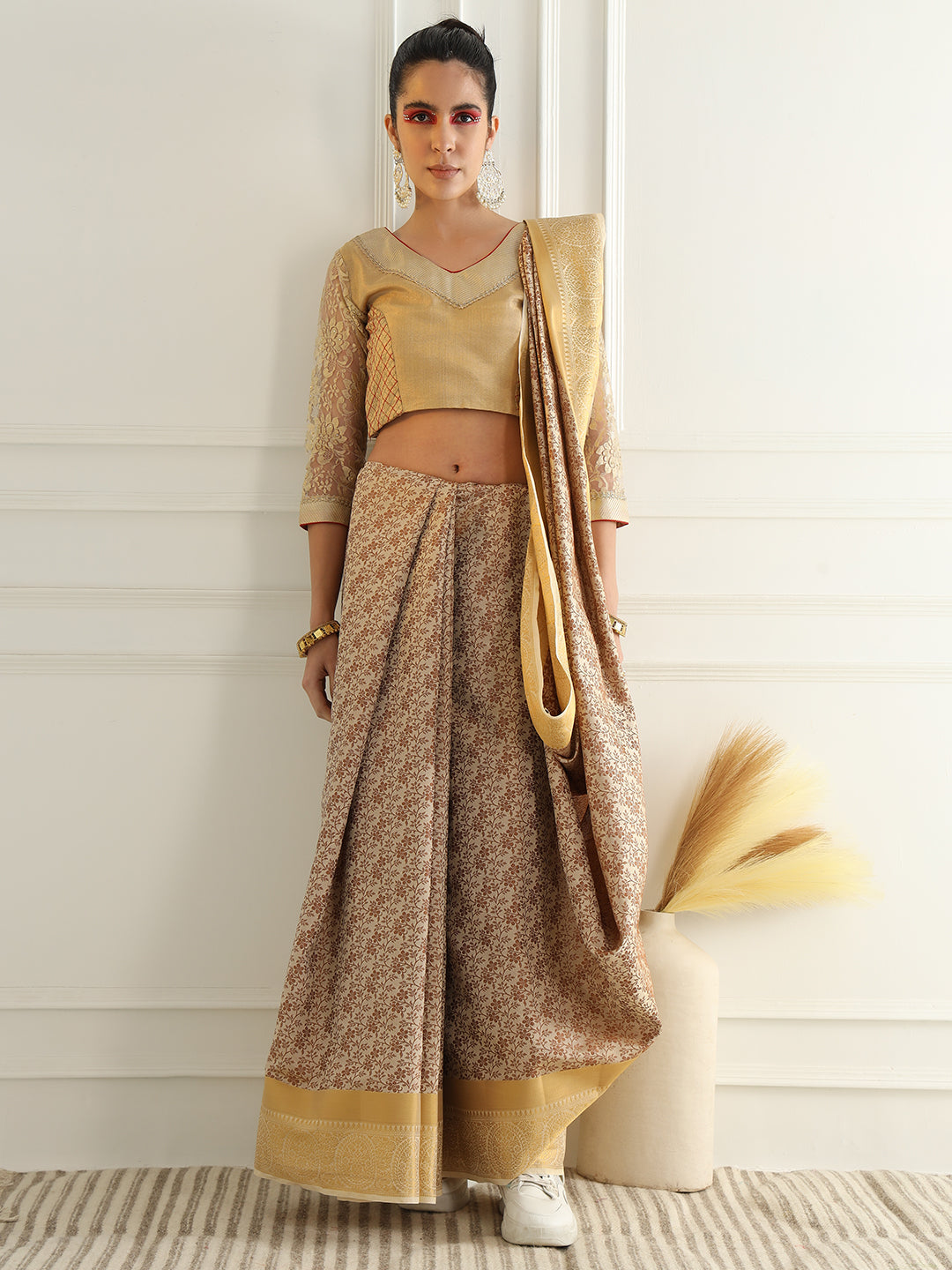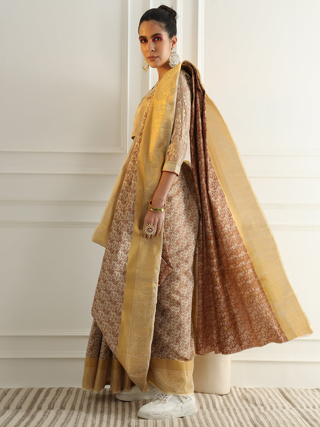Beige Floral Jaal Pattern Khadi Silk Beautiful Traditional Saree