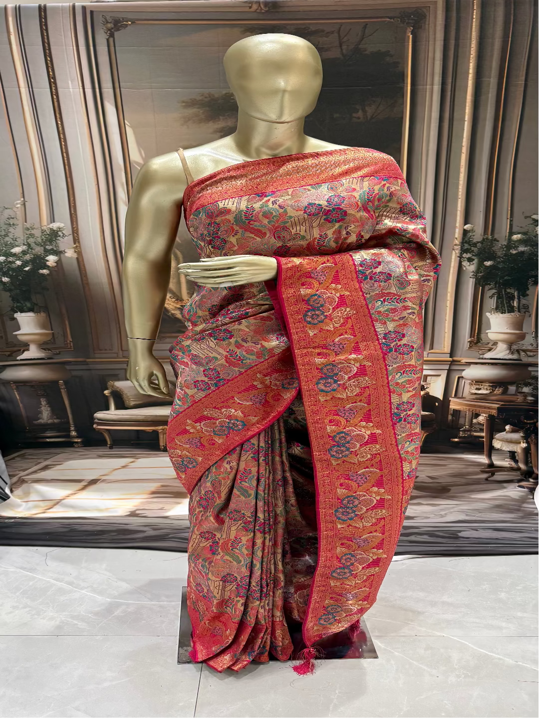 Embrace timeless elegance with this Traditional Red Banarasi Floral Zari Woven Saree. Crafted with meticulous attention to detail, this saree features intricate floral patterns adorned with lustrous zari work that catches light beautifully. The rich red hue symbolizes grace and celebration, making it perfect for weddings, festivals, and special occasions.