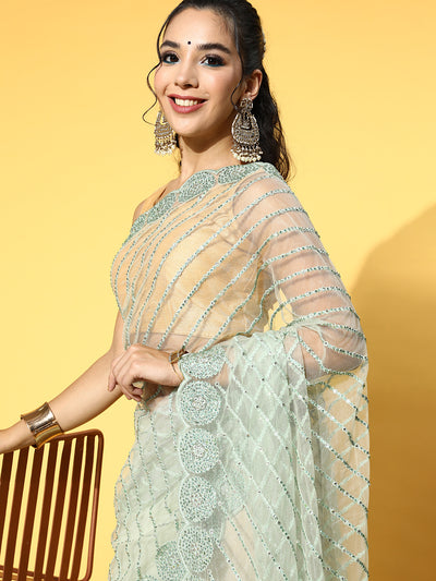 Pastel Green Embroidered & Stone Embellished Cut-Work Scalloped Saree