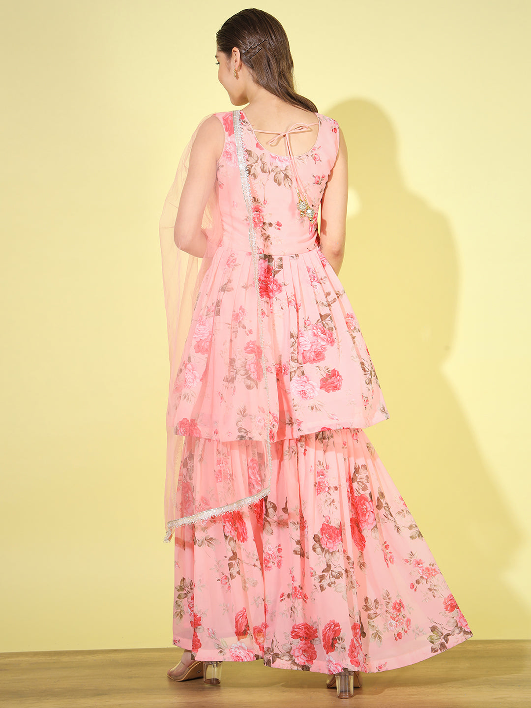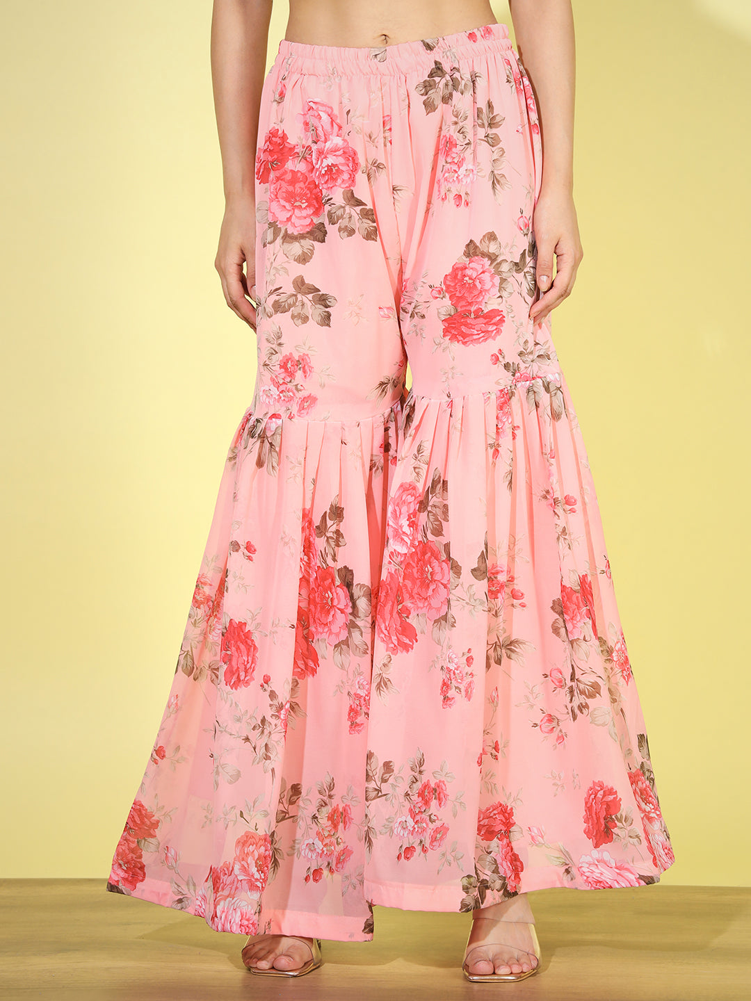 Chhabra 555 mauve-pink Gharara set features a straight georgette kurta with heavy zari and resham thread work, sequin detailing, and pearl accents. The richly embroidered kurta showcases floral and architectural patterns on the front and sleeves, with a coordinating embellished dupatta in soft tissue georgette and a flared Gharara displaying refined all-over floral motifs and an ornate embroidered hem.