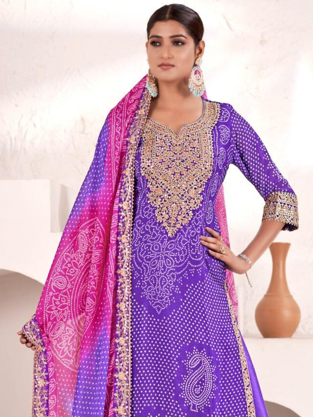 Chhabra 555 mauve-pink Gharara set features a straight georgette kurta with heavy zari and resham thread work, sequin detailing, and pearl accents. The richly embroidered kurta showcases floral and architectural patterns on the front and sleeves, with a coordinating embellished dupatta in soft tissue georgette and a flared Gharara displaying refined all-over floral motifs and an ornate embroidered hem.